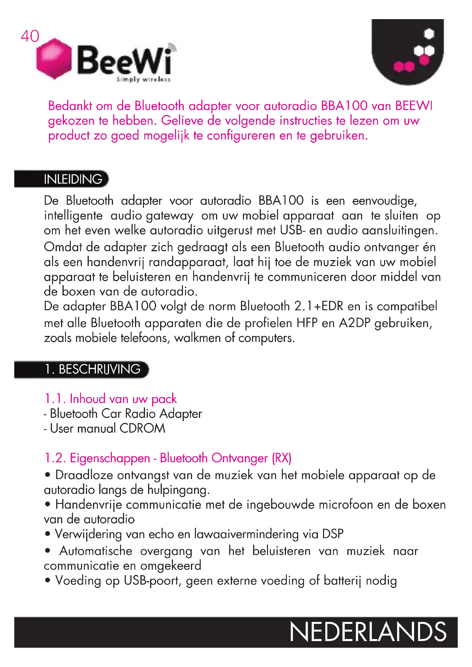 - Voeding op USB-poort, geen externe voeding of batterij nodig INLEIDING Bedankt om de Bluetooth adapter voor autoradio BBA100 van BEEWI gekozen te hebben. Gelieve de volgende instructies te lezen om uw product zo goed mogelijk te congureren en te gebruiken.