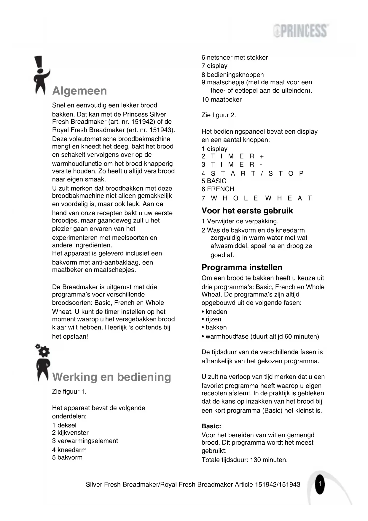 Silver Fresh Breadmaker/Royal Fresh Breadmaker Article 151942/151943 Algemeen Snel en eenvoudig een lekker brood bakken. Dat kan met de Princess Silver Fresh Breadmaker (art. nr. 151942) of de Royal Fresh Breadmaker (art. nr. 151943). Deze volautomatische broodbakmachine mengt en kneedt het deeg, bakt het brood en schakelt vervolgens over op de warmhoudfunctie om het brood knapperig vers te houden. Zo heeft u altijd vers brood naar eigen smaak. U zult merken dat broodbakken met deze broodbakmachine niet alleen gemakkelijk en voordelig is, maar ook leuk. Aan de hand van onze recepten bakt u uw eerste broodjes, maar gaandeweg zult u het plezier gaan ervaren van het experimenteren met meelsoorten en andere ingrediënten. Het apparaat is geleverd inclusief een bakvorm met anti-aanbaklaag, een maatbeker en maatschepjes. De Breadmaker is uitgerust met drie programma’s voor verschillende broodsoorten: Basic, French en Whole Wheat. U kunt de timer instellen op het moment waarop u het versgebakken brood klaar wilt hebben. Heerlijk ‘s ochtends bij het opstaan! Werking en bediening Zie figuur 1. Het apparaat bevat de volgende onderdelen: 1 deksel 2 kijkvenster 3 verwarmingselement 4 kneedarm 5 bakvorm 6 netsnoer met stekker 7 display 8 bedieningsknoppen 9 maatschepje (met de maat voor een thee- of eetlepel aan de uiteinden). 10 maatbeker Zie figuur 2. Het bedieningspaneel bevat een display en een aantal knoppen: 1 display 2TIMER+ 3TIMER- 4START/STOP 5 BASIC 6 FRENCH 7WHOLE WHEAT Voor het eerste gebruik 1 Verwijder de verpakking. 2 Was de bakvorm en de kneedarm zorgvuldig in warm water met wat afwasmiddel, spoel na en droog ze goed af. Programma instellen Om een brood te bakken heeft u keuze uit drie programma’s: Basic, French en Whole Wheat. De programma’s zijn altijd opgebouwd uit de volgende fasen: