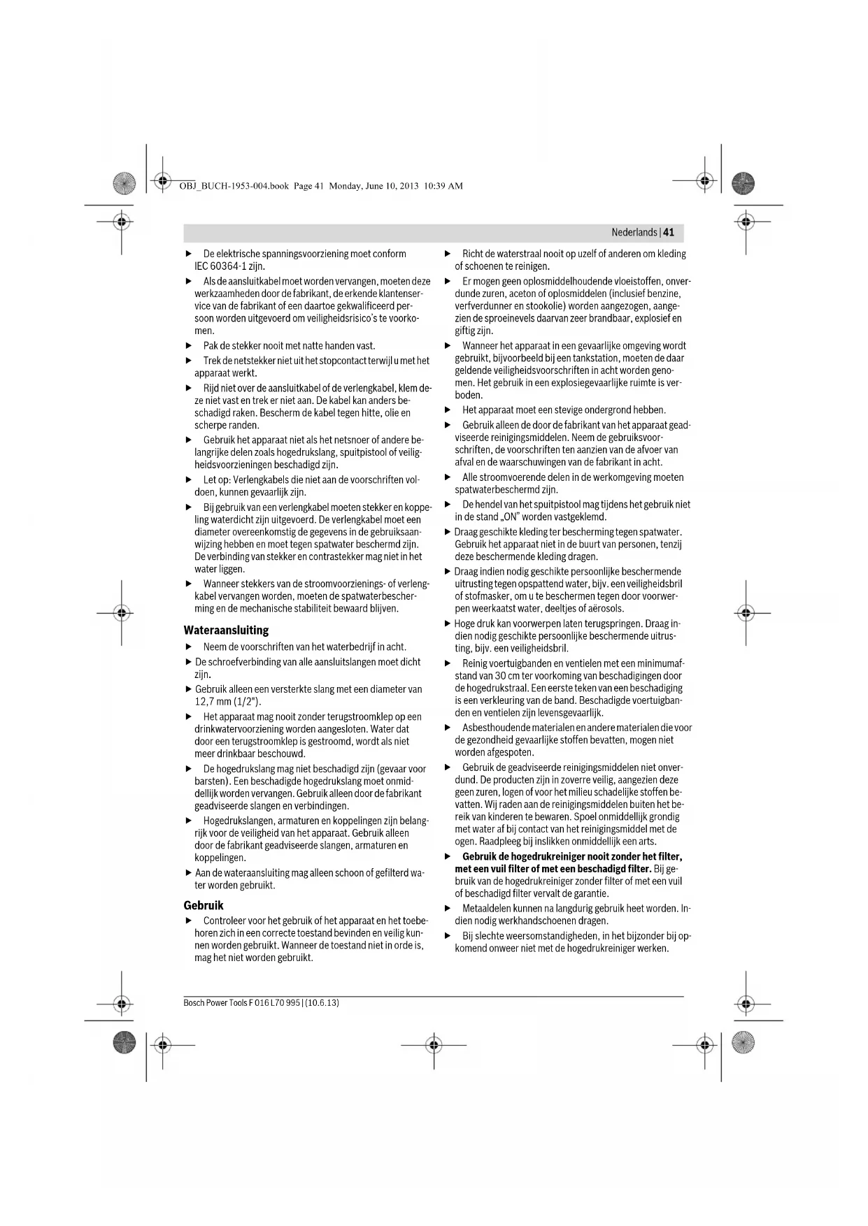 Ugello regolabile in posizione alta pressione Utilizzare la regolazione schiuma dell’ugello 3 in 1 Detergente troppo viscoso Diluire con acqua Il tubo flessibile alta pressione è sta- to prolungato. Collegare il tubo flessibile originale. Resti oppure strozzature nel circui- to del detergente Sciacquare con acqua pulita ed eliminare le strozzature Se il problema continua ad essere presente rivolgersi ad un Centro di Assistenza Bosch per istruzioni. Problema Possibili cause Rimedi OBJ_BUCH-1953-004.book Page 39 Monday, June 10, 2013 10:39 AM40 | Nederlands F 016 L70 995 | (10.6.13) Bosch Power Tools Controllare che le coperture ed i dispositivi di protezione non siano danneggiati e che siano applicati in modo corretto. Pri- ma dell’impiego effettuare eventuali lavori di manutenzione o di riparazione necessari. Se nonostante gli accurati procedimenti di produzione e di controllo il tosaerba a filo dovesse guastarsi, la riparazione va fatta effettuare da un centro di assistenza clienti autorizzato per gli elettroutensili Bosch. Comunicare sempre il codice di ordinazione a 10 cifre dell’elettroutensile in caso di richieste o di ordinazione di pez- zi di ricambio. Dopo l’impiego/conservazione Disinserire l’interruttore di avvio/arresto ed azionare il grilletto per svuotare il tubo flessibile alta pressione. Pulire la carcassa esterna dell’idropulitrice utilizzando una spaz- zola morbida ed uno straccio. Non è permesso utilizzare acqua, solventi e lucidanti. Eliminare ogni tipo di sporcizia e pulire in mo- do particolare le feritoie di ventilazione del motore. Magazzinaggio alla fine della stagione: Svuotare completamente l’acqua dalla pompa mettendo in funzione per alcuni secondi il motore ed azionando il grilletto. Non appoggiare mai altri oggetti sopra all’apparecchio. Conservare l’apparecchio in un ambiente non soggetto al gelo. Assicurarsi che durante il magazzinaggio i cavi non siano inca- strati. Non piegare il tubo flessibile alta pressione. Assistenza clienti e consulenza impieghi www.bosch-do-it.com Italia Officina Elettroutensili Robert Bosch S.p.A. Corso Europa, ang. Via Trieste 20 20020 LAINATE (MI) Tel.: (02) 3696 2663 Fax: (02) 3696 2662 Fax: (02) 3696 8677 E-Mail: officina.elettroutensili@it.bosch.com Svizzera Tel.: (044) 8471513 Fax: (044) 8471553 E-Mail: Aftersales.Service@de.bosch.com Protezione dell’ambiente Sostanze chimiche dannose per l’ambiente non devono pene- trare nel terreno, nella falda acquifera, in stagni, fiumi ecc. Utilizzando detergenti osservare scrupolosamente le indica- zioni riportate sulla confezione ed attenersi alla concentrazio- ne prescritta. In caso di pulizia di veicoli a motore rispettare le norme vigenti locali: È necessario assolutamente evitare che olio lavato via possa penetrare nella falda acquifera. Smaltimento Avviare ad un riciclaggio rispettoso dell’ambiente idropulitri- ce, accessori ed imballaggi dismessi. Non gettare l’idropulitrice tra i rifiuti domestici! Solo per i Paesi della CE: Conformemente alla direttiva europea 2012/19/UE sui rifiuti di apparecchiature elettriche ed elettroniche ed all’attuazione del recepimento nel diritto nazionale, le ap- parecchiature elettriche ed elettroniche di- ventate inservibili devono essere raccolte separatamente ed essere inviati ad una riu- tilizzazione ecologica. Con ogni riserva di modifiche tecniche. Nederlands Veiligheidsvoorschriften Verklaring van de pictogrammen Algemene waarschuwing. Richt de waterstraal nooit op mensen, die- ren, het apparaat of elektrische onderde- len. Let op: De hogedrukstraal kan gevaarlijk zijn als deze onjuist wordt gebruikt. Volgens de geldende voorschriften mag het apparaat zonder systeemscheiding niet op het drinkwaternet worden aangesloten. Gebruik een systeemscheider volgens IEC 61770 type BA. Water dat door de systeemscheider stroomt, is geen drinkwater meer. Veiligheidsvoorschriften voor hogedrukreinigers Lees alle veiligheidswaarschuwingen en alle voorschriften. Als de waarschuwingen en voor- schriften niet worden opgevolgd, kan dit een elek- trische schok, brand of ernstig letsel tot gevolg hebben. De plaatjes met waarschuwingen en aanwijzingen op het apparaat geven belangrijke informatie over veilig ge- bruik. Neem naast de voorschriften in de gebruiksaanwijzing ook de algemene veiligheidsvoorschriften en de voor- schriften ter voorkoming van ongevallen in acht. Stroomaansluiting De spanning van de stroombron moet overeenkomen met de gegevens op het typeplaatje van het apparaat. Geadviseerd wordt om dit apparaat alleen aan te sluiten op een stopcontact dat is beveiligd met aardlekschakelaar van 30 mA. Trek de stekker uit het stopcontact, ook als u het apparaat slechts voor korte tijd onbeheerd laat. OBJ_BUCH-1953-004.book Page 40 Monday, June 10, 2013 10:39 AMNederlands | 41 Bosch Power Tools F 016 L70 995 | (10.6.13) De elektrische spanningsvoorziening moet conform IEC 60364-1 zijn. Als de aansluitkabel moet worden vervangen, moeten deze werkzaamheden door de fabrikant, de erkende klantenser- vice van de fabrikant of een daartoe gekwalificeerd per- soon worden uitgevoerd om veiligheidsrisico’s te voorko- men. Pak de stekker nooit met natte handen vast. Trek de netstekker niet uit het stopcontact terwijl u met het apparaat werkt. Rijd niet over de aansluitkabel of de verlengkabel, klem de- ze niet vast en trek er niet aan. De kabel kan anders be- schadigd raken. Bescherm de kabel tegen hitte, olie en scherpe randen. Gebruik het apparaat niet als het netsnoer of andere be- langrijke delen zoals hogedrukslang, spuitpistool of veilig- heidsvoorzieningen beschadigd zijn. Let op: Verlengkabels die niet aan de voorschriften vol- doen, kunnen gevaarlijk zijn. Bij gebruik van een verlengkabel moeten stekker en koppe- ling waterdicht zijn uitgevoerd. De verlengkabel moet een diameter overeenkomstig de gegevens in de gebruiksaan- wijzing hebben en moet tegen spatwater beschermd zijn. De verbinding van stekker en contrastekker mag nie
