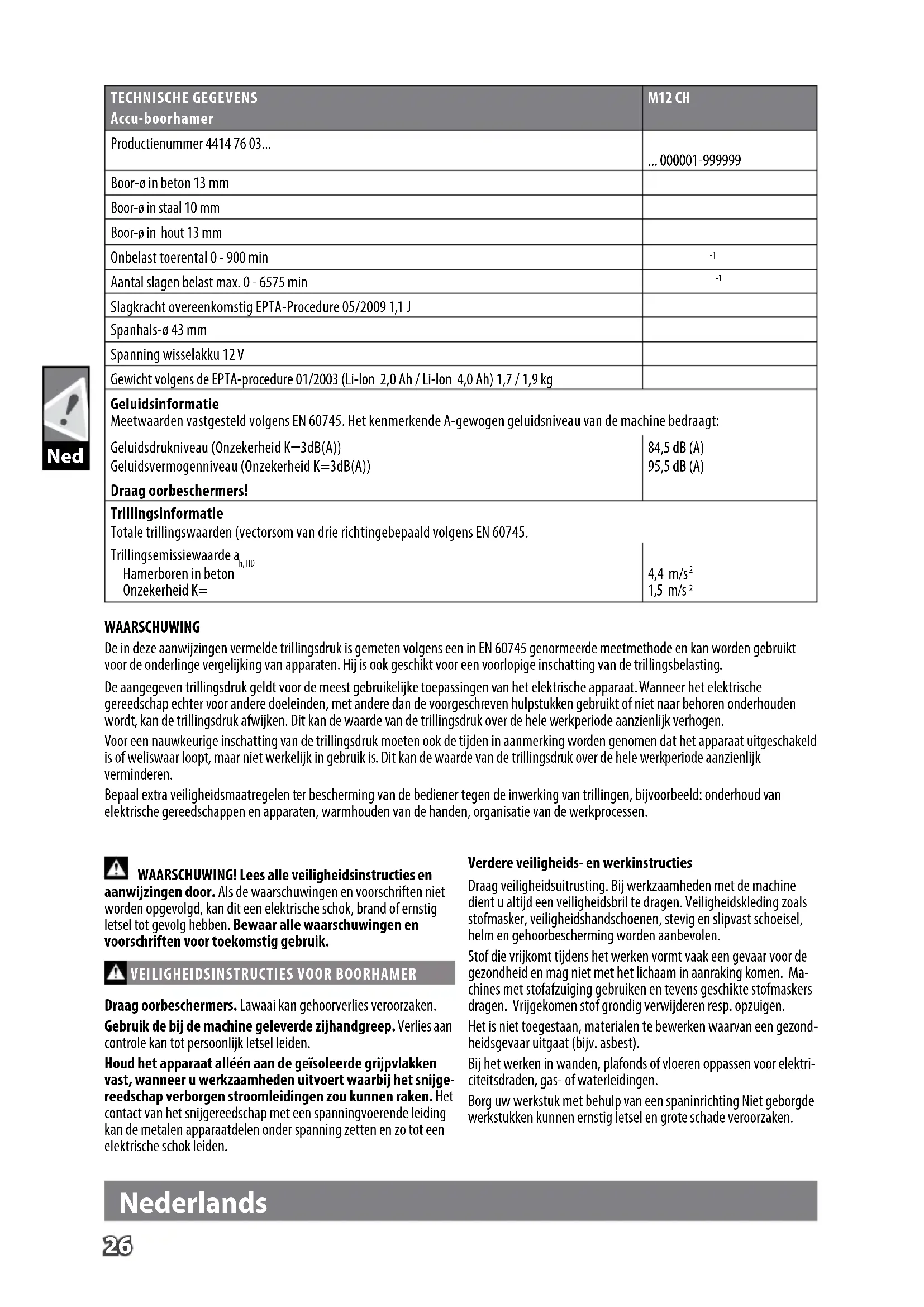 Draag oorbeschermers. Lawaai kan gehoorverlies veroorzaken. Gebruik de bij de machine geleverde zijhandgreep. Verlies aan controle kan tot persoonlijk letsel leiden. Houd het apparaat alléén aan de geïsoleerde grijpvlakken vast, wanneer u werkzaamheden uitvoert waarbij het snijge- reedschap verborgen stroomleidingen zou kunnen raken. Het contact van het snijgereedschap met een spanningvoerende leiding kan de metalen apparaatdelen onder spanning zetten en zo tot een elektrische schok leiden. Verdere veiligheids- en werkinstructies Draag veiligheidsuitrusting. Bij werkzaamheden met de machine dient u altijd een veiligheidsbril te dragen. Veiligheidskleding zoals stofmasker, veiligheidshandschoenen, stevig en slipvast schoeisel, helm en gehoorbescherming worden aanbevolen. Stof die vrijkomt tijdens het werken vormt vaak een gevaar voor de gezondheid en mag niet met het lichaam in aanraking komen. Ma- chines met stofafzuiging gebruiken en tevens geschikte stofmaskers dragen. Vrijgekomen stof grondig verwijderen resp. opzuigen. Het is niet toegestaan, materialen te bewerken waarvan een gezond- heidsgevaar uitgaat (bijv. asbest). Bij het werken in wanden, plafonds of vloeren oppassen voor elektri- citeitsdraden, gas- of waterleidingen. Borg uw werkstuk met behulp van een spaninrichting Niet geborgde werkstukken kunnen ernstig letsel en grote schade veroorzaken. TECHNISCHE GEGEVENS Accu-boorhamer M12 CH Productienummer 4414 76 03... ... 000001-999999 Boor-ø in beton 13 mm Boor-ø in staal 10 mm Boor-ø in hout 13 mm Onbelast toerental 0 - 900 min
