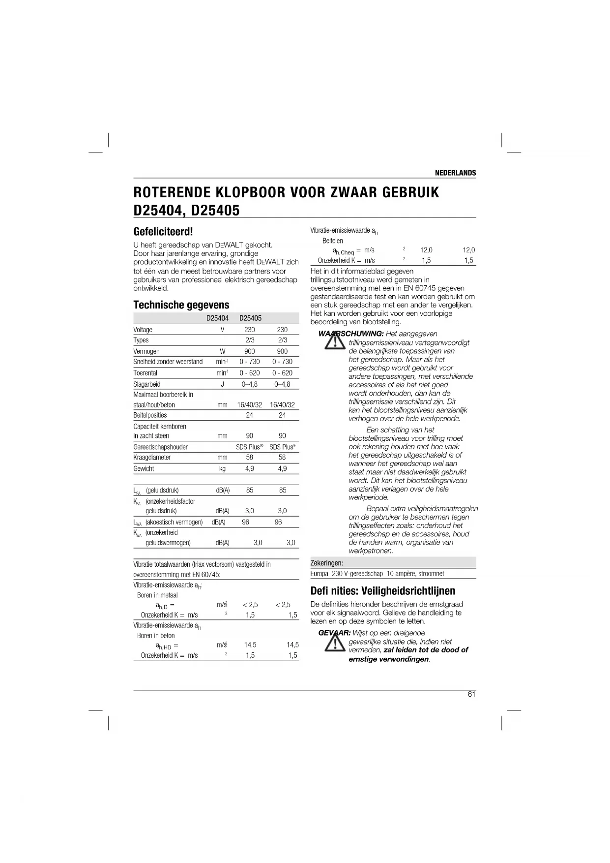 1,5 1,5 Het in dit informatieblad gegeven trillingsuitstootniveau werd gemeten in overeenstemming met een in EN 60745 gegeven gestandaardiseerde test en kan worden gebruikt om een stuk gereedschap met een ander te vergelijken. Het kan worden gebruikt voor een voorlopige beoordeling van blootstelling. WAARSCHUWING: Het aangegeven trillingsemissieniveau vertegenwoordigt de belangrijkste toepassingen van het gereedschap. Maar als het gereedschap wordt gebruikt voor andere toepassingen, met verschillende accessoires of als het niet goed wordt onderhouden, dan kan de trillingsemissie verschillend zijn. Dit kan het blootstellingsniveau aanzienlijk verhogen over de hele werkperiode. Een schatting van het blootstellingsniveau voor trilling moet ook rekening houden met hoe vaak het gereedschap uitgeschakeld is of wanneer het gereedschap wel aan staat maar niet daadwerkelijk gebruikt wordt. Dit kan het blootstellingsniveau aanzienlijk verlagen over de hele werkperiode. Bepaal extra veiligheidsmaatregelen om de gebruiker te beschermen tegen trillingseffecten zoals: onderhoud het gereedschap en de accessoires, houd de handen warm, organisatie van werkpatronen. Zekeringen: Europa 230 V-gereedschap 10 ampère, stroomnet Defi nities: Veiligheidsrichtlijnen De definities hieronder beschrijven de ernstgraad voor elk signaalwoord. Gelieve de handleiding te lezen en op deze symbolen te letten. GEVAAR: Wijst op een dreigende gevaarlijke situatie die, indien niet vermeden, zal leiden tot de dood of ernstige verwondingen. Gefeliciteerd! U heeft gereedschap van DEWALT gekocht. Door haar jarenlange ervaring, grondige productontwikkeling en innovatie heeft DEWALT zich tot één van de meest betrouwbare partners voor gebruikers van professioneel elektrisch gereedschap ontwikkeld. Technische gegevens D25404 D25405 Voltage V 230 230 Types 2/3 2/3 Vermogen W 900 900 Snelheid zonder weerstand min