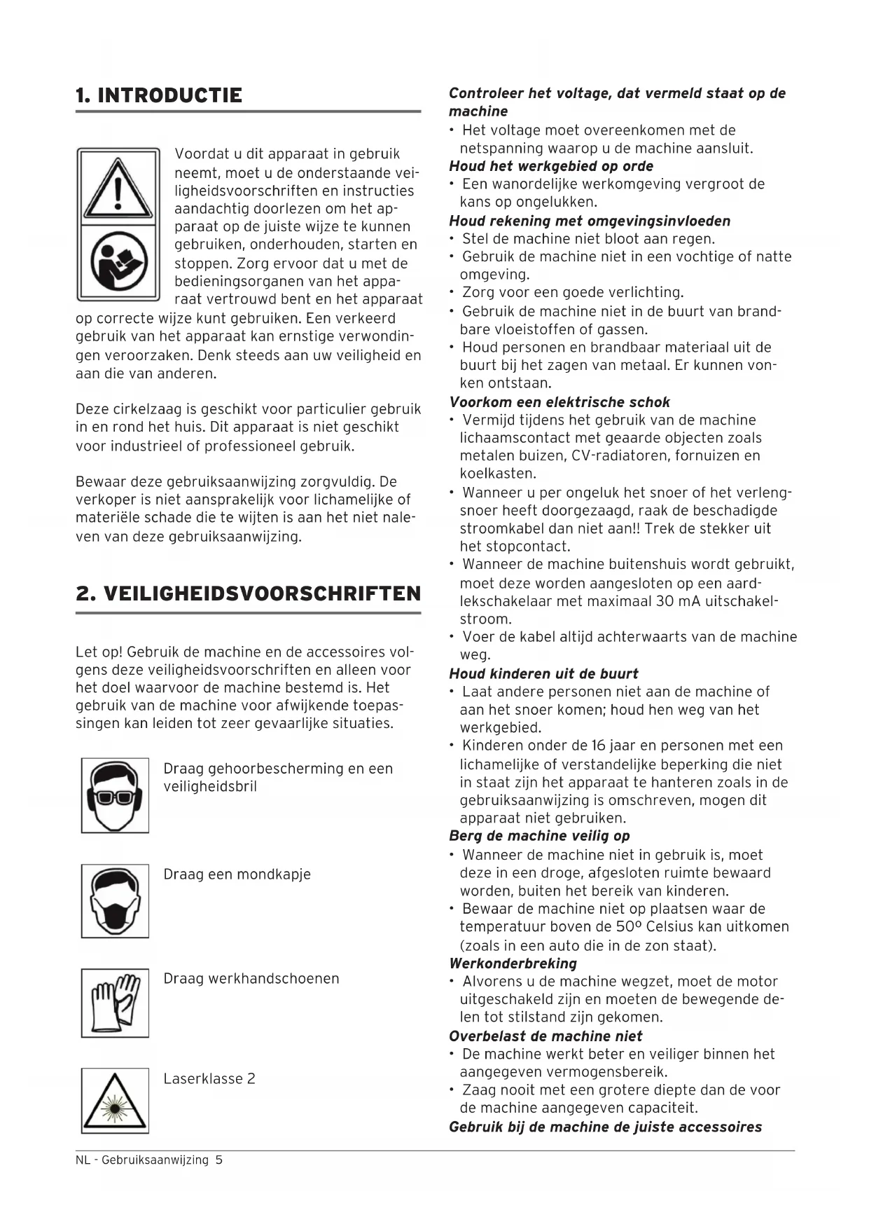 Let op! Gebruik de machine en de accessoires vol- gens deze veiligheidsvoorschriften en alleen voor het doel waarvoor de machine bestemd is. Het gebruik van de machine voor afwijkende toepas- singen kan leiden tot zeer gevaarlijke situaties. Draag gehoorbescherming en een veiligheidsbril Draag een mondkapje Draag werkhandschoenen Laserklasse 2 Controleer het voltage, dat vermeld staat op de machine