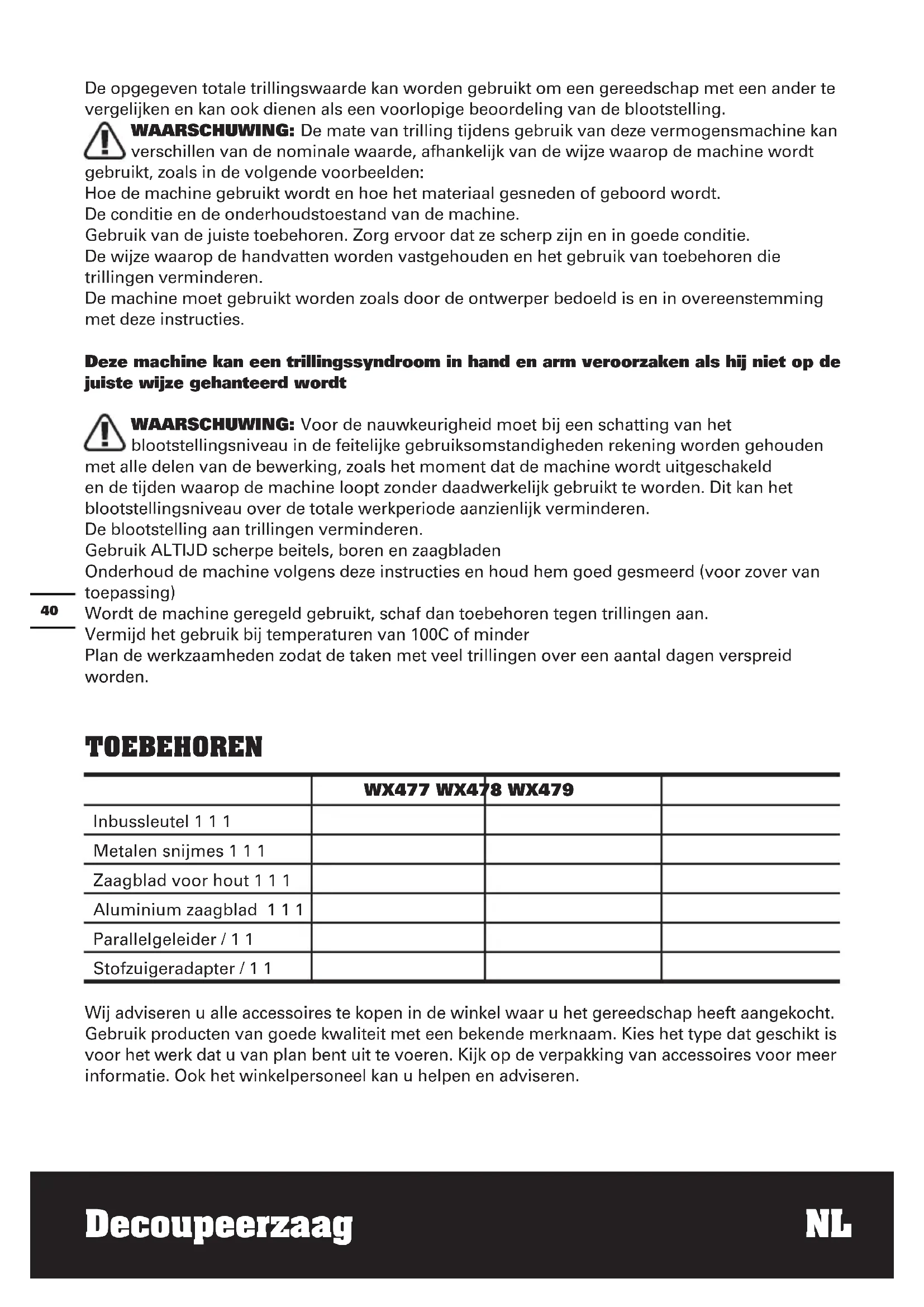 De opgegeven totale trillingswaarde kan worden gebruikt om een gereedschap met een ander te vergelijken en kan ook dienen als een voorlopige beoordeling van de blootstelling. WAARSCHUWING: De mate van trilling tijdens gebruik van deze vermogensmachine kan verschillen van de nominale waarde, afhankelijk van de wijze waarop de machine wordt gebruikt, zoals in de volgende voorbeelden: Hoe de machine gebruikt wordt en hoe het materiaal gesneden of geboord wordt. De conditie en de onderhoudstoestand van de machine. Gebruik van de juiste toebehoren. Zorg ervoor dat ze scherp zijn en in goede conditie. De wijze waarop de handvatten worden vastgehouden en het gebruik van toebehoren die trillingen verminderen. De machine moet gebruikt worden zoals door de ontwerper bedoeld is en in overeenstemming met deze instructies. Deze machine kan een trillingssyndroom in hand en arm veroorzaken als hij niet op de juiste wijze gehanteerd wordt WAARSCHUWING: Voor de nauwkeurigheid moet bij een schatting van het blootstellingsniveau in de feitelijke gebruiksomstandigheden rekening worden gehouden met alle delen van de bewerking, zoals het moment dat de machine wordt uitgeschakeld en de tijden waarop de machine loopt zonder daadwerkelijk gebruikt te worden. Dit kan het blootstellingsniveau over de totale werkperiode aanzienlijk verminderen. De blootstelling aan trillingen verminderen. Gebruik ALTIJD scherpe beitels, boren en zaagbladen Onderhoud de machine volgens deze instructies en houd hem goed gesmeerd (voor zover van toepassing) Wordt de machine geregeld gebruikt, schaf dan toebehoren tegen trillingen aan. Vermijd het gebruik bij temperaturen van 100C of minder Plan de werkzaamheden zodat de taken met veel trillingen over een aantal dagen verspreid worden. TOEBEHOREN WX477 WX478 WX479 Inbussleutel 1 1 1 Metalen snijmes 1 1 1 Zaagblad voor hout 1 1 1 Aluminium zaagblad 1 1 1 Parallelgeleider / 1 1 Stofzuigeradapter / 1 1 Wij adviseren u alle accessoires te kopen in de winkel waar u het gereedschap heeft aangekocht. Gebruik producten van goede kwaliteit met een bekende merknaam. Kies het type dat geschikt is voor het werk dat u van plan bent uit te voeren. Kijk op de verpakking van accessoires voor meer informatie. Ook het winkelpersoneel kan u helpen en adviseren.Decoupeerzaag NL