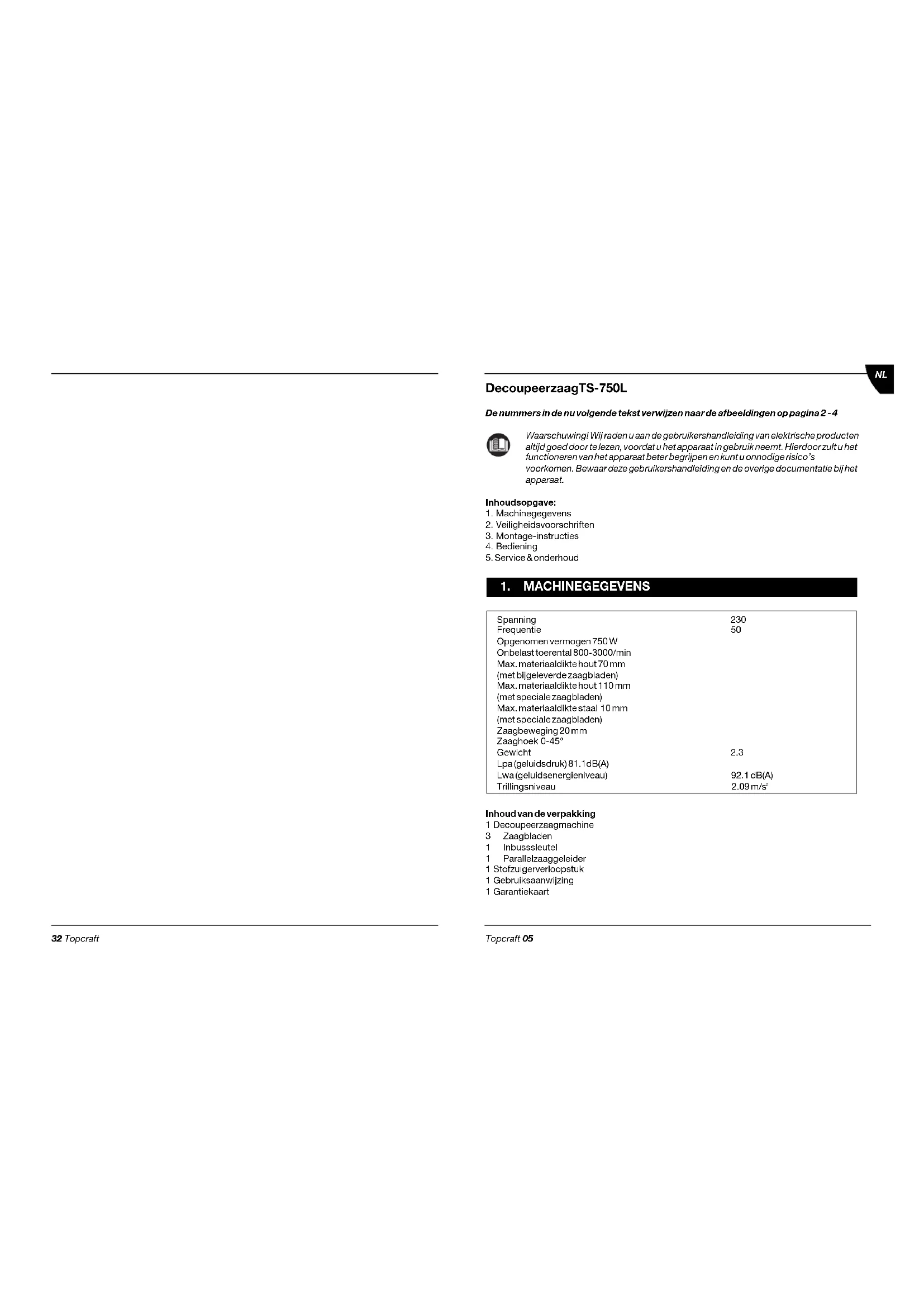 16Topcraft 05 DecoupeerzaagTS-750L De nummers in de nu volgende tekst verwijzen naar de afbeeldingen op pagina 2 - 4 Waarschuwing! Wij raden u aan de gebruikershandleiding van elektrische producten altijd goed door te lezen, voordat u het apparaat in gebruik neemt. Hierdoor zult u het functioneren van het apparaat beter begrijpen en kunt u onnodige risico’s voorkomen. Bewaar deze gebruikershandleiding en de overige documentatie bij het apparaat. Inhoudsopgave: