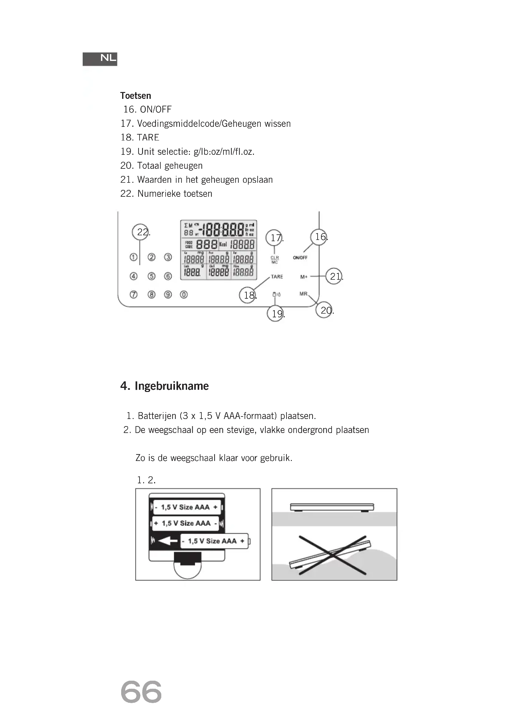 Gevaar ō9HUEUXLNWHEDWWHULMHQQRRLWLQYXXUZHUSHQ2QWSORIILQJVJHYDDU ō%DWWHULMHQQRRLWNRUWVOXLWHQ Waarschuwing ō$OYRUHQVHHQGLHHWWHSODQQHQUDGHQZLMXDDQHHQGRNWHURIGLHHW- specialist te raadplegen. ō,QGLHQKHWDSSDUDDWYHUNHHUGJHEUXLNWZRUGWRILQGLHQGHLQIRUPDWLH foutief wordt ingevoerd, kan het apparaat resultaten opleveren die kunnen leiden tot een onevenwicht in de voeding en/of gezond- heidsschade bij personen die zich aan een dieet moeten houden. ō+HWDSSDUDDWEXLWHQKHWEHUHLNYDQNLQGHUHQKRXGHQ ō=RUJHUYRRUGDWKHWMXLVWHW\SHEDWWHULMJHEUXLNWZRUGW/HWELMKHW plaatsen van de batterijen op de juiste poolrichting. Bij het vervan- gen van de batterijen, uitsluitend nieuwe batterijen gebruiken en nooit batterijen met zichtbare schade, omdat dit kan leiden tot oververhitting of explosies. ō+RXGEDWWHULMHQDOWLMGEXLWHQKHWEHUHLNYDQNLQGHUHQ Opgelet ō'HFRPSRQHQWHQYDQGLWDSSDUDDWPRJHQQLHWJHGHPRQWHHUGKHU- steld of veranderd worden. ō%DWWHULMHQEHYDWWHQFKHPLVFKHVWRIIHQ,QGLHQ]HXLWORSHQNDQGLW materiële schade en lichamelijke letsels veroorzaken. Indien er accuzuur in uw ogen terechtkomt, de ogen onmiddellijk spoelen met veel water en onmiddellijk een dokter raadplegen. ō'HEDWWHULMHQXLWKHWDSSDUDDWYHUZLMGHUHQLQGLHQKHWJHGXUHQGH een langere periode niet wordt gebruikt. Aanwijzingen ō+HWUHVXOWDDWNDQYHUYDOVWZRUGHQ - in de buurt van een GSM - in de buurt van warmtebronnen of plaatsen met temperatuur- schommelingen - op plaatsen met een grote luchtvochtigheid - op plaatsen die beïnvloed worden door trillingen of schokken. - op oneffen oppervlakken. ō6WHOKHWDSSDUDDWQLHWEORRWDDQGLUHFW]RQOLFKW65