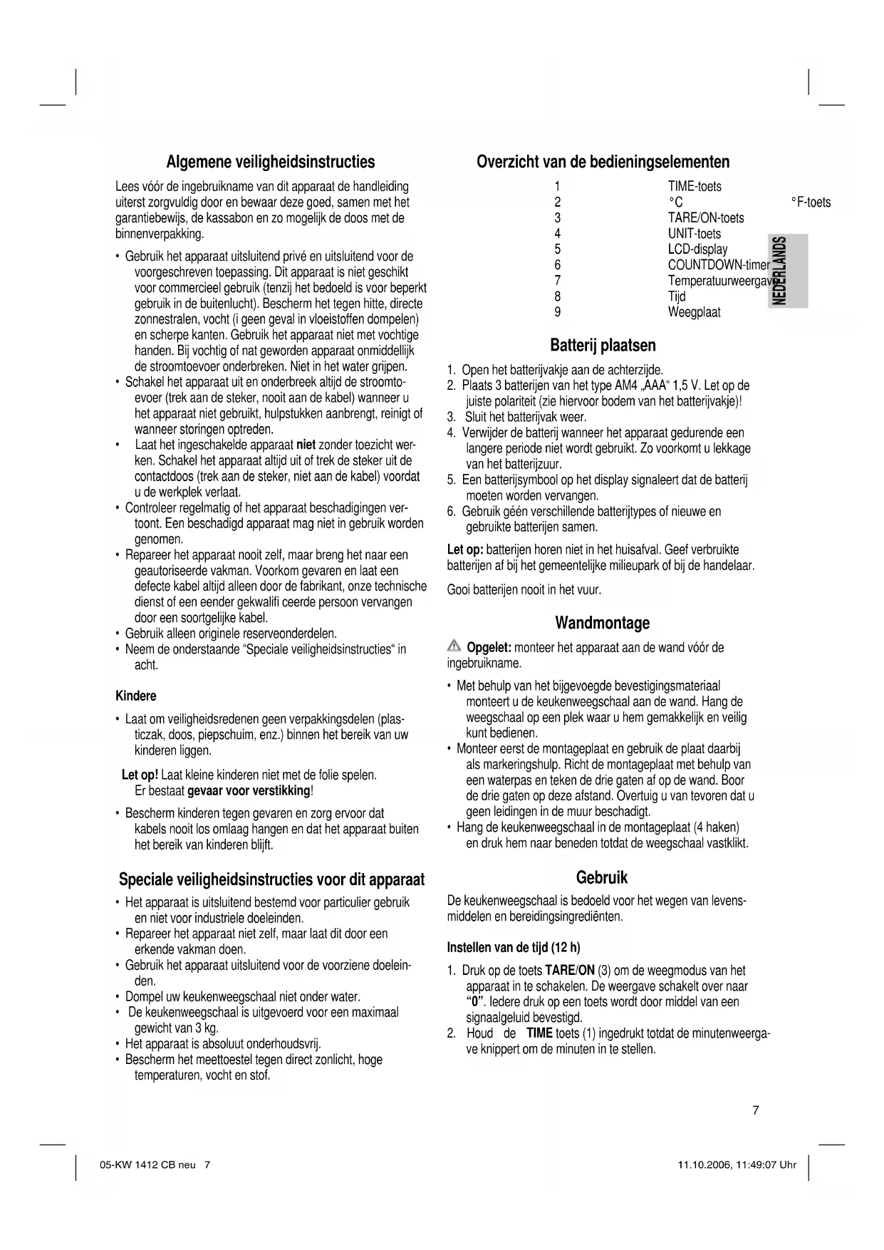 - Droog het apparaat na de reiniging zorgvuldig af met een droge, zachte doek. Technische gegevens Model: .......................................................................KW 1412 CB Spanningstoevoer: ...............DC 4,5 V (3 x 1,5V “AAA” batterijen) Max. gewichtsbelasting:..........................................................3 kg Dit apparaat is gekeurd conform de op dit moment van toepas- sing zijnde CE-richtlijnen zoals bijvoorbeeld elektromagnetische compatibiliteit en laagspanningsvoorschriften en is geconstru- eerd volgens de nieuwste veiligheidstechnische voorschriften. Technische wijzigingen voorbehouden! Garantie Voor het door ons geleverde apparaat verlenen wij een garantie van 24 maanden vanaf koopdatum (kassabon). Eventuele gebreken aan het apparaat of aan het toebehoren die zijn ontstaan door productie- of materiaalfouten verhelpen wij binnen deze periode kosteloos door middel van reparatie of, naar ons oordeel, door vervanging. Eventuele garantiegevallen verlengen noch de geldigheidsduur van de garantie, noch begint daardoor een nieuwe garantieperiode! Het koopbewijs geldt als garantiebewijs. Zonder dit bewijs kan geen kosteloze reparatie of vervanging plaatsvinden. Geef in garantiegevallen het complete apparaat in de originele verpakking samen met de kassabon af bij uw handelaar. Niet defecten aan de hulpstukken of aan de slijtende onder- delen, maar ook reiniging, onderhoud of de vervanging van slijtende delen vallen niet onder de garantie en geschieden altijd tegen berekening! Bij ingrepen door derden komt de garantieverlening te vervallen. 05-KW 1412 CB neu 8 11.10.2006, 11:49:09 UhrNEDERLANDS
