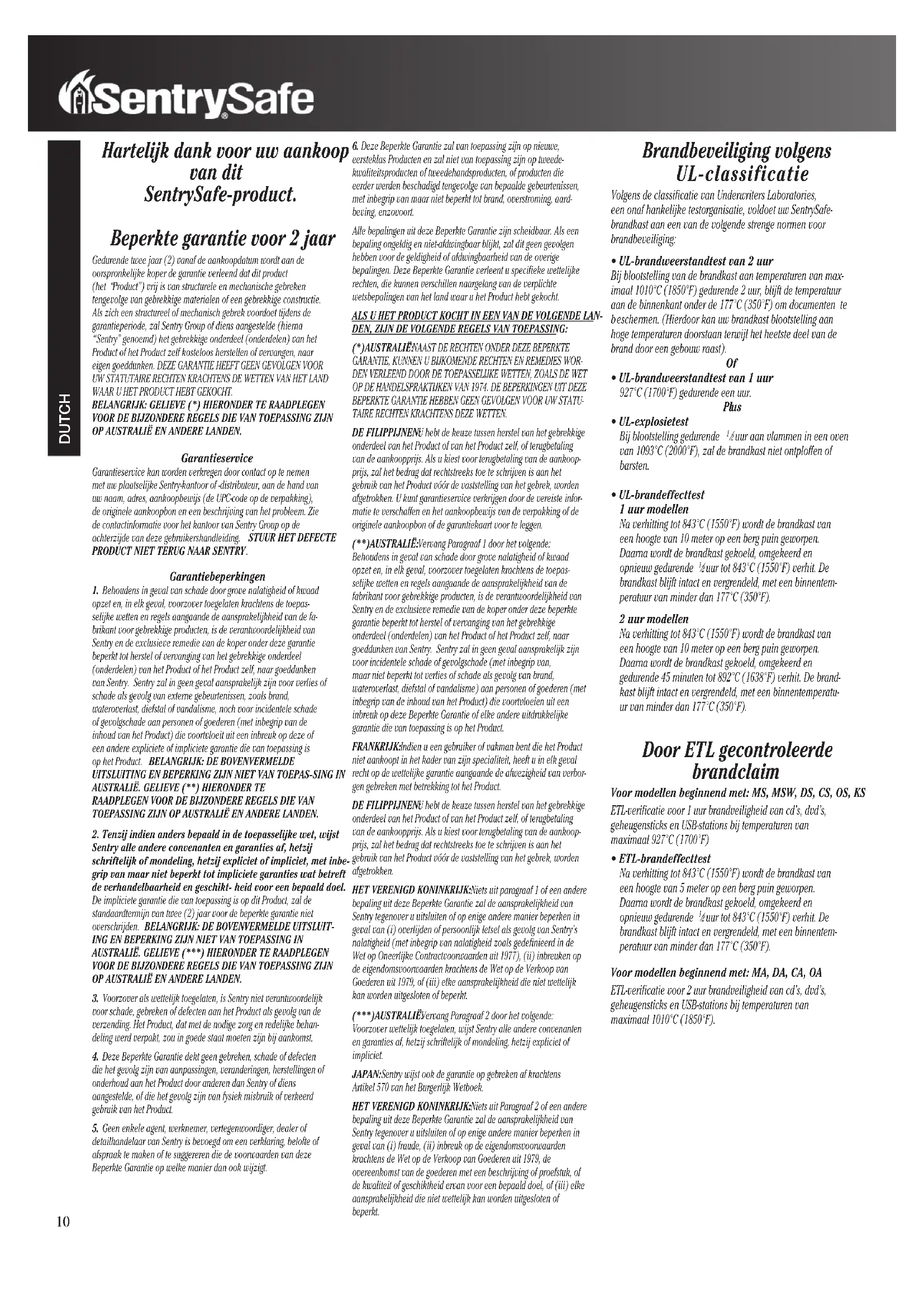 GARANTIE, KUNNEN U BIJKOMENDE RECHTEN EN REMEDIES WOR- DEN VERLEEND DOOR DE TOEPASSELIJKE WETTEN, ZOALS DE WET OP DE HANDELSPRAKTIJKEN VAN 1974. DE BEPERKINGEN UIT DEZE BEPERKTE GARANTIE HEBBEN GEEN GEVOLGEN VOOR UW STATU- TAIRE RECHTEN KRACHTENS DEZE WETTEN. DE FILIPPIJNEN: U hebt de keuze tussen herstel van het gebrekkige onderdeel van het Product of van het Product zelf, of terugbetaling van de aankoopprijs. Als u kiest voor terugbetaling van de aankoop- prijs, zal het bedrag dat rechtstreeks toe te schrijven is aan het gebruik van het Product vóór de vaststelling van het gebrek, worden afgetrokken. U kunt garantieservice verkrijgen door de vereiste infor- matie te verschaffen en het aankoopbewijs van de verpakking of de originele aankoopbon of de garantiekaart voor te leggen. (**)AUSTRALIË: Vervang Paragraaf 1 door het volgende: Behoudens in geval van schade door grove nalatigheid of kwaad opzet en, in elk geval, voorzover toegelaten krachtens de toepas- selijke wetten en regels aangaande de aansprakelijkheid van de fabrikant voor gebrekkige producten, is de verantwoordelijkheid van Sentry en de exclusieve remedie van de koper onder deze beperkte garantie beperkt tot herstel of vervanging van het gebrekkige onderdeel (onderdelen) van het Product of het Product zelf, naar goeddunken van Sentry. Sentry zal in geen geval aansprakelijk zijn voor incidentele schade of gevolgschade (met inbegrip van, maar niet beperkt tot verlies of schade als gevolg van brand, wateroverlast, diefstal of vandalisme) aan personen of goederen (met inbegrip van de inhoud van het Product) die voortvloeien uit een inbreuk op deze Beperkte Garantie of elke andere uitdrukkelijke garantie die van toepassing is op het Product. FRANKRIJK: Indien u een gebruiker of vakman bent die het Product niet aankoopt in het kader van zijn specialiteit, heeft u in elk geval recht op de wettelijke garantie aangaande de afwezigheid van verbor- gen gebreken met betrekking tot het Product. DE FILIPPIJNEN: U hebt de keuze tussen herstel van het gebrekkige onderdeel van het Product of van het Product zelf, of terugbetaling van de aankoopprijs. Als u kiest voor terugbetaling van de aankoop- prijs, zal het bedrag dat rechtstreeks toe te schrijven is aan het gebruik van het Product vóór de vaststelling van het gebrek, worden afgetrokken. HET VERENIGD KONINKRIJK: Niets uit paragraaf 1 of een andere bepaling uit deze Beperkte Garantie zal de aansprakelijkheid van Sentry tegenover u uitsluiten of op enige andere manier beperken in geval van (i) overlijden of persoonlijk letsel als gevolg van Sentry’s nalatigheid (met inbegrip van nalatigheid zoals gedefinieerd in de Wet op Oneerlijke Contractvoorwaarden uit 1977), (ii) inbreuken op de eigendomsvoorwaarden krachtens de Wet op de Verkoop van Goederen uit 1979, of (iii) elke aansprakelijkheid die niet wettelijk kan worden uitgesloten of beperkt. (***)AUSTRALIË: Vervang Paragraaf 2 door het volgende: Voorzover wettelijk toegelaten, wijst Sentry alle andere convenanten en garanties af, hetzij schriftelijk of mondeling, hetzij expliciet of impliciet. JAPAN: Sentry wijst ook de garantie op gebreken af krachtens Artikel 570 van het Burgerlijk Wetboek. HET VERENIGD KONINKRIJK: Niets uit Paragraaf 2 of een andere bepaling uit deze Beperkte Garantie zal de aansprakelijkheid van Sentry tegenover u uitsluiten of op enige andere manier beperken in geval van (i) fraude, (ii) inbreuk op de eigendomsvoorwaarden krachtens de Wet op de Verkoop van Goederen uit 1979, de overeenkomst van de goederen met een beschrijving of proefstuk, of de kwaliteit of geschiktheid ervan voor een bepaald doel, of (iii) elke aansprakelijkheid die niet wettelijk kan worden uitgesloten of beperkt. Brandbeveiliging volgens UL-classificatie Volgens de classificatie van Underwriters Laboratories, een onaf hankelijke testorganisatie, voldoet uw SentrySafe- brandkast aan een van de volgende strenge normen voor brandbeveiliging: