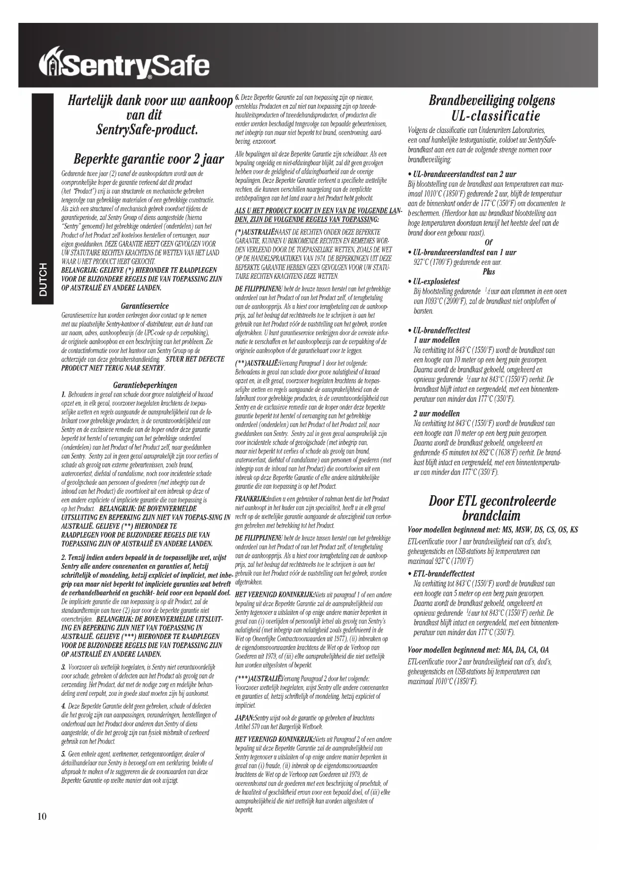 GARANTIE, KUNNEN U BIJKOMENDE RECHTEN EN REMEDIES WOR- DEN VERLEEND DOOR DE TOEPASSELIJKE WETTEN, ZOALS DE WET OP DE HANDELSPRAKTIJKEN VAN 1974. DE BEPERKINGEN UIT DEZE BEPERKTE GARANTIE HEBBEN GEEN GEVOLGEN VOOR UW STATU- TAIRE RECHTEN KRACHTENS DEZE WETTEN. DE FILIPPIJNEN: U hebt de keuze tussen herstel van het gebrekkige onderdeel van het Product of van het Product zelf, of terugbetaling van de aankoopprijs. Als u kiest voor terugbetaling van de aankoop- prijs, zal het bedrag dat rechtstreeks toe te schrijven is aan het gebruik van het Product vóór de vaststelling van het gebrek, worden afgetrokken. U kunt garantieservice verkrijgen door de vereiste infor- matie te verschaffen en het aankoopbewijs van de verpakking of de originele aankoopbon of de garantiekaart voor te leggen. (**)AUSTRALIË: Vervang Paragraaf 1 door het volgende: Behoudens in geval van schade door grove nalatigheid of kwaad opzet en, in elk geval, voorzover toegelaten krachtens de toepas- selijke wetten en regels aangaande de aansprakelijkheid van de fabrikant voor gebrekkige producten, is de verantwoordelijkheid van Sentry en de exclusieve remedie van de koper onder deze beperkte garantie beperkt tot herstel of vervanging van het gebrekkige onderdeel (onderdelen) van het Product of het Product zelf, naar goeddunken van Sentry. Sentry zal in geen geval aansprakelijk zijn voor incidentele schade of gevolgschade (met inbegrip van, maar niet beperkt tot verlies of schade als gevolg van brand, wateroverlast, diefstal of vandalisme) aan personen of goederen (met inbegrip van de inhoud van het Product) die voortvloeien uit een inbreuk op deze Beperkte Garantie of elke andere uitdrukkelijke garantie die van toepassing is op het Product. FRANKRIJK: Indien u een gebruiker of vakman bent die het Product niet aankoopt in het kader van zijn specialiteit, heeft u in elk geval recht op de wettelijke garantie aangaande de afwezigheid van verbor- gen gebreken met betrekking tot het Product. DE FILIPPIJNEN: U hebt de keuze tussen herstel van het gebrekkige onderdeel van het Product of van het Product zelf, of terugbetaling van de aankoopprijs. Als u kiest voor terugbetaling van de aankoop- prijs, zal het bedrag dat rechtstreeks toe te schrijven is aan het gebruik van het Product vóór de vaststelling van het gebrek, worden afgetrokken. HET VERENIGD KONINKRIJK: Niets uit paragraaf 1 of een andere bepaling uit deze Beperkte Garantie zal de aansprakelijkheid van Sentry tegenover u uitsluiten of op enige andere manier beperken in geval van (i) overlijden of persoonlijk letsel als gevolg van Sentry’s nalatigheid (met inbegrip van nalatigheid zoals gedefinieerd in de Wet op Oneerlijke Contractvoorwaarden uit 1977), (ii) inbreuken op de eigendomsvoorwaarden krachtens de Wet op de Verkoop van Goederen uit 1979, of (iii) elke aansprakelijkheid die niet wettelijk kan worden uitgesloten of beperkt. (***)AUSTRALIË: Vervang Paragraaf 2 door het volgende: Voorzover wettelijk toegelaten, wijst Sentry alle andere convenanten en garanties af, hetzij schriftelijk of mondeling, hetzij expliciet of impliciet. JAPAN: Sentry wijst ook de garantie op gebreken af krachtens Artikel 570 van het Burgerlijk Wetboek. HET VERENIGD KONINKRIJK: Niets uit Paragraaf 2 of een andere bepaling uit deze Beperkte Garantie zal de aansprakelijkheid van Sentry tegenover u uitsluiten of op enige andere manier beperken in geval van (i) fraude, (ii) inbreuk op de eigendomsvoorwaarden krachtens de Wet op de Verkoop van Goederen uit 1979, de overeenkomst van de goederen met een beschrijving of proefstuk, of de kwaliteit of geschiktheid ervan voor een bepaald doel, of (iii) elke aansprakelijkheid die niet wettelijk kan worden uitgesloten of beperkt. Brandbeveiliging volgens UL-classificatie Volgens de classificatie van Underwriters Laboratories, een onaf hankelijke testorganisatie, voldoet uw SentrySafe- brandkast aan een van de volgende strenge normen voor brandbeveiliging: