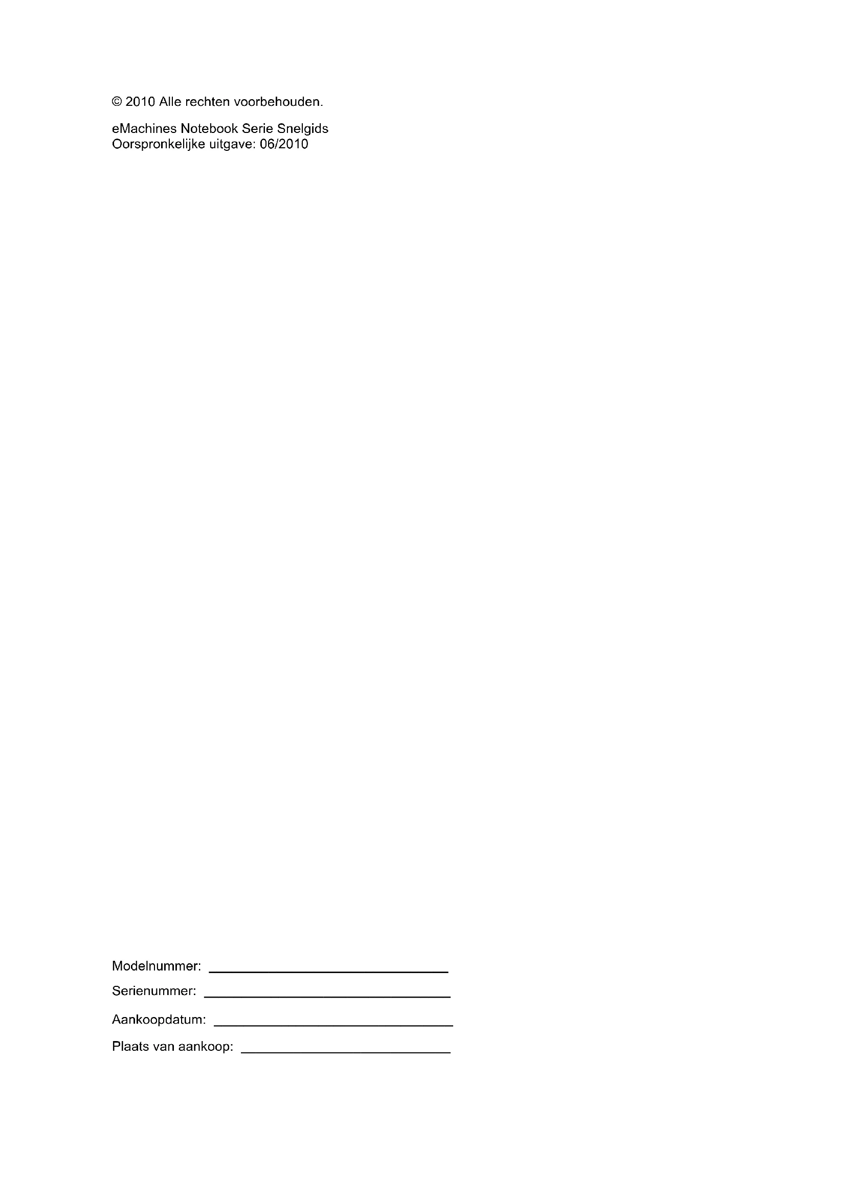 4eMachines Notebook Serie SnelgidsModelnummer: ________________________________ Serienummer: _________________________________ Aankoopdatum: ________________________________ Plaats van aankoop: ____________________________ © 2010 Alle rechten voorbehouden. eMachines Notebook Serie Snelgids Oorspronkelijke uitgave: 06/20103 Om te beginnen Bedankt dat u hebt gekozen voor een notebook van eMachines als oplossing voor uw mobiele computereisen. Uw gidsen Voor een optimaal gebruik van de eMachines notebook, hebben we een aantal handleidingen samengesteld: Allereerst helpt de instelkaart u bij het instellen van uw computer. De eMachines Algemene Gebruikershandleiding bevat nuttige informatie voor alle modellen in de eMachines productreeks. De handleiding behandelt basale onderwerpen, zoals systeemherstel, het gebruik van het toetsenbord, geluid, enz. Vandaar dat de eMachines Algemene Gebruikershandleiding af en toe naar functies of kenmerken verwijzen die slechts voor enkele modellen in de reeks gelden, en dus niet noodzakelijk voor het model dat u heeft aangeschaft. Dit wordt in de tekst aangegeven met opmerkingen in de trand van "alleen voor bepaalde modellen". In deze Snelgids krijgt u een introductie over de basiseigenschappen en functies van uw nieuwe computer. Voor meer informatie over hoe de computer u kan helpen productiever te werken, zie de eMachines Gebruikershandleiding. Hierin vindt u gedetailleerde informatie over onderwerpen als systeemhulpmiddelen, gegevensherstel, uitbreidingsopties en oplossen van problemen. Daarnaast bevat het informatie over garantie en de algemene voorwaarden en veiligheid voor uw notebook. Het is als Portable Document Format (PDF) beschikbaar en is al van te voren op uw notebook gezet. Volg deze stappen voor toegang tot dit document: 1 Klik op Start > Alle programma’s > eMachines Documentatie. 2 Klik vervolgens op eMachines Gebruikershandleiding. Opmerking: Als u het bestand wilt inzien, dient Adobe Reader te zijn geïnstalleerd. Als Adobe Reader nog niet op uw computer is geïnstalleerd, wordt, als u op eMachines Gebruikershandleiding klikt, eerst het installatieprogramma van Adobe Reader gestart. Volg de instructies op het scherm om het programma te installeren. Gebruiksaanwijzingen bij Adobe Reader vindt u in het menu Help en Ondersteuning.4 Nederlands Rondleiding door uw eMachines notebook Nadat u de computer hebt ingesteld zoals is beschreven op de instelposter, bent u nu klaar voor een rondleiding door de nieuwe eMachines notebook. Bovenkant