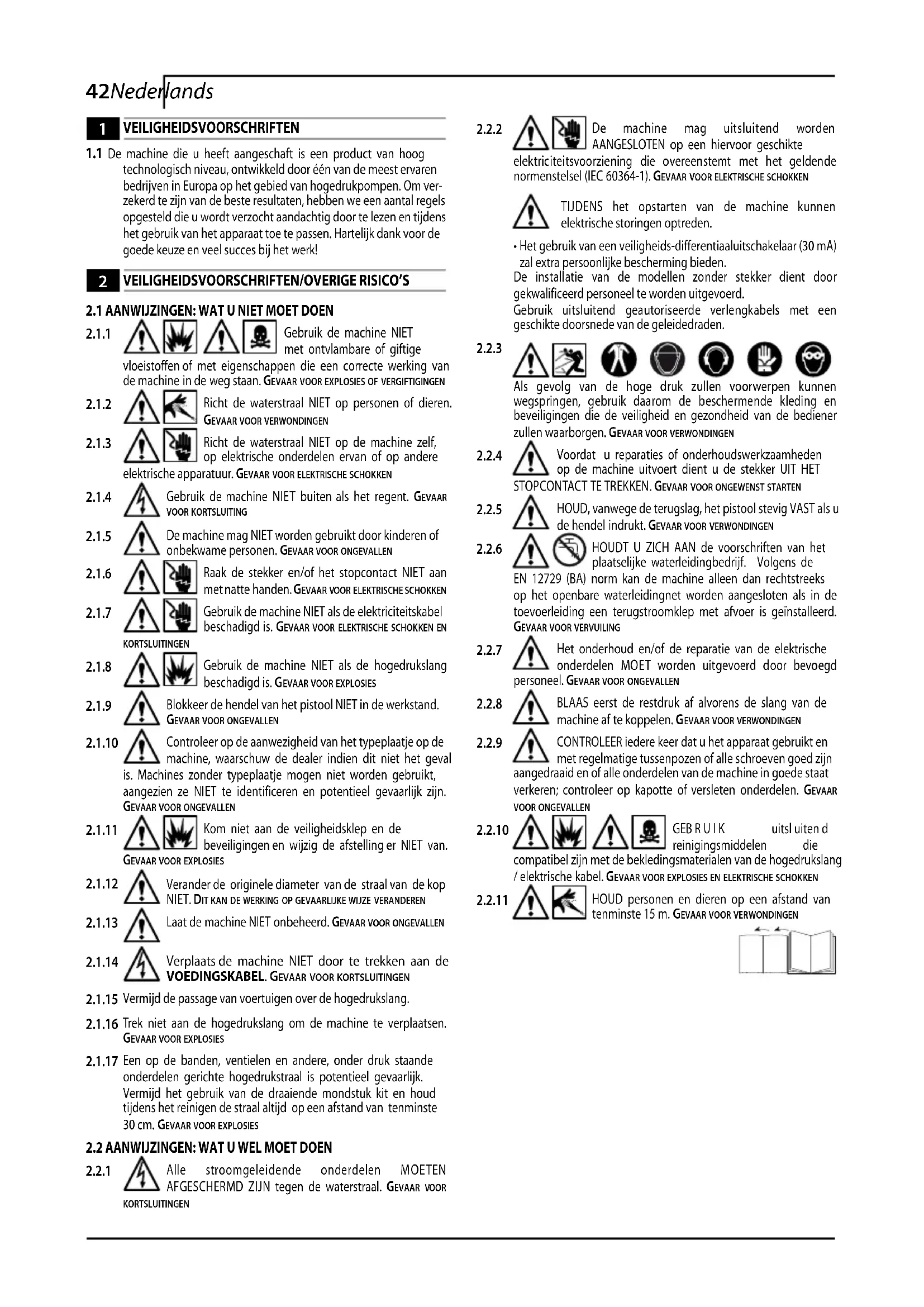 CONTROLEER iedere keer dat u het apparaat gebruikt en met regelmatige tussenpozen of alle schroeven goed zijn aangedraaid en of alle onderdelen van de machine in goede staat verkeren; controleer op kapotte of versleten onderdelen. gevaar voor ongevallen GEB R U I K uitsl uiten d reinigingsmiddelen die compatibel zijn met de bekledingsmaterialen van de hogedrukslang / elektrische kabel. gevaar voor explosies en elektrische schokken