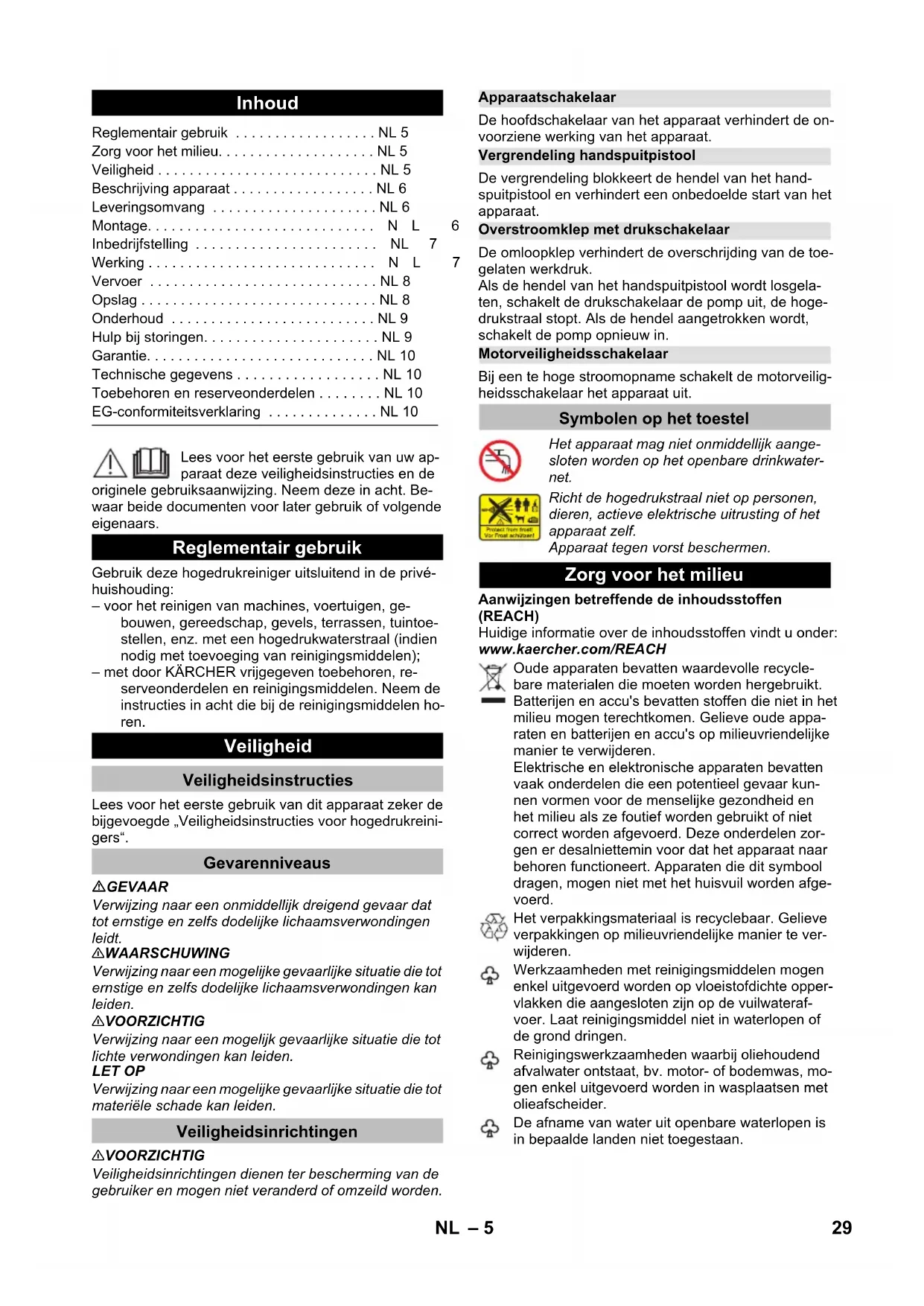 92 dB(A) Con riserva di modifiche tecniche. Accessori e ricambi Dichiarazione di conformità CE Prodotto: Idropulitrice Modelo: 1.324-xxx Direttive CE pertinenti 2000/14/CE 2014/30/UE 2006/42/CE (+2009/127/CE) 2011/65/UE Norme armonizzate applicate EN 50581 EN 55014–1: 2006+A1: 2009+A2: 2011 EN 55014–2: 1997+A1: 2001+A2: 2008 EN 60335–1 EN 60335–2–79 EN 61000–3–2: 2014 EN 61000–3–3: 2013 EN 62233: 2008 Procedura di valutazione della conformità applicata 2000/14/CE: Allegato V Livello di potenza sonora dB(A) Misurato: 89 Garantito: 92 Winnenden, 2016/01/01 CEO Head of Approbation 28 IT– 5 Lees voor het eerste gebruik van uw ap- paraat deze veiligheidsinstructies en de originele gebruiksaanwijzing. Neem deze in acht. Be- waar beide documenten voor later gebruik of volgende eigenaars. Gebruik deze hogedrukreiniger uitsluitend in de privé- huishouding: – voor het reinigen van machines, voertuigen, ge- bouwen, gereedschap, gevels, terrassen, tuintoe- stellen, enz. met een hogedrukwaterstraal (indien nodig met toevoeging van reinigingsmiddelen); – met door KÄRCHER vrijgegeven toebehoren, re- serveonderdelen en reinigingsmiddelen. Neem de instructies in acht die bij de reinigingsmiddelen ho- ren. Lees voor het eerste gebruik van dit apparaat zeker de bijgevoegde „Veiligheidsinstructies voor hogedrukreini- gers“. GEVAAR Verwijzing naar een onmiddellijk dreigend gevaar dat tot ernstige en zelfs dodelijke lichaamsverwondingen leidt. 몇 WAARSCHUWING Verwijzing naar een mogelijke gevaarlijke situatie die tot ernstige en zelfs dodelijke lichaamsverwondingen kan leiden. 몇 VOORZICHTIG Verwijzing naar een mogelijk gevaarlijke situatie die tot lichte verwondingen kan leiden. LET OP Verwijzing naar een mogelijke gevaarlijke situatie die tot materiële schade kan leiden. 몇 VOORZICHTIG Veiligheidsinrichtingen dienen ter bescherming van de gebruiker en mogen niet veranderd of omzeild worden. De hoofdschakelaar van het apparaat verhindert de on- voorziene werking van het apparaat. De vergrendeling blokkeert de hendel van het hand- spuitpistool en verhindert een onbedoelde start van het apparaat. De omloopklep verhindert de overschrijding van de toe- gelaten werkdruk. Als de hendel van het handspuitpistool wordt losgela- ten, schakelt de drukschakelaar de pomp uit, de hoge- drukstraal stopt. Als de hendel aangetrokken wordt, schakelt de pomp opnieuw in. Bij een te hoge stroomopname schakelt de motorveilig- heidsschakelaar het apparaat uit. Aanwijzingen betreffende de inhoudsstoffen (REACH) Huidige informatie over de inhoudsstoffen vindt u onder: www.kaercher.com/REACH Inhoud Reglementair gebruik . . . . . . . . . . . . . . . . . . NL 5 Zorg voor het milieu. . . . . . . . . . . . . . . . . . . . NL 5 Veiligheid . . . . . . . . . . . . . . . . . . . . . . . . . . . . NL 5 Beschrijving apparaat . . . . . . . . . . . . . . . . . . NL 6 Leveringsomvang . . . . . . . . . . . . . . . . . . . . . NL 6 Montage. . . . . . . . . . . . . . . . . . . . . . . . . . . . .NL 6 Inbedrijfstelling . . . . . . . . . . . . . . . . . . . . . . . NL 7 Werking . . . . . . . . . . . . . . . . . . . . . . . . . . . . .NL 7 Vervoer . . . . . . . . . . . . . . . . . . . . . . . . . . . . . NL 8 Opslag . . . . . . . . . . . . . . . . . . . . . . . . . . . . . . NL 8 Onderhoud . . . . . . . . . . . . . . . . . . . . . . . . . . NL 9 Hulp bij storingen. . . . . . . . . . . . . . . . . . . . . . NL 9 Garantie. . . . . . . . . . . . . . . . . . . . . . . . . . . . . NL 10 Technische gegevens . . . . . . . . . . . . . . . . . . NL 10 Toebehoren en reserveonderdelen . . . . . . . . NL 10 EG-conformiteitsverklaring . . . . . . . . . . . . . . NL 10 Reglementair gebruik Veiligheid Veiligheidsinstructies Gevarenniveaus Veiligheidsinrichtingen Apparaatschakelaar Vergrendeling handspuitpistool Overstroomklep met drukschakelaar Motorveiligheidsschakelaar Symbolen op het toestel Het apparaat mag niet onmiddellijk aange- sloten worden op het openbare drinkwater- net. Richt de hogedrukstraal niet op personen, dieren, actieve elektrische uitrusting of het apparaat zelf. Apparaat tegen vorst beschermen. Zorg voor het milieu Oude apparaten bevatten waardevolle recycle- bare materialen die moeten worden hergebruikt. Batterijen en accu's bevatten stoffen die niet in het milieu mogen terechtkomen. Gelieve oude appa- raten en batterijen en accu's op milieuvriendelijke manier te verwijderen. Elektrische en elektronische apparaten bevatten vaak onderdelen die een potentieel gevaar kun- nen vormen voor de menselijke gezondheid en het milieu als ze foutief worden gebruikt of niet correct worden afgevoerd. Deze onderdelen zor- gen er desalniettemin voor dat het apparaat naar behoren functioneert. Apparaten die dit symbool dragen, mogen niet met het huisvuil worden afge- voerd. Het verpakkingsmateriaal is recyclebaar. Gelieve verpakkingen op milieuvriendelijke manier te ver- wijderen. Werkzaamheden met reinigingsmiddelen mogen enkel uitgevoerd worden op vloeistofdichte opper- vlakken die aangesloten zijn op de vuilwateraf- voer. Laat reinigingsmiddel niet in waterlopen of de grond dringen. Reinigingswerkzaamheden waarbij oliehoudend afvalwater ontstaat, bv. motor- of bodemwas, mo- gen enkel uitgevoerd worden in wasplaatsen met olieafscheider. De afname van water uit openbare waterlopen is in bepaalde landen niet toegestaan. 29NL– 6 In deze gebruiksaanwijzing staat de maximale uitrusting omschreven. Afhankelijk van het model zijn er verschil- len in de leveringspakketten (zie verpakking). Afbeeldingen zie uitklappagina 4 1 Koppelinggedeelte voor wateraansluiting 2 Wateraansluiting met ingebouwde zeef 3 Hogedrukslang 4 Slanggeleiding 5 Opbergvak voor straalbuizen 6 Opbergvak / parkeerpositie van het handspuitpi- stool 7 Aansluiting voor Plug 'n' Clean-reinigingsmiddel 8 Handgreep 9 Transportgreep, uittrekbaar 10 Slanghouder 11 Hogedrukaansluiting 12 Hoofdschakelaar „0/OFF“ / „I/ON“ 13 Stroomleiding met stekker 14 Accessoir