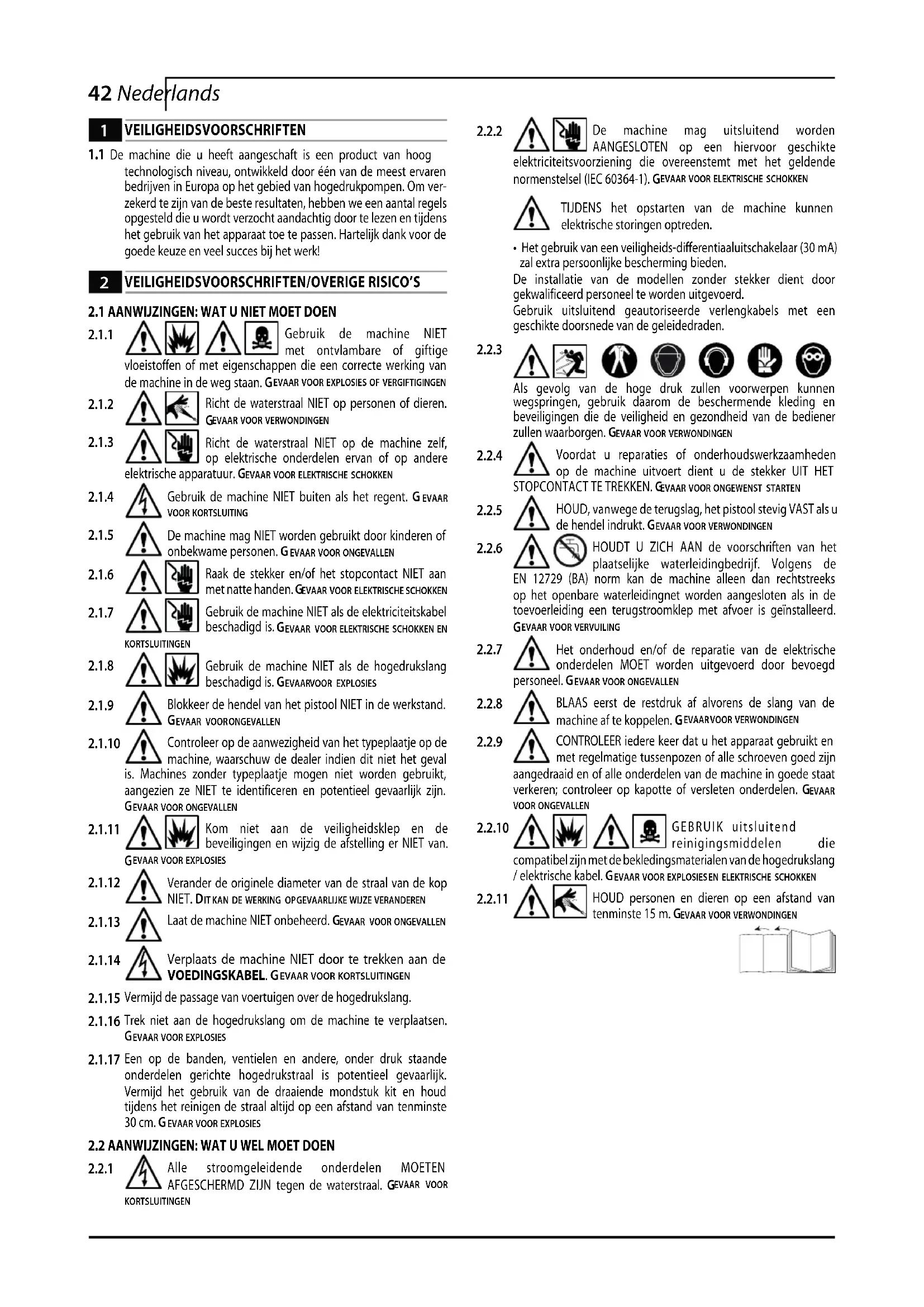 Alle stroomgeleidende onderdelen MOETEN AFGESCHERMD ZIJN tegen de waterstraal. GEVAAR VOOR KORTSLUITINGEN De machine mag uitsluitend worden AANGESLOTEN op een hiervoor geschikte elektriciteitsvoorziening die overeenstemt met het geldende normenstelsel (IEC 60364-1). GEVAAR VOOR ELEKTRISCHE SCHOKKENTIJDENS het opstarten van de machine kunnen elektrische storingen optreden.• Het gebruik van een veiligheids-differentiaaluitschakelaar (30 mA) zal extra persoonlijke bescherming bieden.De installatie van de modellen zonder stekker dient door gekwalificeerd personeel te worden uitgevoerd.Gebruik uitsluitend geautoriseerde verlengkabels met een geschikte doorsnede van de geleidedraden. Als gevolg van de hoge druk zullen voorwerpen kunnen wegspringen, gebruik daarom de beschermende kleding en beveiligingen die de veiligheid en gezondheid van de bediener zullen waarborgen. GEVAAR VOOR VERWONDINGEN Voordat u reparaties of onderhoudswerkzaamheden op de machine uitvoert dient u de stekker UIT HET STOPCONTACT TE TREKKEN. GEVAAR VOOR ONGEWENST STARTEN HOUD, vanwege de terugslag, het pistool stevig VAST als u de hendel indrukt. GEVAAR VOOR VERWONDINGEN HOUDT U ZICH AAN de voorschriften van het plaatselijke waterleidingbedrijf. Volgens de EN 12729 (BA) norm kan de machine alleen dan rechtstreeks op het openbare waterleidingnet worden aangesloten als in de toevoerleiding een terugstroomklep met afvoer is geïnstalleerd. EVAAR VOOR VERVUILING Het onderhoud en/of de reparatie van de elektrische onderdelen MOET worden uitgevoerd door bevoegd personeel. GEVAAR VOOR ONGEVALLEN BLAAS eerst de restdruk af alvorens de slang van de machine af te koppelen. GEVAAR VOOR VERWONDINGEN CONTROLEER iedere keer dat u het apparaat gebruikt en met regelmatige tussenpozen of alle schroeven goed zijn aangedraaid en of alle onderdelen van de machine in goede staat verkeren; controleer op kapotte of versleten onderdelen. GEVAAR VOOR ONGEVALLEN GEBRUIK uitsluitend reinigingsmiddelen die compatibel zijn met de bekledingsmaterialen van de hogedrukslang / elektrische kabel. GEVAAR VOOR EXPLOSIES