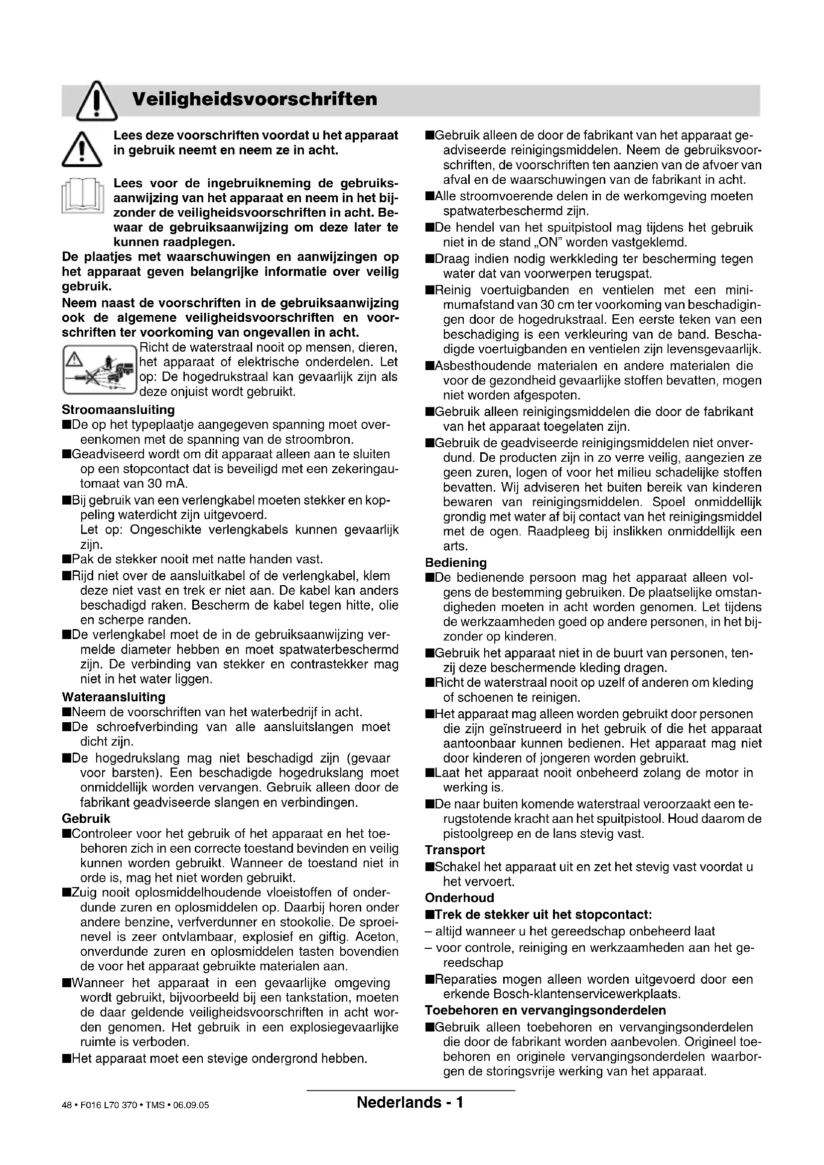 ga- rantito è minore di 91 dB (A). Procedimento di valu- tazione della conformità secondo appendice VIII. Leinfelden, 01.11.2004. Dr. Egbert Schneider Dr. Eckerhard Strötgen Senior Vice President Head of Product Engineering Certification Robert Bosch GmbH, Power Tools Division Con riserva di modifiche Misure ecologiche Smaltimento Centro di Assistenza Clienti Dichiarazione di conformità F016 L70 370.book Seite 7 Donnerstag, 29. September 2005 10:40 10 47 • F016 L70 370 • TMS • 06.09.05Nederlands - 1 Lees deze voorschriften voordat u het apparaat in gebruik neemt en neem ze in acht. Lees voor de ingebruikneming de gebruiks- aanwijzing van het apparaat en neem in het bij- zonder de veiligheidsvoorschriften in acht. Be- waar de gebruiksaanwijzing om deze later te kunnen raadplegen. De plaatjes met waarschuwingen en aanwijzingen op het apparaat geven belangrijke informatie over veilig gebruik. Neem naast de voorschriften in de gebruiksaanwijzing ook de algemene veiligheidsvoorschriften en voor- schriften ter voorkoming van ongevallen in acht. Richt de waterstraal nooit op mensen, dieren, het apparaat of elektrische onderdelen. Let op: De hogedrukstraal kan gevaarlijk zijn als deze onjuist wordt gebruikt. Stroomaansluiting ■ De op het typeplaatje aangegeven spanning moet over- eenkomen met de spanning van de stroombron. ■ Geadviseerd wordt om dit apparaat alleen aan te sluiten op een stopcontact dat is beveiligd met een zekeringau- tomaat van 30 mA. ■ Bij gebruik van een verlengkabel moeten stekker en kop- peling waterdicht zijn uitgevoerd. Let op: Ongeschikte verlengkabels kunnen gevaarlijk zijn. ■ Pak de stekker nooit met natte handen vast. ■ Rijd niet over de aansluitkabel of de verlengkabel, klem deze niet vast en trek er niet aan. De kabel kan anders beschadigd raken. Bescherm de kabel tegen hitte, olie en scherpe randen. ■ De verlengkabel moet de in de gebruiksaanwijzing ver- melde diameter hebben en moet spatwaterbeschermd zijn. De verbinding van stekker en contrastekker mag niet in het water liggen. Wateraansluiting ■ Neem de voorschriften van het waterbedrijf in acht. ■ De schroefverbinding van alle aansluitslangen moet dicht zijn. ■ De hogedrukslang mag niet beschadigd zijn (gevaar voor barsten). Een beschadigde hogedrukslang moet onmiddellijk worden vervangen. Gebruik alleen door de fabrikant geadviseerde slangen en verbindingen. Gebruik ■ Controleer voor het gebruik of het apparaat en het toe- behoren zich in een correcte toestand bevinden en veilig kunnen worden gebruikt. Wanneer de toestand niet in orde is, mag het niet worden gebruikt. ■ Zuig nooit oplosmiddelhoudende vloeistoffen of onder- dunde zuren en oplosmiddelen op. Daarbij horen onder andere benzine, verfverdunner en stookolie. De sproei- nevel is zeer ontvlambaar, explosief en giftig. Aceton, onverdunde zuren en oplosmiddelen tasten bovendien de voor het apparaat gebruikte materialen aan. ■ Wanneer het apparaat in een gevaarlijke omgeving wordt gebruikt, bijvoorbeeld bij een tankstation, moeten de daar geldende veiligheidsvoorschriften in acht wor- den genomen. Het gebruik in een explosiegevaarlijke ruimte is verboden. ■ Het apparaat moet een stevige ondergrond hebben. ■ Gebruik alleen de door de fabrikant van het apparaat ge- adviseerde reinigingsmiddelen. Neem de gebruiksvoor- schriften, de voorschriften ten aanzien van de afvoer van afval en de waarschuwingen van de fabrikant in acht. ■ Alle stroomvoerende delen in de werkomgeving moeten spatwaterbeschermd zijn. ■ De hendel van het spuitpistool mag tijdens het gebruik niet in de stand „ON” worden vastgeklemd. ■ Draag indien nodig werkkleding ter bescherming tegen water dat van voorwerpen terugspat. ■ Reinig voertuigbanden en ventielen met een mini- mumafstand van 30 cm ter voorkoming van beschadigin- gen door de hogedrukstraal. Een eerste teken van een beschadiging is een verkleuring van de band. Bescha- digde voertuigbanden en ventielen zijn levensgevaarlijk. ■ Asbesthoudende materialen en andere materialen die voor de gezondheid gevaarlijke stoffen bevatten, mogen niet worden afgespoten. ■ Gebruik alleen reinigingsmiddelen die door de fabrikant van het apparaat toegelaten zijn. ■ Gebruik de geadviseerde reinigingsmiddelen niet onver- dund. De producten zijn in zo verre veilig, aangezien ze geen zuren, logen of voor het milieu schadelijke stoffen bevatten. Wij adviseren het buiten bereik van kinderen bewaren van reinigingsmiddelen. Spoel onmiddellijk grondig met water af bij contact van het reinigingsmiddel met de ogen. Raadpleeg bij inslikken onmiddellijk een arts. Bediening ■ De bedienende persoon mag het apparaat alleen vol- gens de bestemming gebruiken. De plaatselijke omstan- digheden moeten in acht worden genomen. Let tijdens de werkzaamheden goed op andere personen, in het bij- zonder op kinderen. ■ Gebruik het apparaat niet in de buurt van personen, ten- zij deze beschermende kleding dragen. ■ Richt de waterstraal nooit op uzelf of anderen om kleding of schoenen te reinigen. ■ Het apparaat mag alleen worden gebruikt door personen die zijn geïnstrueerd in het gebruik of die het apparaat aantoonbaar kunnen bedienen. Het apparaat mag niet door kinderen of jongeren worden gebruikt. ■ Laat het apparaat nooit onbeheerd zolang de motor in werking is. ■ De naar buiten komende waterstraal veroorzaakt een te- rugstotende kracht aan het spuitpistool. Houd daarom de pistoolgreep en de lans stevig vast. Transport ■ Schakel het apparaat uit en zet het stevig vast voordat u het vervoert. Onderhoud ■ Trek de stekker uit het stopcontact: – altijd wanneer u het gereedschap onbeheerd laat – voor controle, reiniging en werkzaamheden aan het ge- reedschap ■ Reparaties mogen alleen worden uitgevoerd door een erkende Bosch-klantenservicewerkplaats. Toebehoren en vervangingsonderdelen ■ Gebruik alleen toebehoren en vervangingsonderdelen die door de fabrikant worden aanbevolen. Origineel toe- behoren e