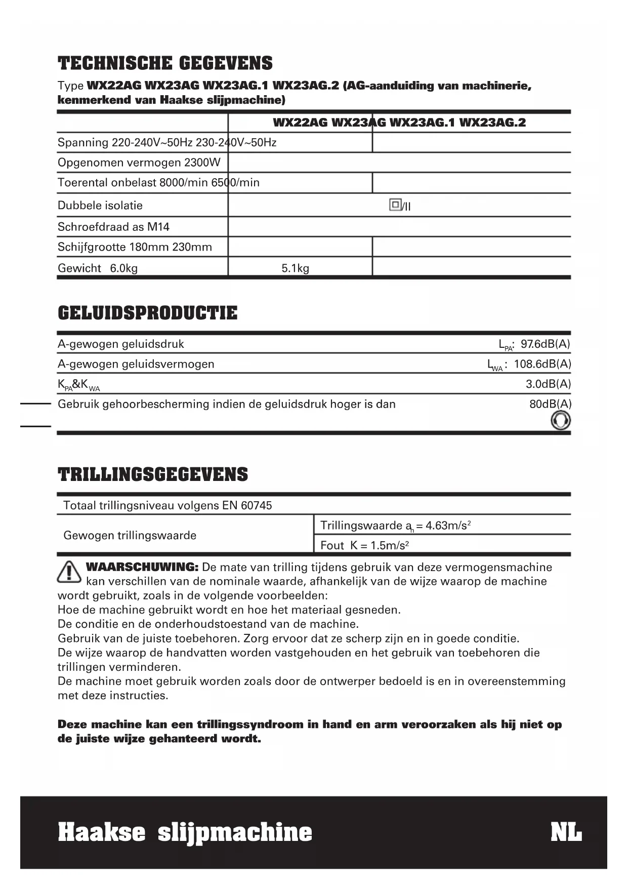 C of minder. Plan de werkzaamheden zodat de taken met veel trillingen over een aantal dagen verspreid worden. ACCESSOIRES Stelsleutel 1 Trillingsvrije extra handgreep 1 Metalen slijpschijf (WX22AG WX23AG WX23AG.1) 1 Wij adviseren u alle accessoires te kopen in de winkel waar u het gereedschap heeft gekocht. Gebruik producten van goede kwaliteit met een bekende merknaam. Gebruik de kwaliteit die u voor de klus nodig heeft. Kijk op de verpakking van het accessoire voor meer informatie. Ook het winkelpersoneel kan u helpen en adviseren.Haakse slijpmachine NL