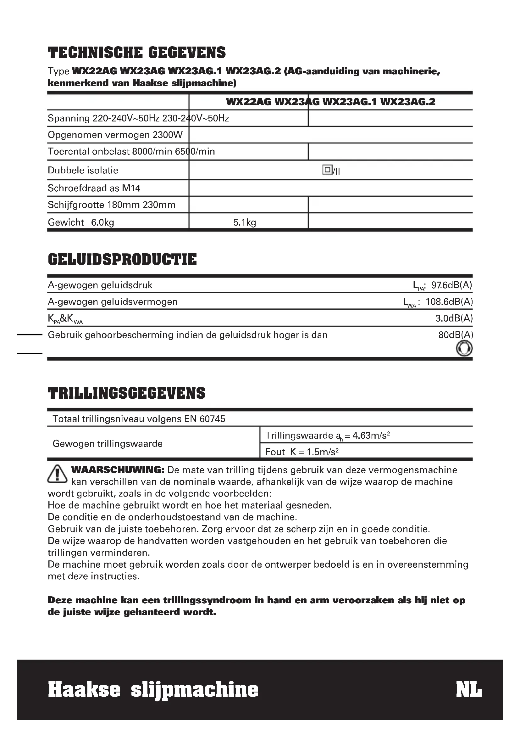 C of minder. Plan de werkzaamheden zodat de taken met veel trillingen over een aantal dagen verspreid worden. ACCESSOIRES Stelsleutel 1 Trillingsvrije extra handgreep 1 Metalen slijpschijf (WX22AG WX23AG WX23AG.1) 1 Wij adviseren u alle accessoires te kopen in de winkel waar u het gereedschap heeft gekocht. Gebruik producten van goede kwaliteit met een bekende merknaam. Gebruik de kwaliteit die u voor de klus nodig heeft. Kijk op de verpakking van het accessoire voor meer informatie. Ook het winkelpersoneel kan u helpen en adviseren.Haakse slijpmachine NL
