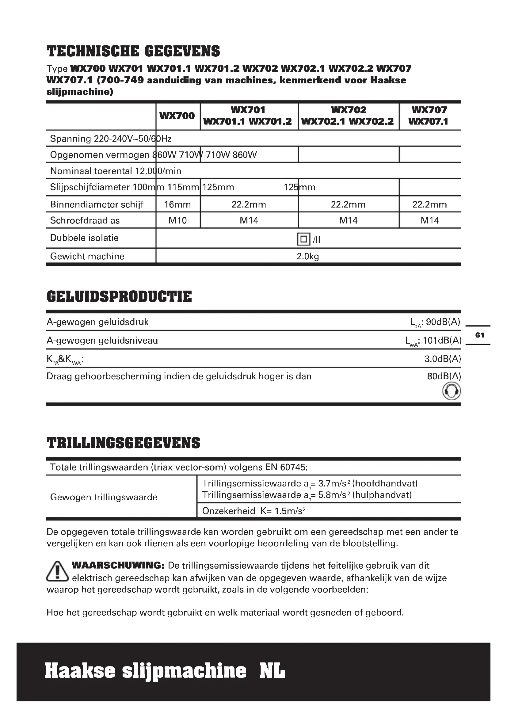 - Niet alle afgebeelde of beschreven toebehoren worden standaard meegeleverd. Haakse slijpmachine NL6160 Haakse slijpmachine NL TECHNISCHE GEGEVENS Type WX700 WX701 WX701.1 WX701.2 WX702 WX702.1 WX702.2 WX707 WX707.1 (700-749 aanduiding van machines, kenmerkend voor Haakse slijpmachine) WX700 WX701 WX701.1 WX701.2 WX702 WX702.1 WX702.2 WX707 WX707.1 Spanning 220-240V~50/60Hz Opgenomen vermogen 860W 710W 710W 860W Nominaal toerental 12,000/min Slijpschijfdiameter 100mm 115mm 125mm 125mm Binnendiameter schijf 16mm 22.2mm 22.2mm 22.2mm Schroefdraad as M10 M14 M14 M14 Dubbele isolatie /II Gewicht machine 2.0kg GELUIDSPRODUCTIE A-gewogen geluidsdruk L