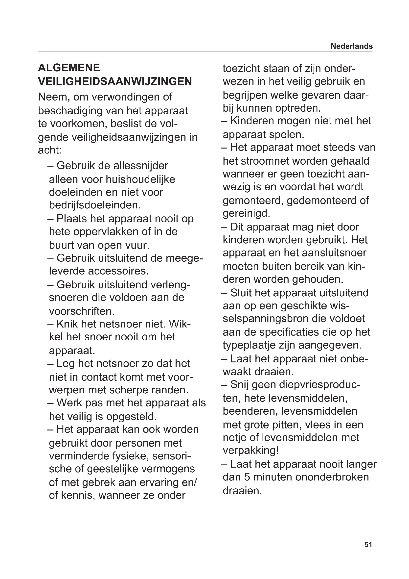 Simbolo Spiegazione Marcatura CE: il prodotto è conforme ai requisiti applicabili dell'Unione Europea. Il prodotto è stato immesso sul mercato successiva- mente al 13 agosto 2005. Non deve essere smaltito con i normali riuti domestici. Il simbolo che rappresenta un cassonetto barrato indica la necessità di raccolta dierenziata. Idoneo al contatto con alimenti. Apparecchio di classe di protezione II51 ALGEMENE VEILIGHEIDSAANWIJZINGEN Neem, om verwondingen of beschadiging van het apparaat te voorkomen, beslist de vol- gende veiligheidsaanwijzingen in acht: – Gebruik de allessnijder alleen voor huishoudelijke doeleinden en niet voor bedrijfsdoeleinden. – Plaats het apparaat nooit op hete oppervlakken of in de buurt van open vuur. – Gebruik uitsluitend de meege- leverde accessoires. – Gebruik uitsluitend verleng- snoeren die voldoen aan de voorschriften. – Knik het netsnoer niet. Wik- kel het snoer nooit om het apparaat. – Leg het netsnoer zo dat het niet in contact komt met voor- werpen met scherpe randen. – Werk pas met het apparaat als het veilig is opgesteld. – Het apparaat kan ook worden gebruikt door personen met verminderde fysieke, sensori- sche of geestelijke vermogens of met gebrek aan ervaring en/ of kennis, wanneer ze onder toezicht staan of zijn onder