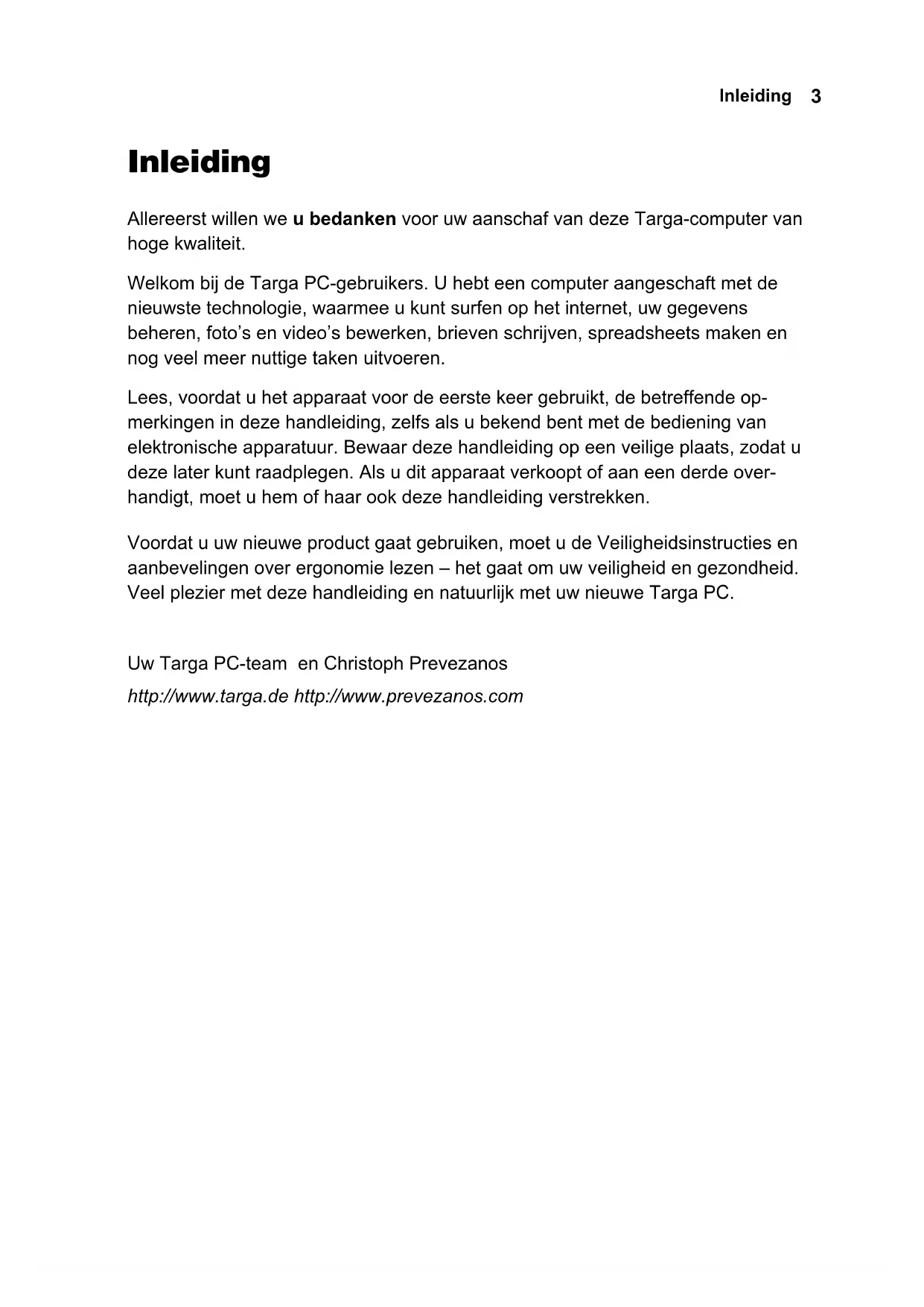 Welkom bij de Targa PC-gebruikers. U hebt een computer aangeschaft met de新模式ste technologie, waarmee u kurz surfen op het internet, uw geveens beheren, Foto's en video's bewerken, brieven schrijven, spreadsheets make en nog veel meer nuttige taken uitvoeren.