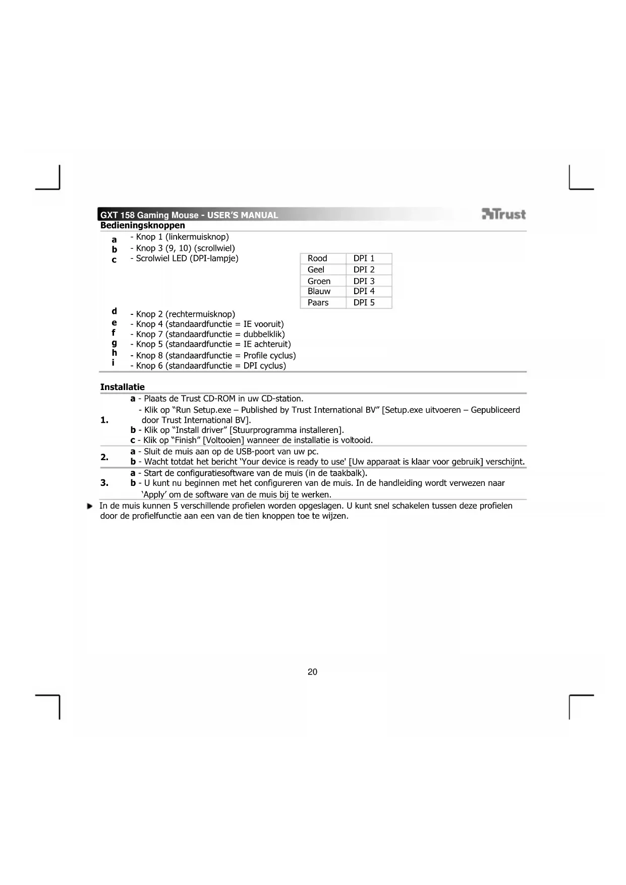 Rood DPI 1 Geel DPI 2 Groen DPI 3 Blauw DPI 4 Paars DPI 5 - Knop 2 (rechtermuisknop) - Knop 4 (standaardfunctie = IE vooruit) - Knop 7 (standaardfunctie = dubbelklik) - Knop 5 (standaardfunctie = IE achteruit) - Knop 8 (standaardfunctie = Profile cyclus) - Knop 6 (standaardfunctie = DPI cyclus)