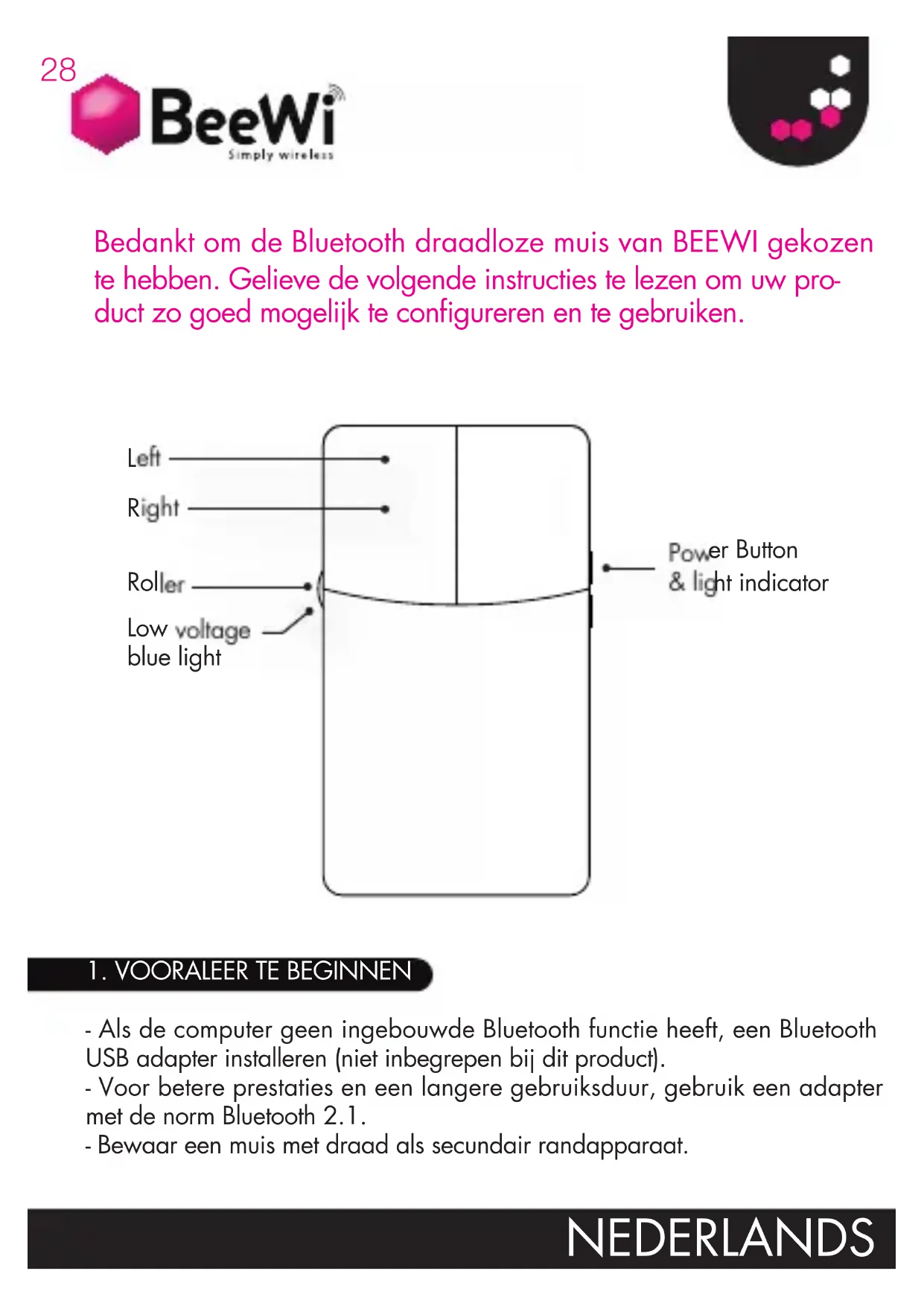 Left Power Button & light indicator Right Roller Low voltage blue light29 NEDERLANDS - De lasermuizen werken niet op een oppervlak van glas of een spiegel. Vermijd glanzende oppervlakken om goede prestaties te verkrijgen. - Om de transmissieprestaties van het radiosignaal te verbeteren, de muis niet gebruiken op een metalen oppervlak. - De muis aanzetten met de schakelaar aan/uit, die zich op de rechterzijde bevindt, en op de verbindingsknop onder de muis drukken om ze zichtbaar te maken. - Het Bluetooth softwareprogramma op de computer opstarten en de instructies volgen om de randapparaten op afstand te zoeken en aan te koppelen. - Zodra het zoeken van randapparaten voltooid is, de muis BeeWi BBM300 selecteren om de koppeling en de verbinding te bevestigen. - Nota: aangezien de muis geen koppelcode nodig heeft, moet deze optie eventueel gedeactiveerd worden in het Bluetooth softwareprogramma. - Zodra de muis aangekoppeld is, zal zij automatisch verbonden worden met de computer nadat zij uit- en opnieuw aangezet werd. - De muis schakelt automatisch over naar de modus waaktoestand indien zij niet gebruikt wordt gedurende 10 minuten, als de Bluetooth verbinding verloren is gegaan of als de computer uitgezet werd. De muis wordt gereactiveerd gewoon door op de linkerknop te dubbelklikken. - Als de verbinding met de muis verbroken wordt tijdens haar gebruik of als de koppelingsknop per vergissing ingedrukt wordt, de Bluetooth software gebruiken om de verbinding met de muis te herstellen. - Wanneer de muis aan staat, wordt het kartelwieltje blauw verlicht. - Wanneer de muis verbonden is met de USB-poort om heropgeladen te worden, wordt de rechterkant van de muis roze verlicht.