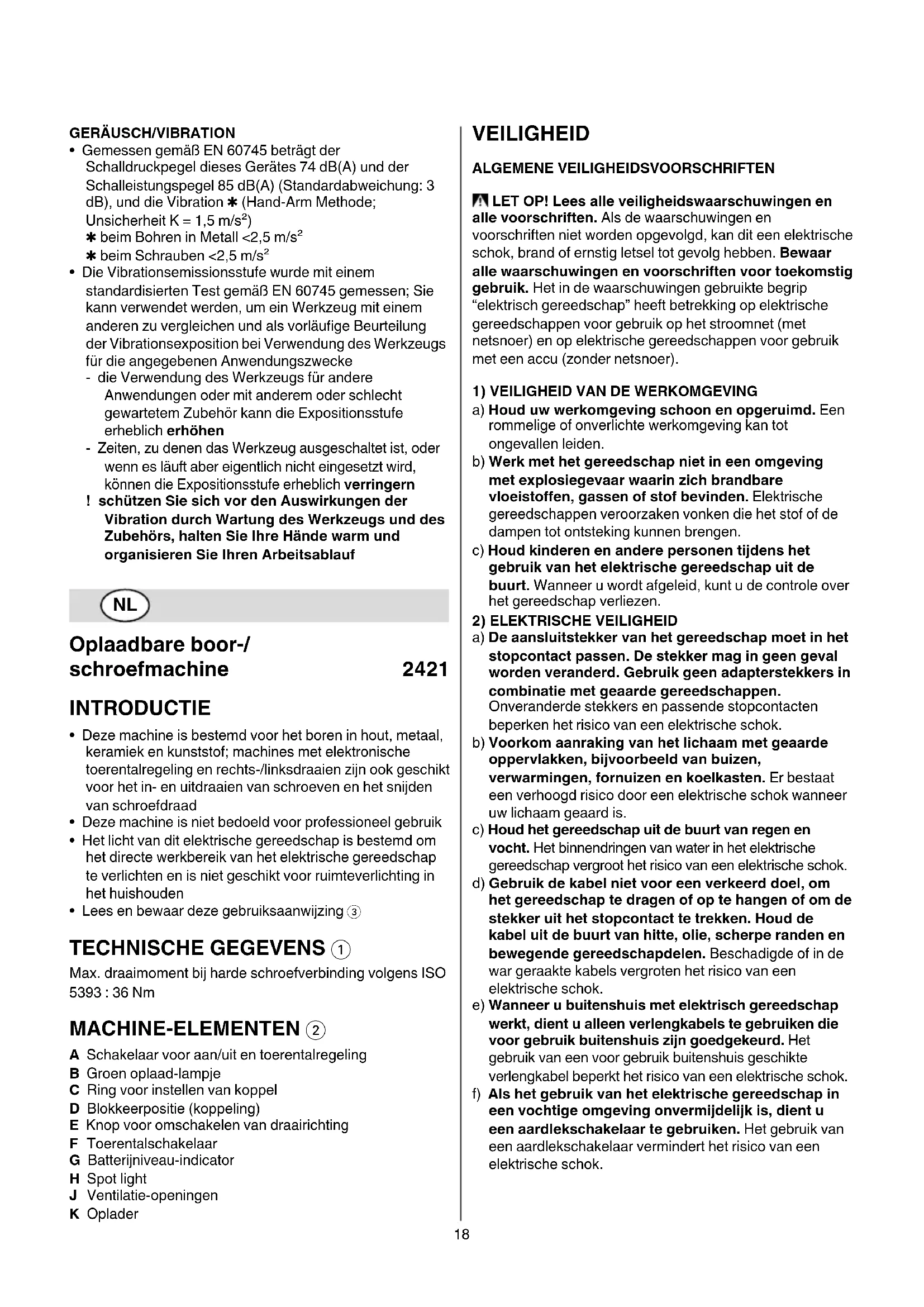 - Lees en bewaar deze gebruiksaanwijzing 3 TECHNISCHE GEGEVENS 1 Max. draaimoment bij harde schroefverbinding volgens ISO 5393 : 36 Nm MACHINE-ELEMENTEN 2 A Schakelaar voor aan/uit en toerentalregeling B Groen oplaad-lampje C Ring voor instellen van koppel D Blokkeerpositie (koppeling) E Knop voor omschakelen van draairichting F Toerentalschakelaar G Batterijniveau-indicator H Spot light J Ventilatie-openingen K Oplader VEILIGHEID ALGEMENE VEILIGHEIDSVOORSCHRIFTEN LET OP! Lees alle veiligheidswaarschuwingen en alle voorschriften. Als de waarschuwingen en voorschriften niet worden opgevolgd, kan dit een elektrische schok, brand of ernstig letsel tot gevolg hebben. Bewaar alle waarschuwingen en voorschriften voor toekomstig gebruik. Het in de waarschuwingen gebruikte begrip “elektrisch gereedschap” heeft betrekking op elektrische gereedschappen voor gebruik op het stroomnet (met netsnoer) en op elektrische gereedschappen voor gebruik met een accu (zonder netsnoer).