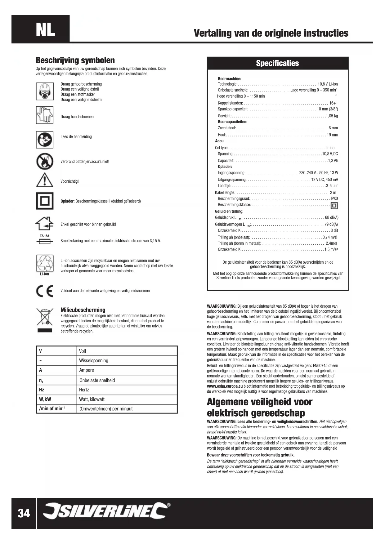 Onzekerheid K:..........................................1,5 m/s² De geluidsintensiteit voor de bediener kan 85 dB(A) overschrijden en de gehoorbescherming is noodzakelijk. Met het oog op onze aanhoudende productontwikkeling kunnen de specificaties van Silverline Tools producten zonder voorafgaande kennisgeving worden gewijzigd. Beschrijving symbolen Op het gegevensplaatje van uw gereedschap kunnen zich symbolen bevinden. Deze vertegenwoordigen belangrijke productinformatie en gebruiksinstructies Draag gehoorbescherming Draag een veiligheidsbril Draag een stofmaskerDraag een veiligheidshelm Draag handschoenen Lees de handleiding Verbrand batterijen/accu’s niet!Voorzichtig!Oplader: Beschermingsklasse II (dubbel geïsoleerd)Enkel geschikt voor binnen gebruik!Smeltzekering met een maximale elektrische stroom van 3,15 A.Li-ion accucellen zijn recyclebaar en mogen niet samen met uw huishoudelijk afval weggegooid worden. Neem contact op met uw lokale verkoper of gemeente voor meer recycleadvies.Voldoet aan de relevante wetgeving en veiligheidsnormenMilieubescherming Elektrische producten mogen niet met het normale huisvuil worden weggegooid. Indien de mogelijkheid bestaat, dient u het product te recyclen. Vraag de plaatselijke autoriteiten of winkelier om advies betreffende recyclen.Li-ion T-130˚ T3.15A V Volt ~ Wisselspanning A Ampère