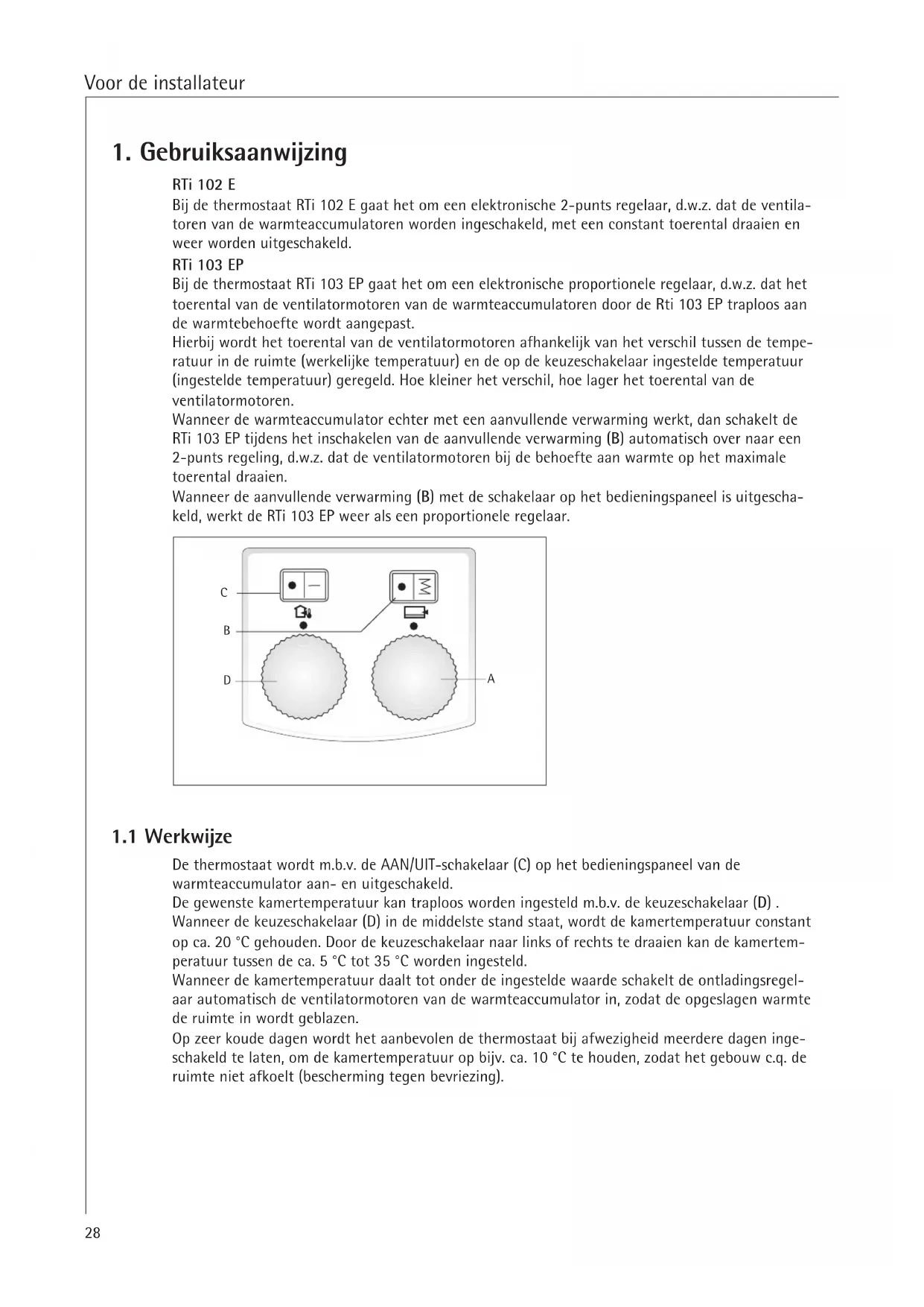 Bij de thermostat RTi 103 EP gaat het om een elektronische proportionele regelaar, d.w.z. dat het toerental van de ventilatormotoren van de warmteaccumulatoren door de Rti 103 EP traploos aan de warmtebehoefte worden aangepast.