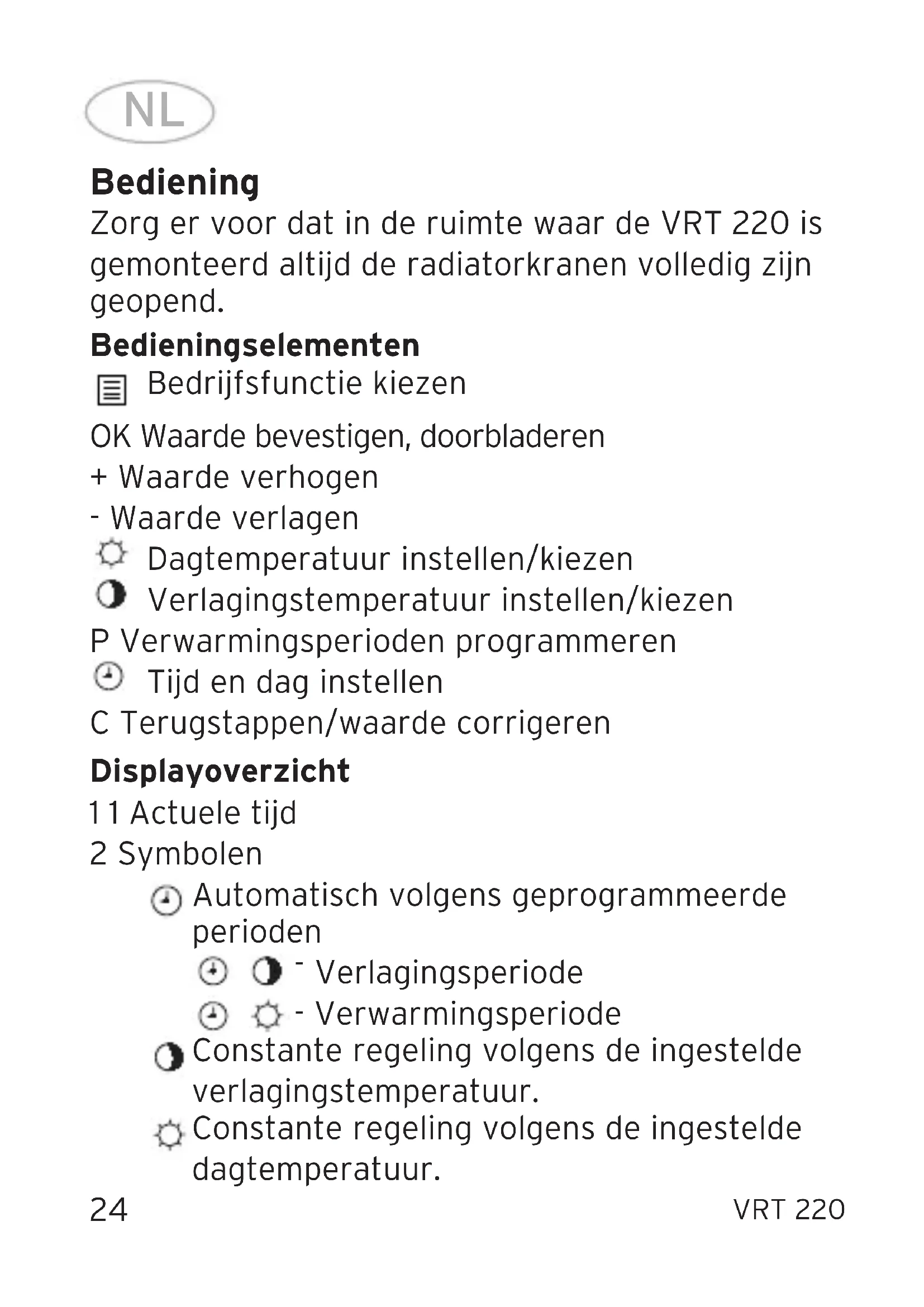 Verlagingsperiode - Verwarmingsperiode Constante regeling volgens de ingestelde verlagingstemperatuur. Constante regeling volgens de ingestelde dagtemperatuur. VRT 220
