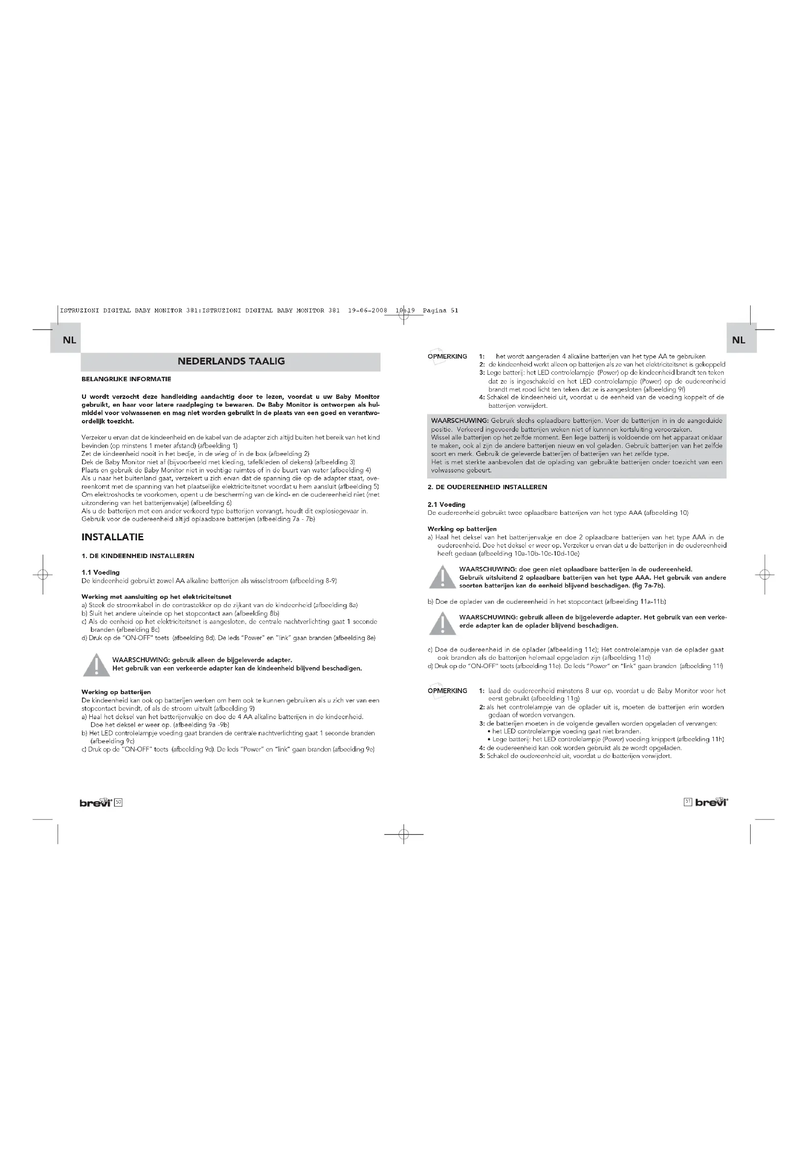 - Lege batterij: het LED controlelampje (Power) voeding knippert (afbeelding 11h) 4: de oudereenheid kan ook worden gebruikt als ze wordt opgeladen. 5: Schakel de oudereenheid uit, voordat u de batterijen verwijdert. NEDERLANDS TAALIG NLNL WAARSCHUWING: Gebruik slechs oplaadbare batterijen. Voer de batterijen in in de aangeduide positie. Verkeerd ingevoerde batterijen weken niet of kunnnen kortsluiting veroorzaken. Wissel alle batterijen op het zelfde moment. Een lege batterij is voldoende om het apparaat onklaar te maken, ook al zijn de andere batterijen nieuw en vol geladen. Gebruik batterijen van het zelfde soort en merk. Gebruik de geleverde batterijen of batterijen van het zelfde type. Het is met sterkte aanbevolen dat de oplading van gebruikte batterijen onder toezicht van een volwassene gebeurt. ISTRUZIONI DIGITAL BABY MONITOR 381:ISTRUZIONI DIGITAL BABY MONITOR 381 19-06-2008 10:19 Pagina 514.3 Het gevoeligheidsniveau van de microfoon instellen Om het gevoeligheidsniveau in te stellen, volgt u deze instructies: