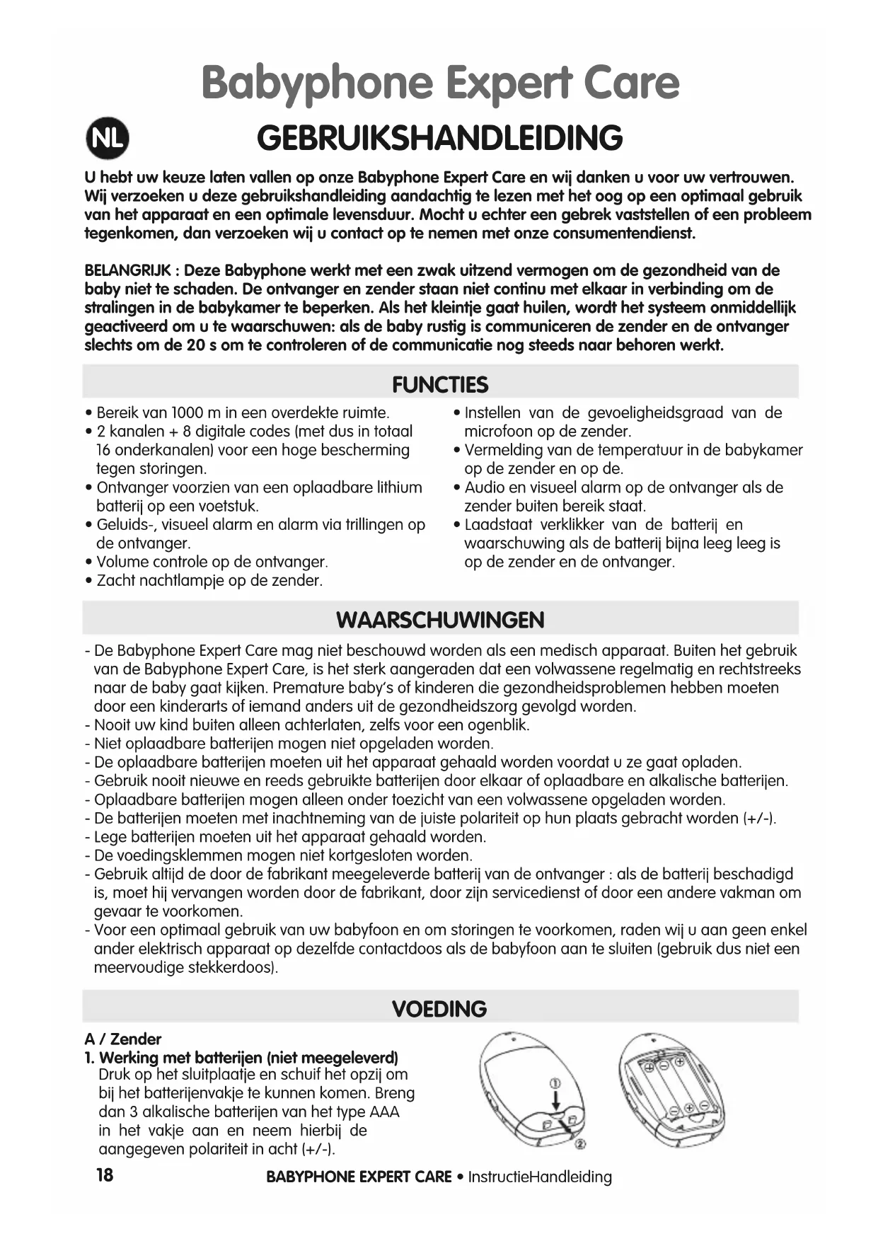 GEBRUIKSHANDLEIDING WAARSCHUWINGEN - De Babyphone Expert Care mag niet beschouwd worden als een medisch apparaat. Buiten het gebruikvan de Babyphone Expert Care, is het sterk aangeraden dat een volwassene regelmatig en rechtstreeksnaar de baby gaat kijken. Premature baby’s of kinderen die gezondheidsproblemen hebben moetendoor een kinderarts of iemand anders uit de gezondheidszorg gevolgd worden. - Nooit uw kind buiten alleen achterlaten, zelfs voor een ogenblik. - Niet oplaadbare batterijen mogen niet opgeladen worden. - De oplaadbare batterijen moeten uit het apparaat gehaald worden voordat u ze gaat opladen. - Gebruik nooit nieuwe en reeds gebruikte batterijen door elkaar of oplaadbare en alkalische batterijen. - Oplaadbare batterijen mogen alleen onder toezicht van een volwassene opgeladen worden. - De batterijen moeten met inachtneming van de juiste polariteit op hun plaats gebracht worden (+/-).- Lege batterijen moeten uit het apparaat gehaald worden. - De voedingsklemmen mogen niet kortgesloten worden. - Gebruik altijd de door de fabrikant meegeleverde batterij van de ontvanger : als de batterij beschadigdis, moet hij vervangen worden door de fabrikant, door zijn servicedienst of door een andere vakman omgevaar te voorkomen. - Voor een optimaal gebruik van uw babyfoon en om storingen te voorkomen, raden wij u aan geen enkelander elektrisch apparaat op dezelfde contactdoos als de babyfoon aan te sluiten (gebruik dus niet eenmeervoudige stekkerdoos). VOEDING A / Zender1. Werking met batterijen (niet meegeleverd)Druk op het sluitplaatje en schuif het opzij ombij het batterijenvakje te kunnen komen. Brengdan 3 alkalische batterijen van het type AAAin het vakje aan en neem hierbij deaangegeven polariteit in acht (+/-). Babyphone Expert Care