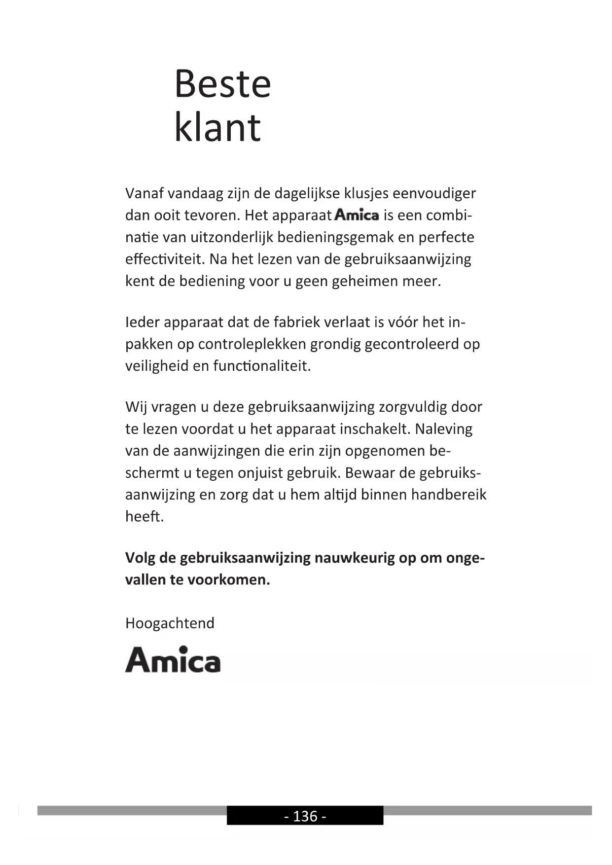 - directive RoHS 2011/65/CE et c’est le pourquoi le produit est désigné par le symbol ainsi qu’une déclaration de la conformité accessible aux organes chargés de la surveillance du marché a été délivrée.- 136 - Beste klant Vanaf vandaag zijn de dagelijkse klusjes eenvoudiger dan ooit tevoren. Het apparaat is een combi- nae van uitzonderlijk bedieningsgemak en perfecte eecviteit. Na het lezen van de gebruiksaanwijzing kent de bediening voor u geen geheimen meer. Ieder apparaat dat de fabriek verlaat is vóór het in- pakken op controleplekken grondig gecontroleerd op veiligheid en funconaliteit. Wij vragen u deze gebruiksaanwijzing zorgvuldig door te lezen voordat u het apparaat inschakelt. Naleving van de aanwijzingen die erin zijn opgenomen be- schermt u tegen onjuist gebruik. Bewaar de gebruiks- aanwijzing en zorg dat u hem aljd binnen handbereik hee. Volg de gebruiksaanwijzing nauwkeurig op om onge- vallen te voorkomen. Hoogachtend- 137 - AANWIJZINGEN BETREF-