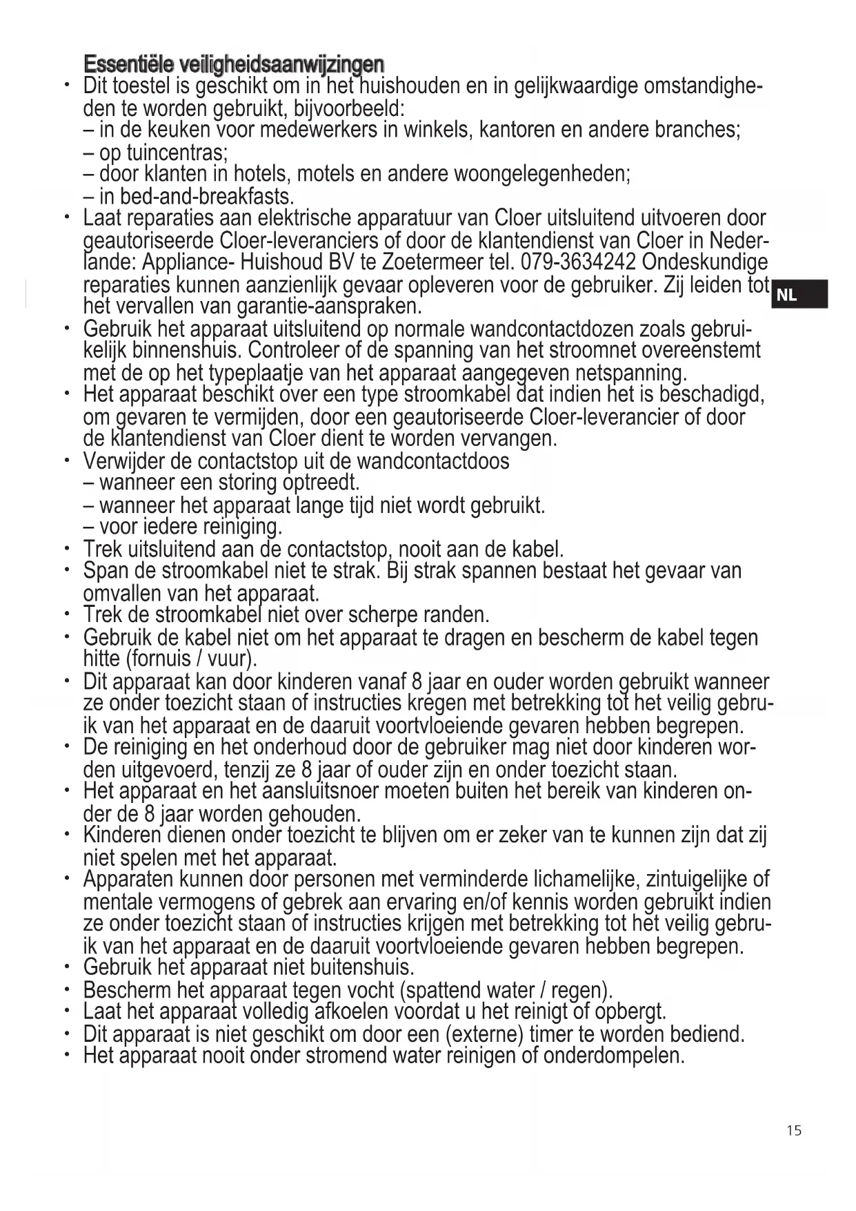 - Laat reparations aan elektrische apparatuur van Cloer uitsluitend uitvoeren door geauthoriseerde Cloer-leveranciers of door de klantendienst van Cloer in Nederlande: Appliance-Huishoud BV te Zoetermeer tel. 079-3634242 Ondeskundige reparations konnen aanzienlijk gevaar opleveren voor de gebruiker. Zij leiden tot het verallen van garantie-aanspraken.