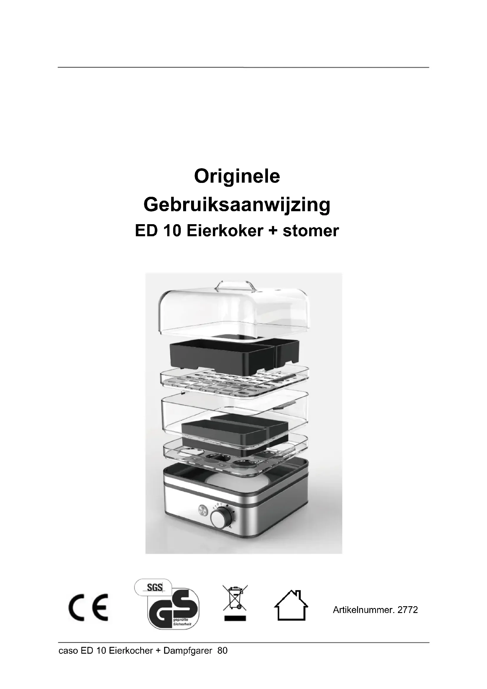 Warmhoudplaat: was de afgekoelde kookplaat met een vochtige doek af. Eierhouder, eierprikker, schalen, steamerhulpstukken, tussenframe en deksel: Eierhouder, eierprikker, schalen, stoomhulpstukken, tussenframe en deksel kunnen onder stromend water met een normaal afwasmiddel worden gereinigd. Droog dit accessoire daarna grondig af. Ontkalken: Om te ontkalken neemt u de deksel er af en doet u er water met een scheut azijn in. Laat dit water kort koken. Storingen verhelpen 57 Afvoer van het oude apparaat Oude elektrische en elektronische apparaten bevatten vaak nog waardvolle materialen. Ze bevatten echter ook schadelijke stoffen, die voor hun functioneren en veiligheid noodzakelijk waren. In het huishoudelijk afval of bij verkeerde behandeling kunnen deze stoffen de menselijke gezondheid en het milieu schade aanbrengen. Zet uw oude apparaat daarom nooit bij het gewone huishoudelijk vuil. TIP ► Maak gebruik van de in uw woonplaats voorhanden zijnde inzamelplek voor teruggave en verwerking van oude elektrische en elektronische apparaten. Haal eventueel informatie bij uw gemeentehuis, de vuilnisophaaldienst of bij uw winkelier.caso ED 10 Eierkocher + Dampfgarer 93 TIP ► Zorg ervoor dat uw oude apparaat tot het moment van transport op een kinderveilige plek wordt bewaard. 58 Garantie Voor dit product geven we vanaf de dag van aankoop 24 maanden garantie op gebreken, die te herleiden zijn tot productie- of materiaalfouten. Garantieclaims volgens §439 ff. BGB-E blijven hiervan van kracht. Onder de garantie vallen niet de schaden die door onjuiste behandeling of ingebruikname ontstaan zijn, zoals gebreken die de functie of de waarde van het apparaat slechts gering beïnvloeden. Verder zijn aan slijtage onderhevige onderdelen, transportschade zo lang wij deze niet te verantwoorden hebben, als ook schaden, die door niet door ons verrichtte reparaties ontstaan zijn, uitgesloten van aanspraak op garantieclaim. Dit apparaat is vervaardigd voor huishoudelijk gebruik (kleinverbruik) en voorzien van een overeenkomstig vermogen. Een eventueel gebruik voor bedrijfsdoeleinden valt alleen onder de garantie, als de mate van gebruik te vergelijken is met het gebruik in een particulier kleinhuishouden. Het is niet voor de verdere bedrijfsdoeleinden bestemd. Bij rechtmatige reclamaties zullen wij het defecte apparaat naar ons bevinden repareren of tegen een apparaat vrij van gebreken omwisselen. Zichtbare defecten moeten binnen 14 dagen na levering aangetoond worden. Verdere claims zijn uitgesloten. Stelt u zich voor het indienen van een garantieclaim en het terugsturen van uw apparaat via onderstaand adres (altijd met bewijs van koop!) met ons in verbinding. 59 Technische gegevens Apparaat ED 10 Eierkoker + stomer Artikel nr. 2772 Aansluitgegevens 220 - 240 V , 50/60 Hz Vermogensopname 400 W Afmetingen buitenkant (B/H/D) 17,1 x 22,5 x 17,1 cm Netto gewicht 1,38 kg