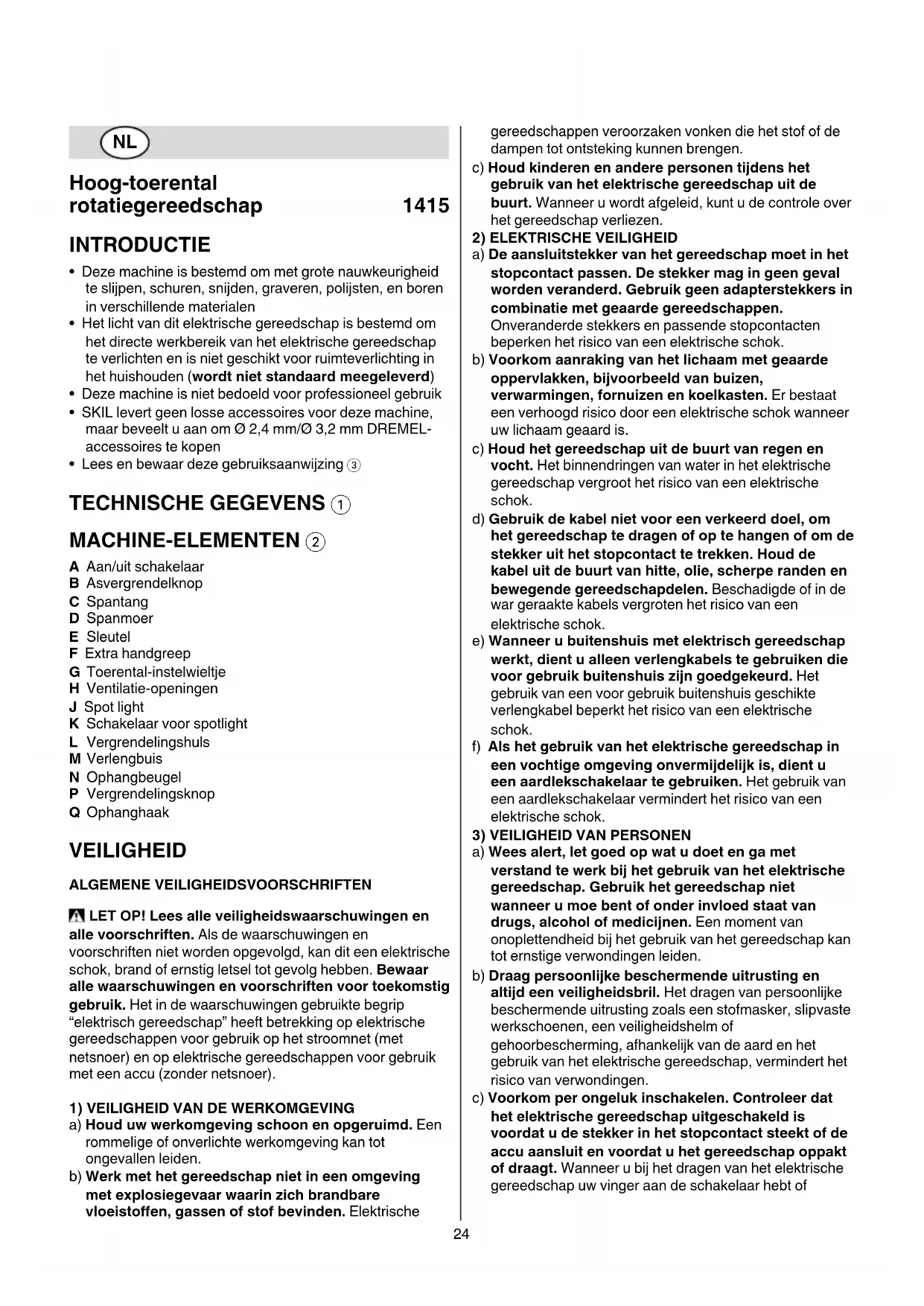- Lees en bewaar deze gebruiksaanwijzing 3 TECHNISCHE GEGEVENS 1 MACHINE-ELEMENTEN 2 A Aan/uit schakelaar B Asvergrendelknop C Spantang D Spanmoer E Sleutel F Extra handgreep G Toerental-instelwieltje H Ventilatie-openingen J Spot light K Schakelaar voor spotlight L Vergrendelingshuls M Verlengbuis N Ophangbeugel P Vergrendelingsknop Q Ophanghaak VEILIGHEID ALGEMENE VEILIGHEIDSVOORSCHRIFTEN LET OP! Lees alle veiligheidswaarschuwingen en alle voorschriften. Als de waarschuwingen en voorschriften niet worden opgevolgd, kan dit een elektrische schok, brand of ernstig letsel tot gevolg hebben. Bewaar alle waarschuwingen en voorschriften voor toekomstig gebruik. Het in de waarschuwingen gebruikte begrip “elektrisch gereedschap” heeft betrekking op elektrische gereedschappen voor gebruik op het stroomnet (met netsnoer) en op elektrische gereedschappen voor gebruik met een accu (zonder netsnoer).