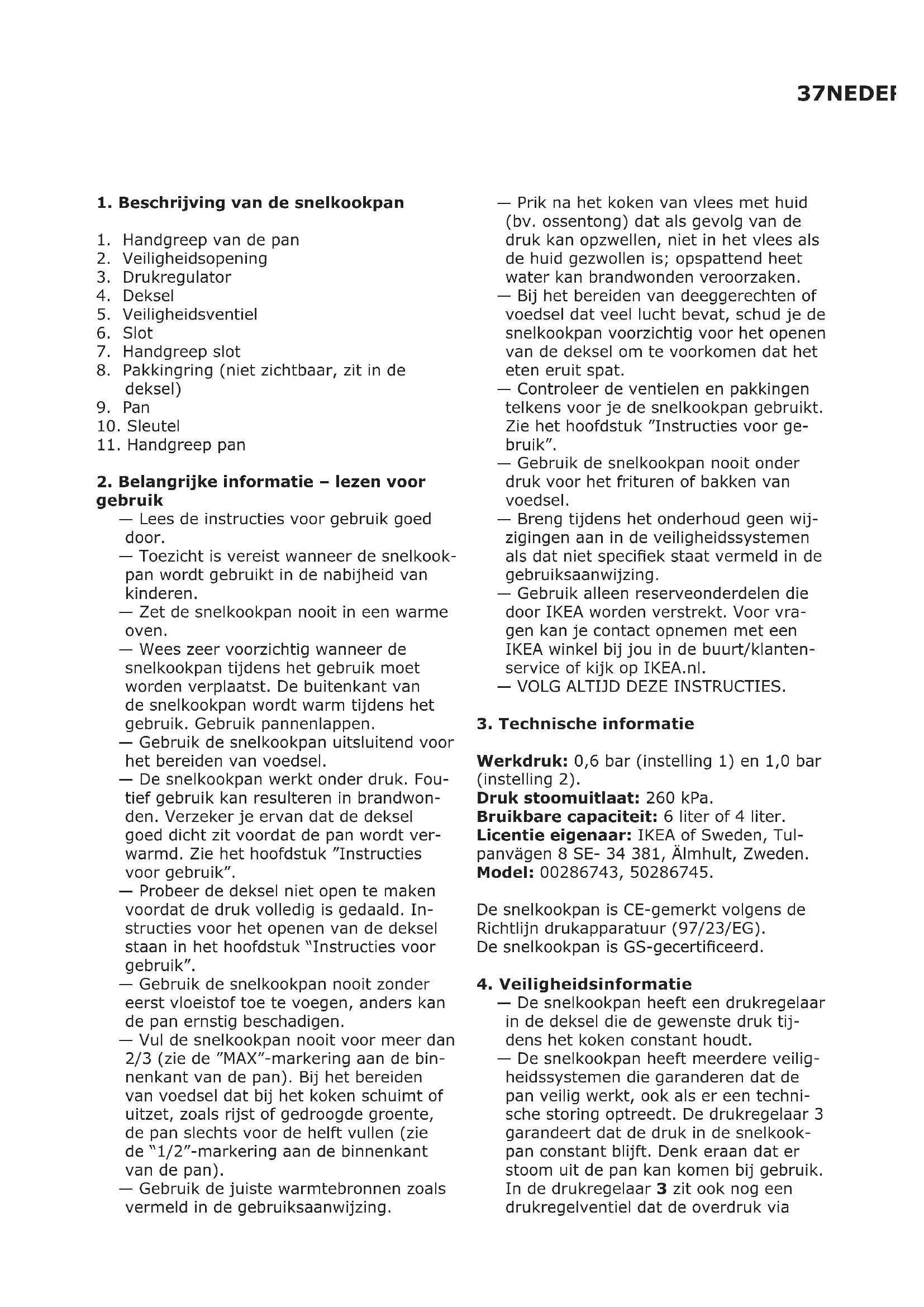 Werkdruk: 0,6 bar (instelling 1) en 1,0 bar (instelling 2). Druk stoomuitlaat: 260 kPa. Bruikbare capaciteit: 6 liter of 4 liter. Licentie eigenaar: IKEA of Sweden, Tul- panvägen 8 SE- 34 381, Älmhult, Zweden. Model: 00286743, 50286745. De snelkookpan is CE-gemerkt volgens de Richtlijn drukapparatuur (97/23/EG). De snelkookpan is GS-gecerticeerd.