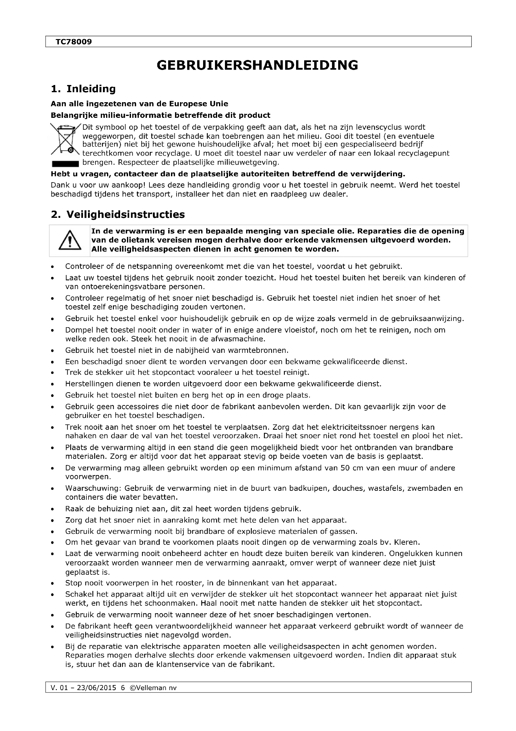 In de verwarming is er een bepaalde menging van speciale olie. Reparaties die de opening van de olietank vereisen moot derhalve door erkende vakmensen uitgevoerd worden. Alle veiligheidsaspecten dienen in acht genomen te worden.