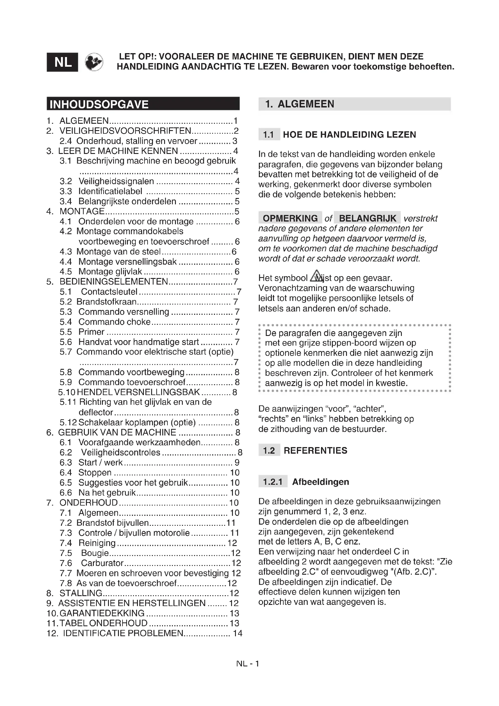 BELANGRIJK De veiligheidsnormen die tijdens het onderhoud in acht genomen moeten worden, zijn beschreven in par. 2.4. Alle controles en werkzaamheden voor onderhoud moeten uitgevoerd worden bij stilstaande machine, en met de motor uitgeschakeld. Verwijder de sleutel en lees de bijgeleverde instructies alvorens enige reinigings-, of onderhoudswerkzaamheden te verrichten.NL - 11 Draag geschikte kledij, handschoenen en bril vooraleer onderhoud uit te voeren.