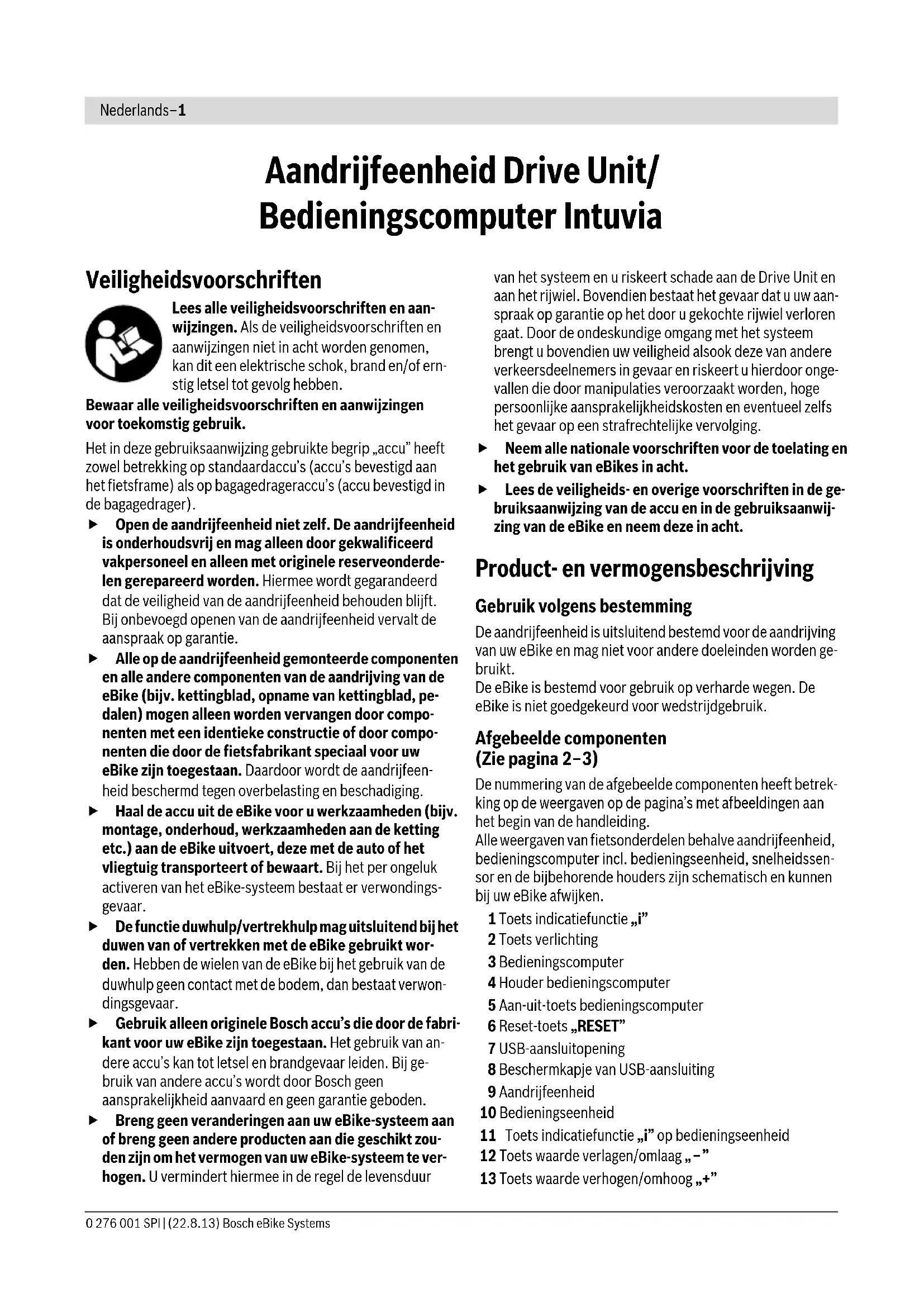 Lees de veiligheids- en overige voorschriften in de gebruiksaanwijzing van de accu, de gebruiksaanwijzing van aandrijfeenheid en bedieningscomputer en de gebruiksaanwijzing van de eBike en neem deze in acht.