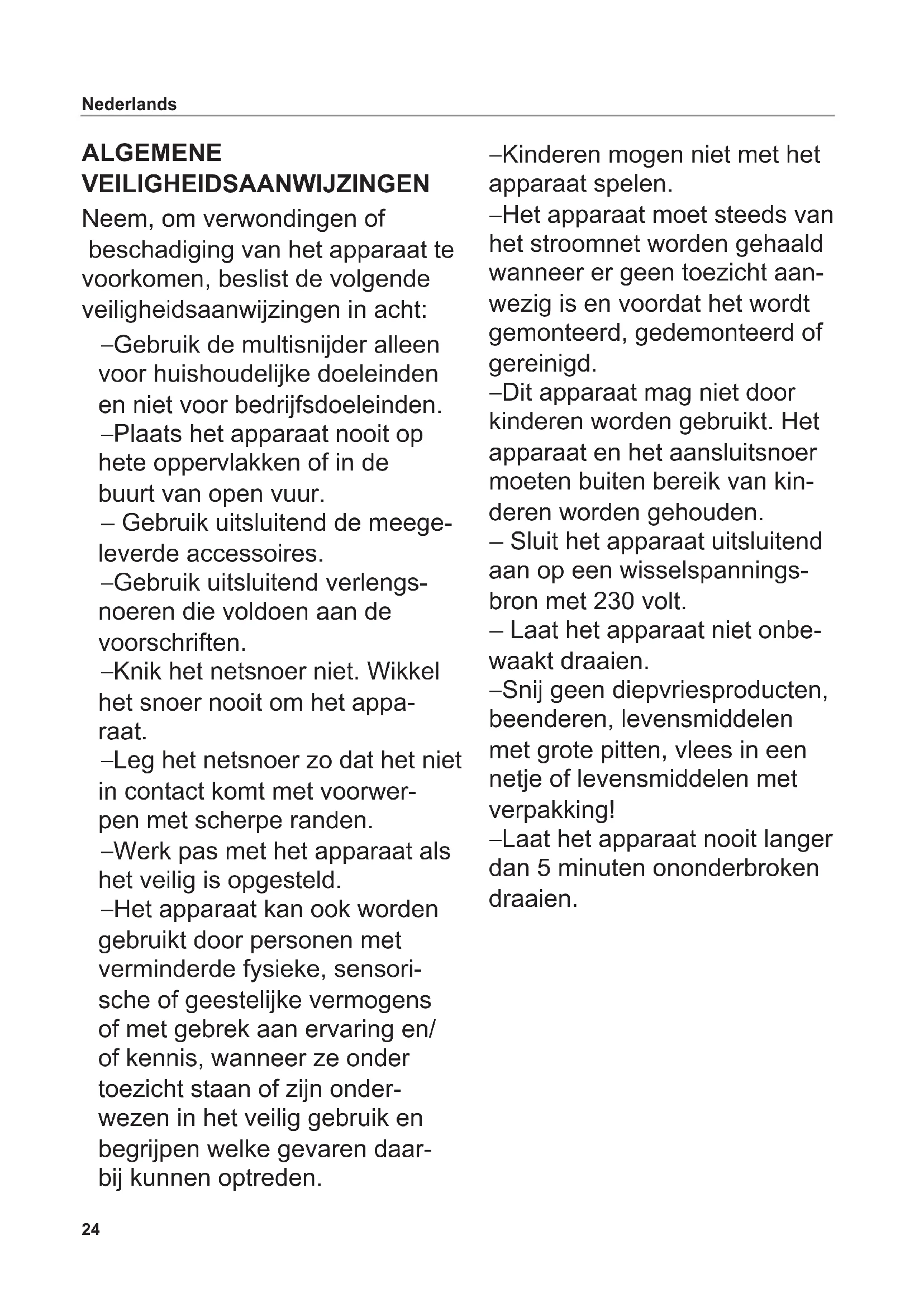 - Draai na elk gebruik de snij- dikteknop in de "0"-stand om het scherpe ronde mes af te dekken en verwondingen te voorkomen. Trek de opvangschaal voor de snijwaren (3) aan de rechterkant uit het apparaat. REINIGEN Voorzichtig: Voordat u gaat schoonmaken, dient u het apparaat uit te schakelen, de netstekker uit het stopcontact te halen en de snijdikteknop (2) in de "0"-stand te draaien. Reinig de multisnijder regelmatig om te voorkomen dat bederfelijke restanten vastkoeken. Ook het ronde mes moet voor het behoud van het roestvrije oppervlak re- gelmatig worden gereinigd zoals hierna is beschreven. Aanwijzing: Restanten van levensmiddelen kunnen na enige tijd het materiaal van het ronde mes aantasten en tot roestvorming leiden. Voorbereiding