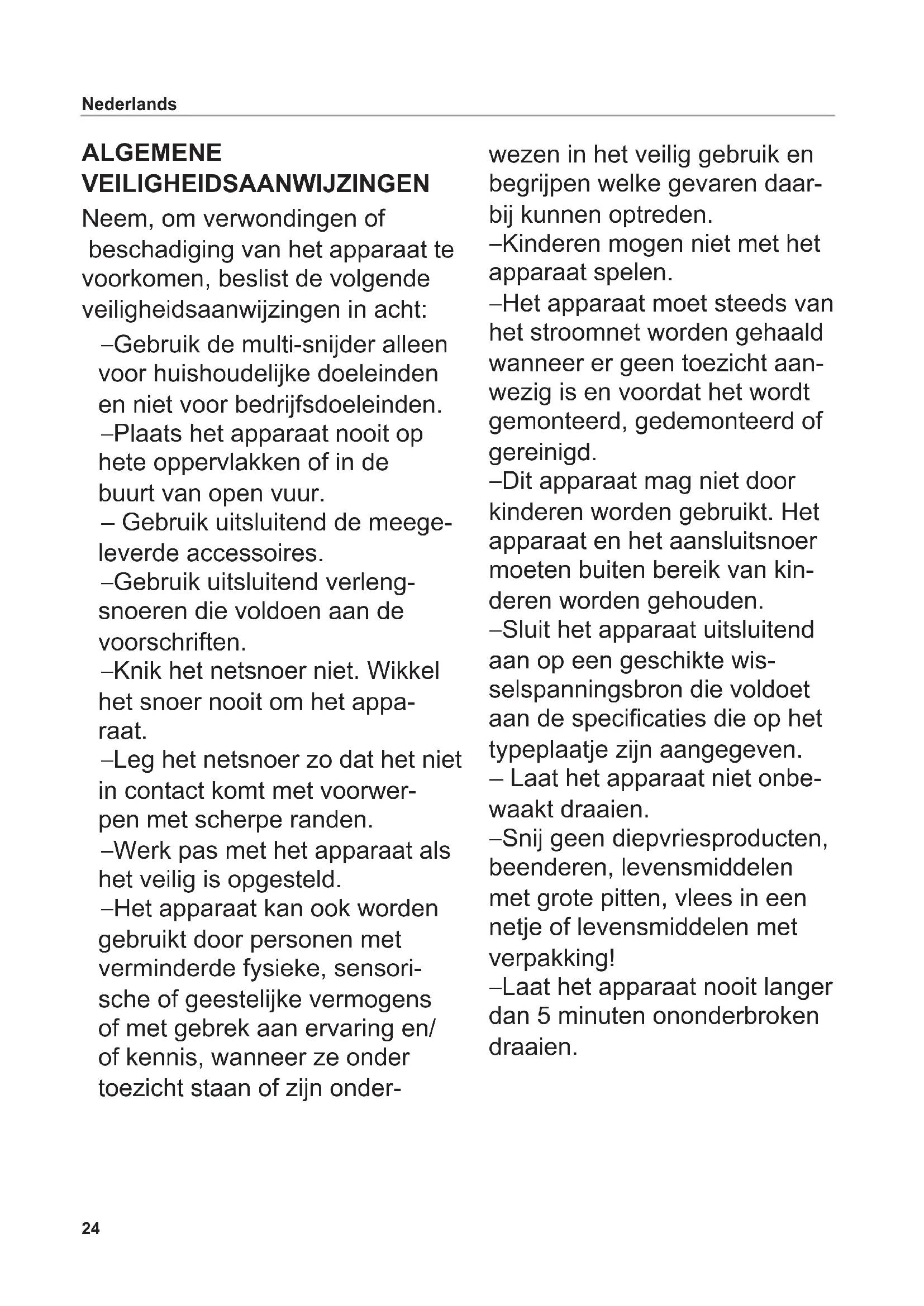- Vuelva a montar la cuchilla circular. MANTENIMIENTO La cortadora multiuso no precisa mantenimiento. Sin embargo, le recomendamos aplicar un poco de vaselina en la guía del carro para el producto para que la marcha sea más suave. ALMACENAMIENTO Mantenga el aparato fuera del alcance de los niños. Para recoger el cable, utilice siempre el compartimento del cable (8) integrado en el aparato. Español24 ALGEMENE VEILIGHEIDSAANWIJZINGEN Neem, om verwondingen of beschadiging van het apparaat te voorkomen, beslist de volgende veiligheidsaanwijzingen in acht: – Gebruik de multi-snijder alleen voor huishoudelijke doeleinden en niet voor bedrijfsdoeleinden. – Plaats het apparaat nooit op hete oppervlakken of in de buurt van open vuur. – Gebruik uitsluitend de meege- leverde accessoires. – Gebruik uitsluitend verleng- snoeren die voldoen aan de voorschriften. – Knik het netsnoer niet. Wikkel het snoer nooit om het appa- raat. – Leg het netsnoer zo dat het niet in contact komt met voorwer- pen met scherpe randen. – Werk pas met het apparaat als het veilig is opgesteld. – Het apparaat kan ook worden gebruikt door personen met verminderde fysieke, sensori- sche of geestelijke vermogens of met gebrek aan ervaring en/ of kennis, wanneer ze onder toezicht staan of zijn onder- wezen in het veilig gebruik en begrijpen welke gevaren daar- bij kunnen optreden. – Kinderen mogen niet met het apparaat spelen. – Het apparaat moet steeds van het stroomnet worden gehaald wanneer er geen toezicht aan- wezig is en voordat het wordt gemonteerd, gedemonteerd of gereinigd. – Dit apparaat mag niet door kinderen worden gebruikt. Het apparaat en het aansluitsnoer moeten buiten bereik van kin- deren worden gehouden. – Sluit het apparaat uitsluitend aan op een geschikte wis- selspanningsbron die voldoet aan de specicaties die op het typeplaatje zijn aangegeven. – Laat het apparaat niet onbe- waakt draaien. – Snij geen diepvriesproducten, beenderen, levensmiddelen met grote pitten, vlees in een netje of levensmiddelen met verpakking! – Laat het apparaat nooit langer dan 5 minuten ononderbroken draaien. Nederlands25 Gevaar voor een elektrische schok – Haal de netstekker altijd uit het stopcontact bij bedrijfsstorin- gen, vóór elke reiniging en als het apparaat niet in gebruik is. Trek daarbij aan de stekker en niet aan het snoer. – Dompel het apparaat nooit onder in water. Stel het appa- raat nooit bloot aan regen of ander vocht. Als het apparaat toch in het water is gevallen, haal dan eerst de netstekker uit het stopcontact en haal pas dan het apparaat uit het water. Laat het apparaat daarna door een bevoegde servicedienst con- troleren voordat u het weer in gebruik neemt. – Gebruik het apparaat niet met vochtige handen. Gebruik het niet als het vochtig of nat is of als u op een natte vloer staat. Gebruik het apparaat niet in de open lucht. – Stel het apparaat bij bescha- diging van onderdelen onmid- dellijk buiten werking. Stuur het complete apparaat op naar de ritter-klantenservice. – Als het netsnoer wordt bescha- digd, moet dit door de fabrikant, zijn klantenservice of anders- zins gekwaliceerde personen worden vervangen om gevaar- lijke situaties te voorkomen. Verwondingsgevaar – Dit apparaat mag niet worden gebruikt zonder snijwaren- slede of restenhouder, tenzij de grootte of vorm van het te snij- den voedsel het gebruik ervan niet toelaat. – Voordat u accessoires of extra onderdelen die tijdens het gebruik bewegen, vervangt, dient u het apparaat uit te schakelen en van het lichtnet te halen. – Het ronde mes is zeer scherp. – Raak bij werking van het apparaat het ronde mes in geen geval aan! – Voordat u gaat schoonmaken, dient u het apparaat uit te schakelen, de netstekker uit het stopcontact te halen en de snijdikteknop in de "0"-stand te draaien. – Het ronde mes staat na uit- schakeling niet onmiddellijk stil. Nederlands26 Vouw de tekeningen aan de binnenzijde van de voor- en achterkaft van de gebruiksaanwij- zing open. Lees de gebruiksaanwijzing vóór ingebruikneming van het apparaat zorgvuldig door. Bewaar de gebruiksaanwijzing en geef deze mee als het apparaat van eigenaar verandert. Daarnaast is deze gebruiksaan- wijzing ook beschikbaar onder www.ritterwerk.de. BEOOGD GEBRUIK De multi-snijder dient voor het snijden van levensmiddelen voor huishoudelijk gebruik. Niet-beoogd gebruik of onjuiste bediening kan leiden tot ernstige verwondingen of beschadiging van het apparaat. Hierbij verval- len alle rechten op garantie en aansprakelijkheid. INGEBRUIKNEMING Voorbereiding Haal het apparaat voorzichtig uit de verpakking. Verwijder alle ver- pakkingsonderdelen en bewaar deze samen met de verpakking. Maak het apparaat schoon voor- dat het in aanraking komt met levensmiddelen (zie REINIGEN). Apparaat plaatsen