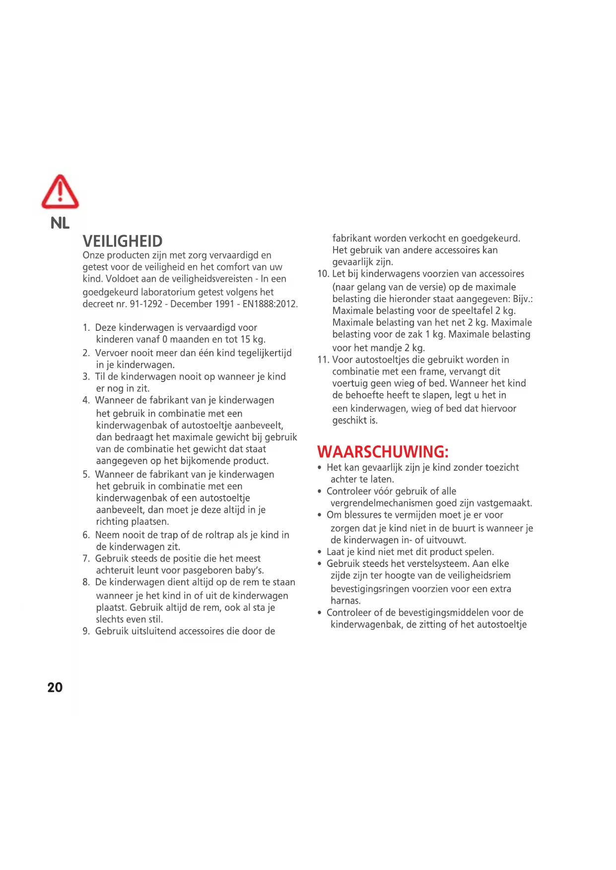 - Controleer of de bevestigingsmiddelen voor de kinderwagenbak, de zitting of het autostoeltje NL21 correct geplaatst zijn vóór je de kinderwagen gebruikt.