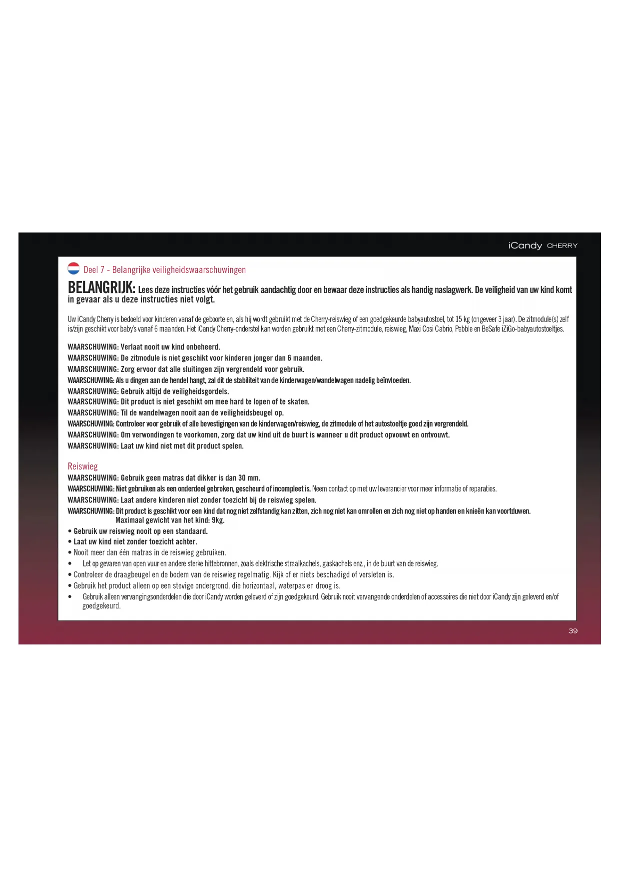 HERRY Deel 7 - Belangrijke veiligheidswaarschuwingen BELANGRIJK: Lees deze instructies vóór het gebruik aandachtig door en bewaar deze instructies als handig naslagwerk. De veiligheid van uw kind komt in gevaar als u deze instructies niet volgt. Uw iCandy Cherry is bedoeld voor kinderen vanaf de geboorte en, als hij wordt gebruikt met de Cherry-reiswieg of een goedgekeurde babyautostoel, tot 15 kg (ongeveer 3 jaar). De zitmodule(s) zelf is/zijn geschikt voor baby’s vanaf 6 maanden. Het iCandy Cherry-onderstel kan worden gebruikt met een Cherry-zitmodule, reiswieg, Maxi Cosi Cabrio, Pebble en BeSafe iZiGo-babyautostoeltjes. WAARSCHUWING: Verlaat nooit uw kind onbeheerd. WAARSCHUWING: De zitmodule is niet geschikt voor kinderen jonger dan 6 maanden. WAARSCHUWING: Zorg ervoor dat alle sluitingen zijn vergrendeld voor gebruik. WAARSCHUWING: Als u dingen aan de hendel hangt, zal dit de stabiliteit van de kinderwagen/wandelwagen nadelig beïnvloeden. WAARSCHUWING: Gebruik altijd de veiligheidsgordels. WAARSCHUWING: Dit product is niet geschikt om mee hard te lopen of te skaten. WAARSCHUWING: Til de wandelwagen nooit aan de veiligheidsbeugel op. WAARSCHUWING: Controleer voor gebruik of alle bevestigingen van de kinderwagen/reiswieg, de zitmodule of het autostoeltje goed zijn vergrendeld. WAARSCHUWING: Om verwondingen te voorkomen, zorg dat uw kind uit de buurt is wanneer u dit product opvouwt en ontvouwt. WAARSCHUWING: Laat uw kind niet met dit product spelen. Reiswieg WAARSCHUWING: Gebruik geen matras dat dikker is dan 30 mm. WAARSCHUWING: Niet gebruiken als een onderdeel gebroken, gescheurd of incompleet is. Neem contact op met uw leverancier voor meer informatie of reparaties. WAARSCHUWING: Laat andere kinderen niet zonder toezicht bij de reiswieg spelen. WAARSCHUWING: Dit product is geschikt voor een kind dat nog niet zelfstandig kan zitten, zich nog niet kan omrollen en zich nog niet op handen en knieën kan voortduwen. Maximaal gewicht van het kind: 9kg.