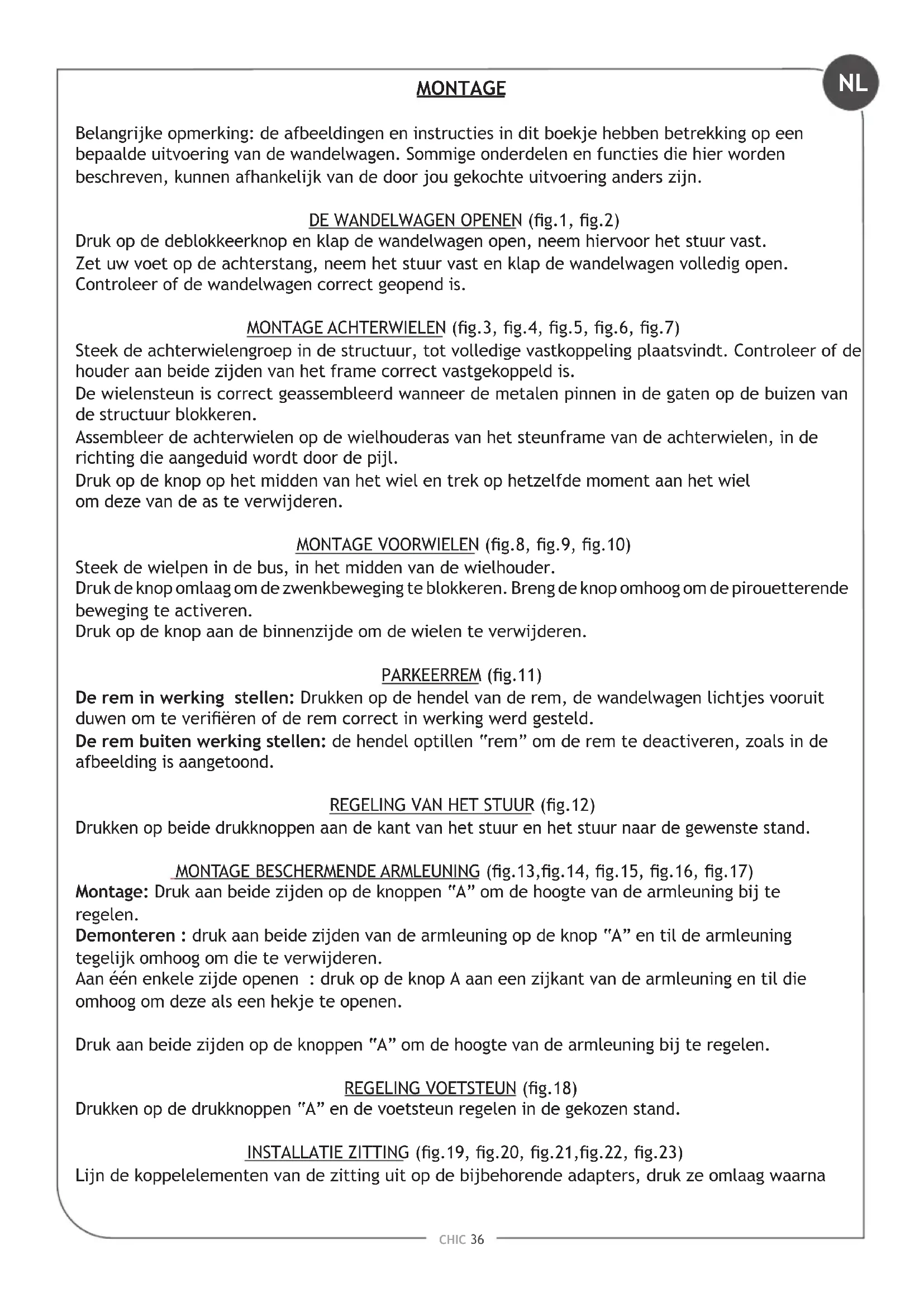 Belangrijke opmerking: de afbeeldingen en instructies in dit boekje hebben betrekking op een bepaalde uitvoering van de wandelwagen. Sommige onderdelen en functies die hier worden beschreven, kunnen afhankelijk van de door jou gekochte uitvoering anders zijn. DE WANDELWAGEN OPENEN (g.1, g.2) Druk op de deblokkeerknop en klap de wandelwagen open, neem hiervoor het stuur vast. Zet uw voet op de achterstang, neem het stuur vast en klap de wandelwagen volledig open. Controleer of de wandelwagen correct geopend is. MONTAGE ACHTERWIELEN (g.3, g.4, g.5, g.6, g.7) Steek de achterwielengroep in de structuur, tot volledige vastkoppeling plaatsvindt. Controleer of de houder aan beide zijden van het frame correct vastgekoppeld is. De wielensteun is correct geassembleerd wanneer de metalen pinnen in de gaten op de buizen van de structuur blokkeren. Assembleer de achterwielen op de wielhouderas van het steunframe van de achterwielen, in de richting die aangeduid wordt door de pijl. Druk op de knop op het midden van het wiel en trek op hetzelfde moment aan het wiel om deze van de as te verwijderen. MONTAGE VOORWIELEN (g.8, g.9, g.10) Steek de wielpen in de bus, in het midden van de wielhouder. Druk de knop omlaag om de zwenkbeweging te blokkeren. Breng de knop omhoog om de pirouetterende beweging te activeren. Druk op de knop aan de binnenzijde om de wielen te verwijderen. PARKEERREM (g.11) De rem in werking stellen: Drukken op de hendel van de rem, de wandelwagen lichtjes vooruit duwen om te veriëren of de rem correct in werking werd gesteld. De rem buiten werking stellen: de hendel optillen “rem” om de rem te deactiveren, zoals in de afbeelding is aangetoond. REGELING VAN HET STUUR (g.12) Drukken op beide drukknoppen aan de kant van het stuur en het stuur naar de gewenste stand. MONTAGE BESCHERMENDE ARMLEUNING (g.13,g.14, g.15, g.16, g.17) Montage: Druk aan beide zijden op de knoppen “A” om de hoogte van de armleuning bij te regelen. Demonteren : druk aan beide zijden van de armleuning op de knop “A” en til de armleuning tegelijk omhoog om die te verwijderen. Aan één enkele zijde openen : druk op de knop A aan een zijkant van de armleuning en til die omhoog om deze als een hekje te openen. Druk aan beide zijden op de knoppen “A” om de hoogte van de armleuning bij te regelen. REGELING VOETSTEUN (g.18) Drukken op de drukknoppen “A” en de voetsteun regelen in de gekozen stand. INSTALLATIE ZITTING (g.19, g.20, g.21,g.22, g.23) Lijn de koppelelementen van de zitting uit op de bijbehorende adapters, druk ze omlaag waarna