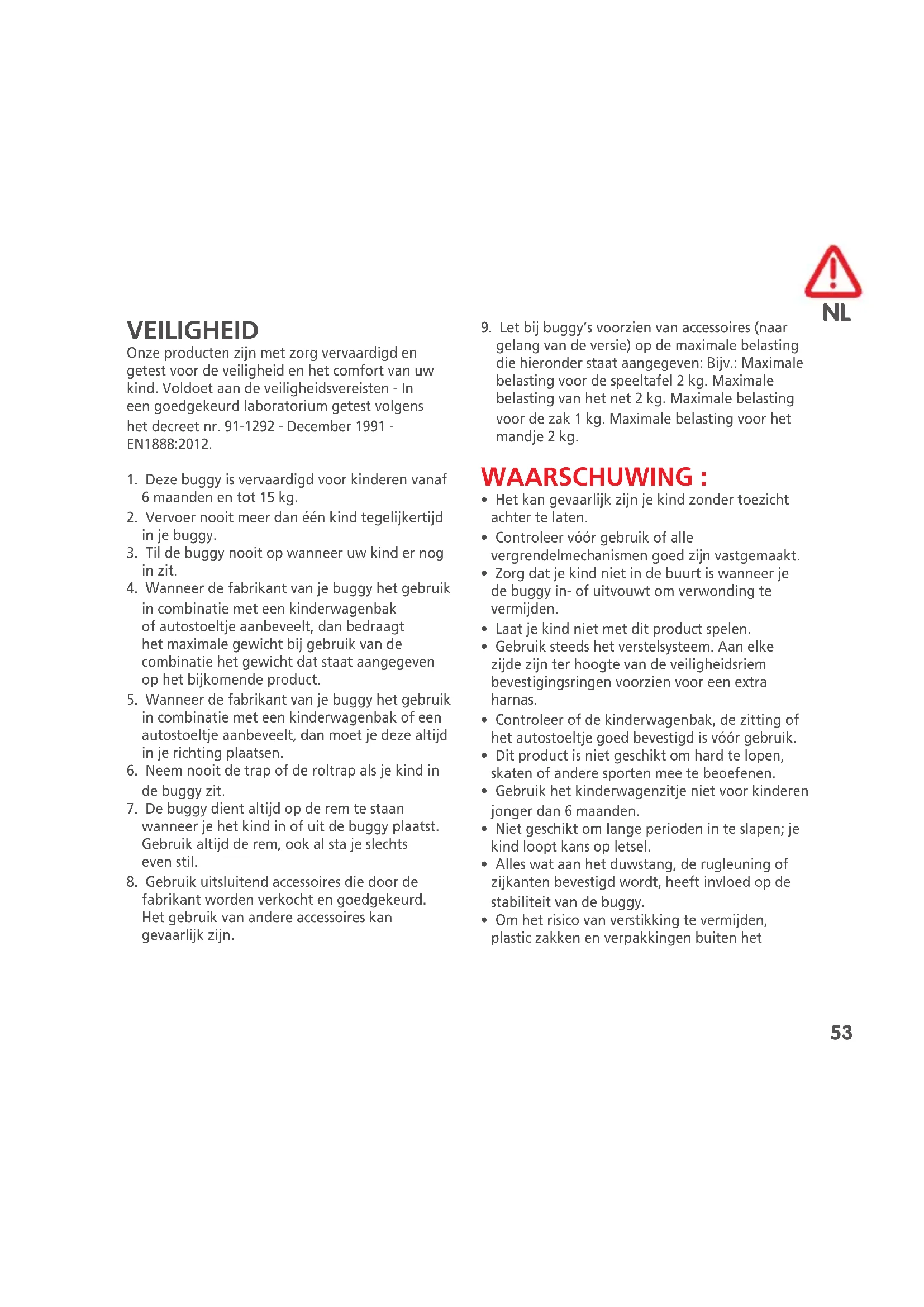 VEILIGHEID Onze producten zijn met zorg vervaardigd en getest voor de veiligheid en het comfort van uw kind. Voldoet aan de veiligheidsvereisten - In een goedgekeurd laboratorium getest volgens het decreet nr. 91-1292 - December 1991 - EN1888:2012.