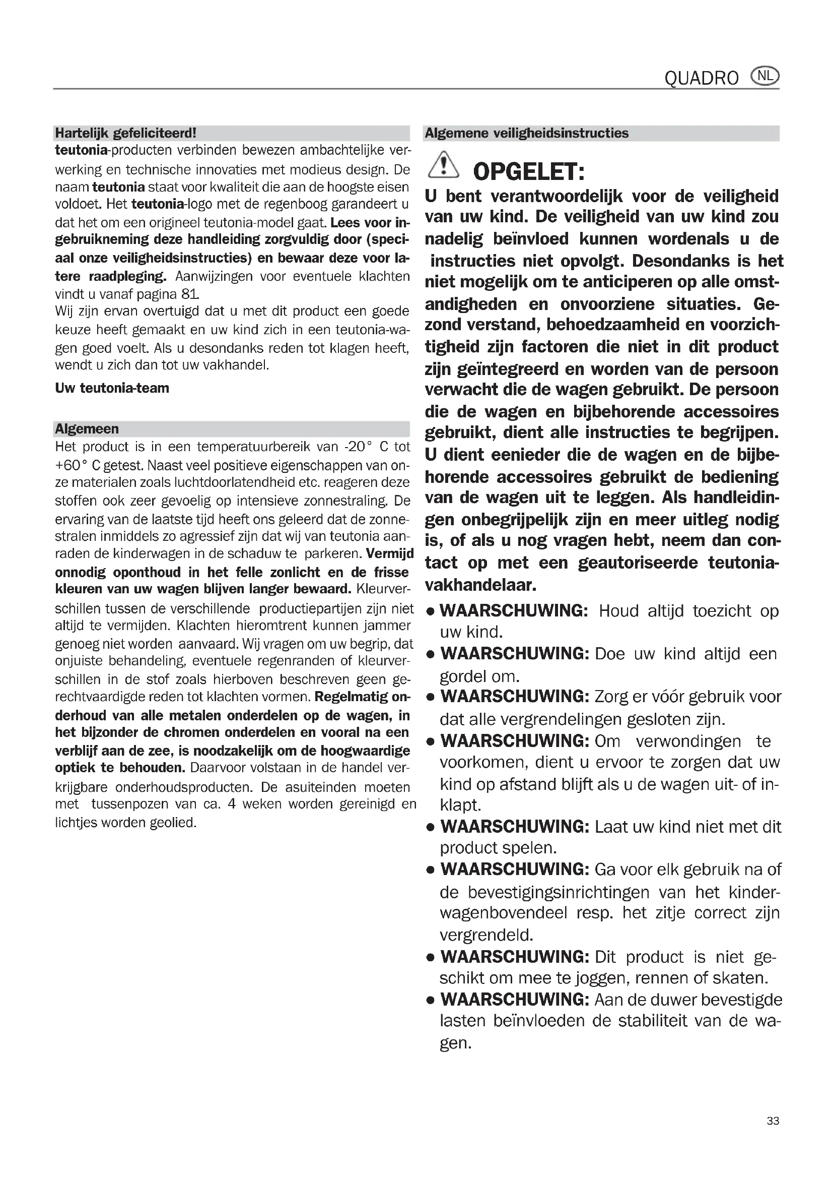 Hartelijk teutonia werking naam teu voldoet. dat het o gebruikn aal onze tere raa vindt u va Wij zijn e keuze he gen goed wendt u Uw teut Algemee Het prod +60° C g ze mater stoffen o ervaring stralen in raden de onnodig kleuren schillen t altijd te genoeg n onjuiste schillen rechtvaa derhoud het bijzo verblijf a optiek t krijgbare met tuss lichtjes w Quadro_in_mistral_s_08_in.qxd 12.10.11 13:38 Seite 32QUADRO Algemene veiligheidsinstructies OPGELET: U bent verantwoordelijk voor de veiligheid van uw kind. De veiligheid van uw kind zou nadelig beïnvloed kunnen wordenals u de instructies niet opvolgt. Desondanks is het niet mogelijk om te anticiperen op alle omst- andigheden en onvoorziene situaties. Ge- zond verstand, behoedzaamheid en voorzich- tigheid zijn factoren die niet in dit product zijn geïntegreerd en worden van de persoon verwacht die de wagen gebruikt. De persoon die de wagen en bijbehorende accessoires gebruikt, dient alle instructies te begrijpen. U dient eenieder die de wagen en de bijbe- horende accessoires gebruikt de bediening van de wagen uit te leggen. Als handleidin- gen onbegrijpelijk zijn en meer uitleg nodig is, of als u nog vragen hebt, neem dan con- tact op met een geautoriseerde teutonia- vakhandelaar. ● WAARSCHUWING: Houd altijd toezicht op uw kind. ● WAARSCHUWING: Doe uw kind altijd een gordel om. ● WAARSCHUWING: Zorg er vóór gebruik voor dat alle vergrendelingen gesloten zijn. ● WAARSCHUWING: Om verwondingen te voorkomen, dient u ervoor te zorgen dat uw kind op afstand blijft als u de wagen uit- of in- klapt. ● WAARSCHUWING: Laat uw kind niet met dit product spelen. ● WAARSCHUWING: Ga voor elk gebruik na of de bevestigingsinrichtingen van het kinder- wagenbovendeel resp. het zitje correct zijn vergrendeld. ● WAARSCHUWING: Dit product is niet ge- schikt om mee te joggen, rennen of skaten. ● WAARSCHUWING: Aan de duwer bevestigde lasten beïnvloeden de stabiliteit van de wa- gen.