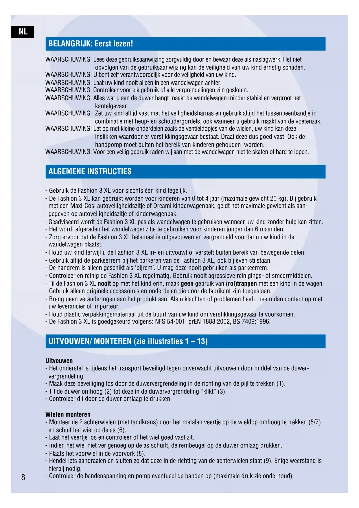 BELANGRIJK: Eerst lezen! WAARSCHUWING: Lees deze gebruiksaanwijzing zorgvuldig door en bewaar deze als naslagwerk. Het niet opvolgen van de gebruiksaanwijzing kan de veiligheid van uw kind ernstig schaden. WAARSCHUWING: U bent zelf verantwoordelijk voor de veiligheid van uw kind. WAARSCHUWING: Laat uw kind nooit alleen in een wandelwagen achter. WAARSCHUWING: Controleer voor elk gebruik of alle vergrendelingen zijn gesloten. WAARSCHUWING: Alles wat u aan de duwer hangt maakt de wandelwagen minder stabiel en vergroot het kantelgevaar. WAARSCHUWING: Zet uw kind altijd vast met het veiligheidsharnas en gebruik altijd het tussenbeenbandje in combinatie met heup- en schoudergordels, ook wanneer u gebruik maakt van de voetenzak. WAARSCHUWING: Let op met kleine onderdelen zoals de ventieldopjes van de wielen, uw kind kan deze inslikken waardoor er verstikkingsgevaar bestaat. Draai deze dus goed vast. Ook de handpomp moet buiten het bereik van kinderen gehouden worden. WAARSCHUWING: Voor een veilig gebruik raden wij aan met de wandelwagen niet te skaten of hard te lopen. ALGEMENE INSTRUCTIES - Gebruik de Fashion 3 XL voor slechts één kind tegelijk. - De Fashion 3 XL kan gebruikt worden voor kinderen van 0 tot 4 jaar (maximale gewicht 20 kg). Bij gebruik met een Maxi-Cosi autoveiligheidszitje of Dreami kinderwagenbak, geldt het maximale gewicht als aan- gegeven op autoveiligheidszitje of kinderwagenbak.