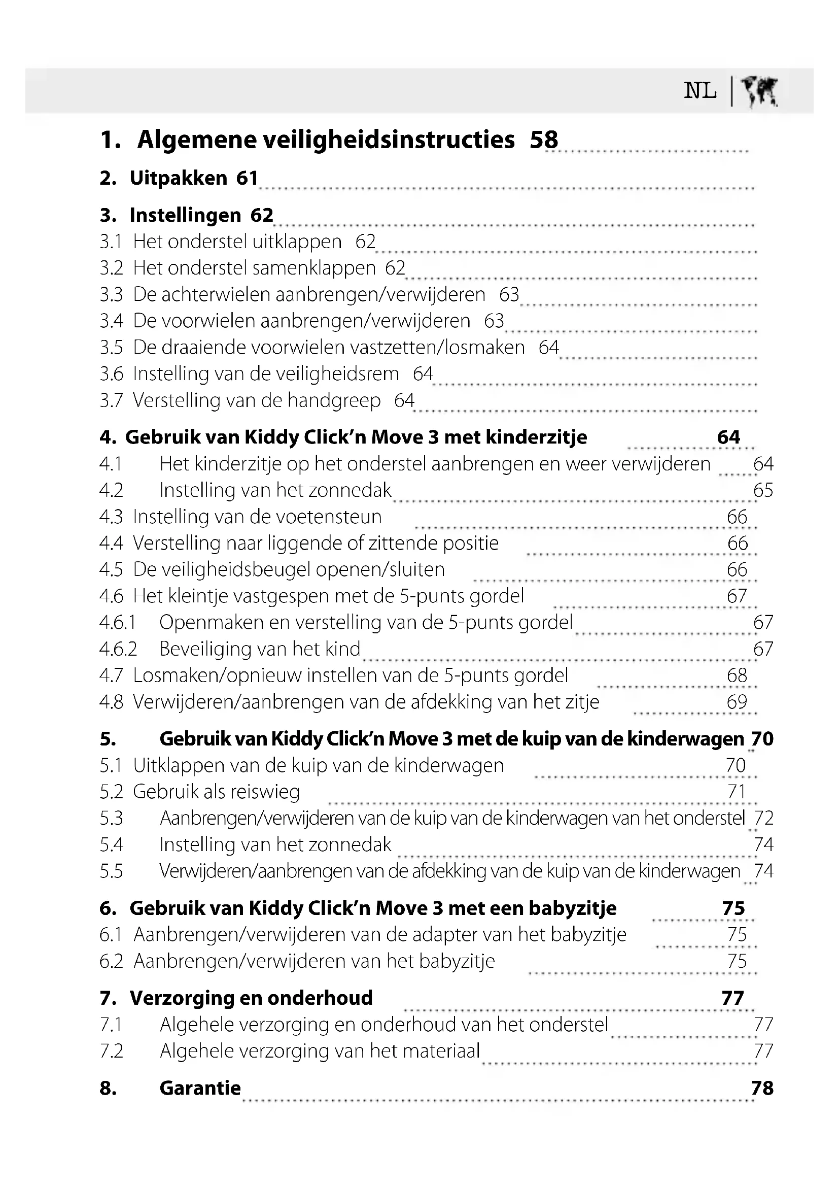 WAARSCHUWING Controleer voor gebruik of de kuip van de kin- derwagen of het zitje correct is aangebracht. WAARSCHUWING Dit product is niet geschikt om hard te lopen of te skaten. WAARSCHUWING Belast de mand, de tas van het kinderzitje en de bekerhouder niet te zwaar. Het maximum ge- wicht in de mand is 5 kg, in de tas van het kin- derzitje 0,5 kg en in de bekerhouder 0,5 kg. Een zware belasting kan de stabiliteit van de wan- delwagen bedreigen! WAARSCHUWING Elke belasting die aan de handgreep en/of de achterkant van de rugleuning en/of de zijkanten wordt bevestigd, heeft uitwerking op de stabi- liteit van de wandelwagen. WAARSCHUWING Gebruik de wandelwagen niet voor meer dan één kind tegelijk. WAARSCHUWING Maak alleen gebruik van accessoires en reserve- onderdelen die zijn goedgekeurd door Kiddy. 60NL