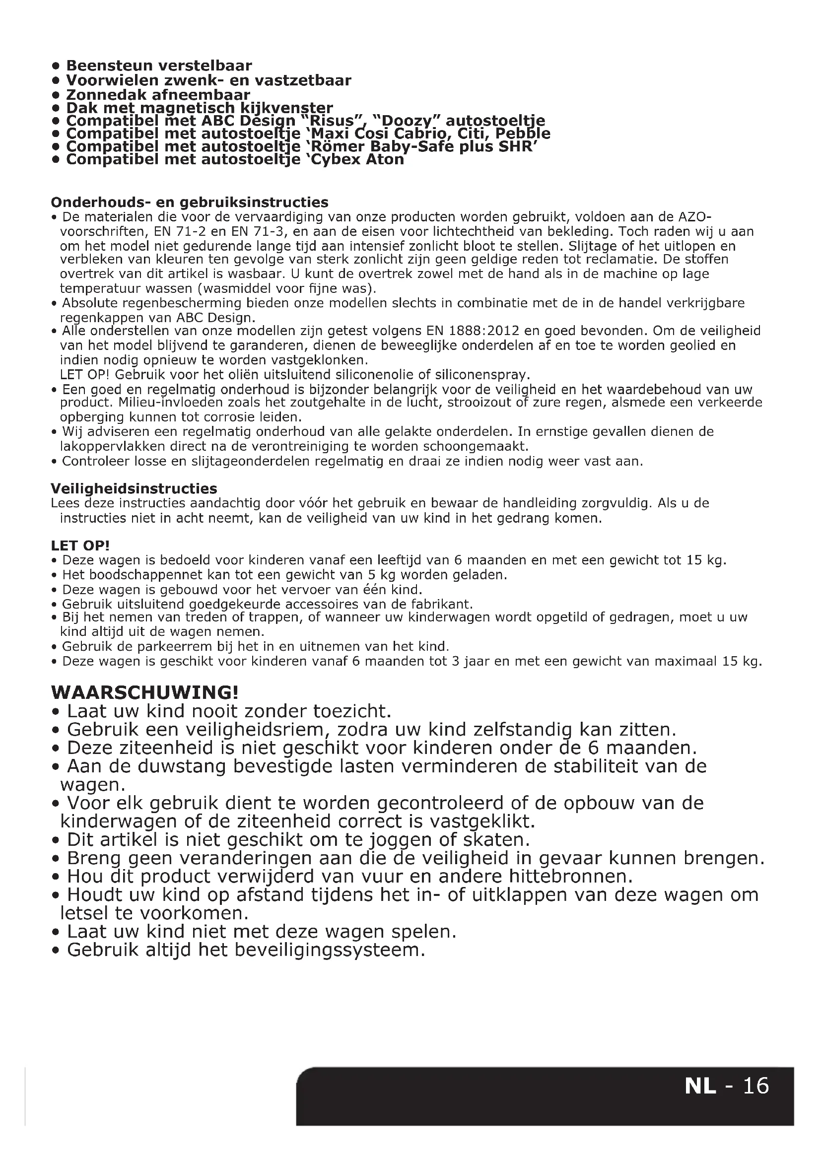 - Controleer losse en slijtageonderdelen regelmatig en draai ze indien nodig weer vast aan. Veiligheidsinstructies Lees deze instructies aandachtig door vóór het gebruik en bewaar de handleiding zorgvuldig. Als u de instructies niet in acht neemt, kan de veiligheid van uw kind in het gedrang komen. LET OP!