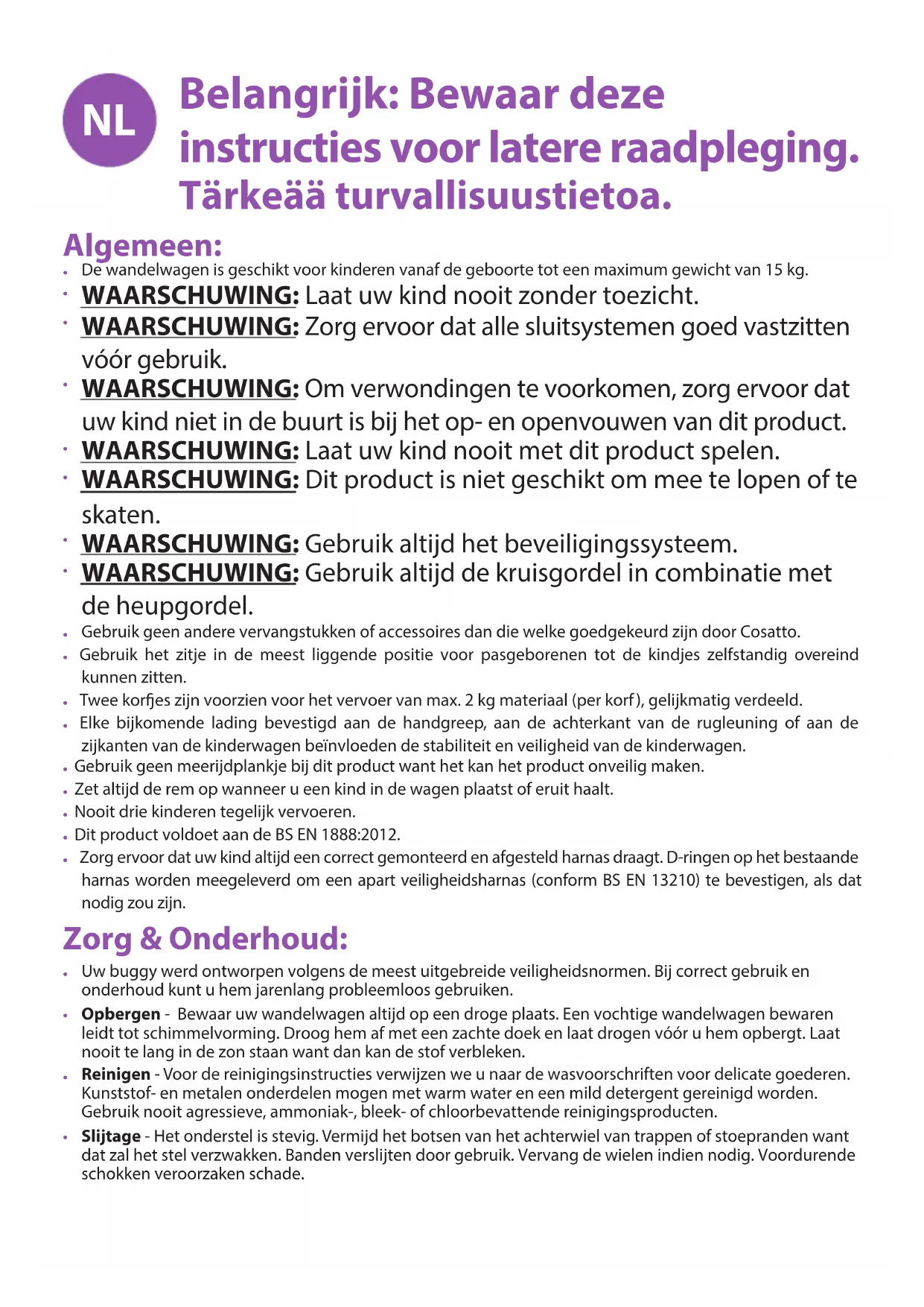 Uw buggy werd ontworpen volgens de meest uitgebreide veiligheidsnormen. Bij correct gebruik en onderhoud kunt u hem jarenlang probleemloos gebruiken.
