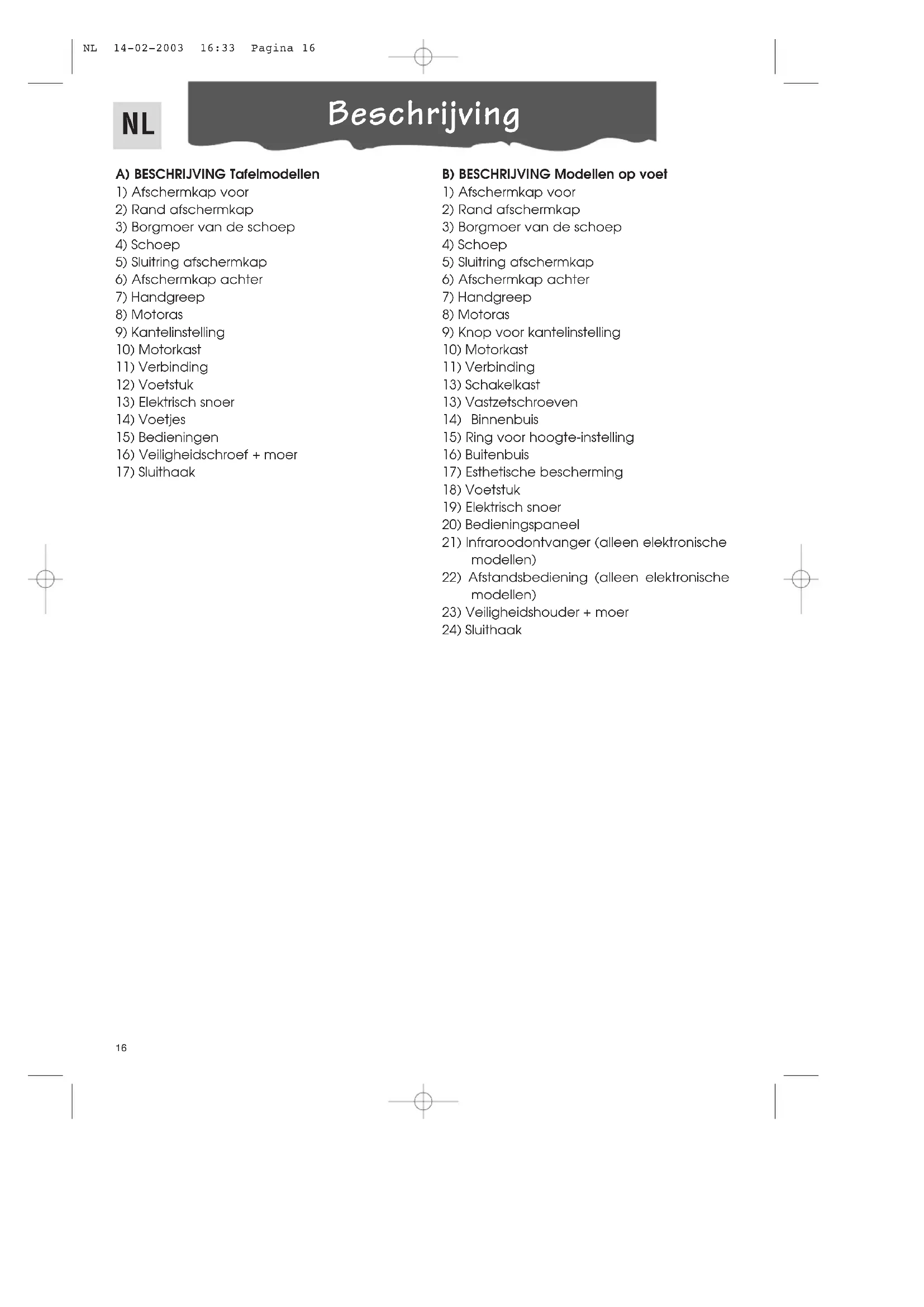 - Gebruik geen schoonmaakproducten, schurende producten of solventen. NL 14-02-2003 16:33 Pagina 18